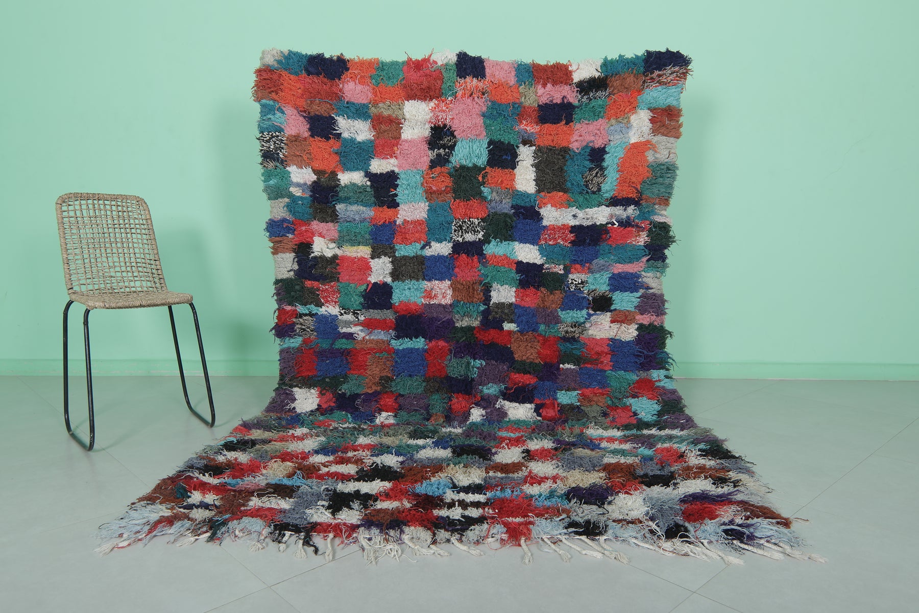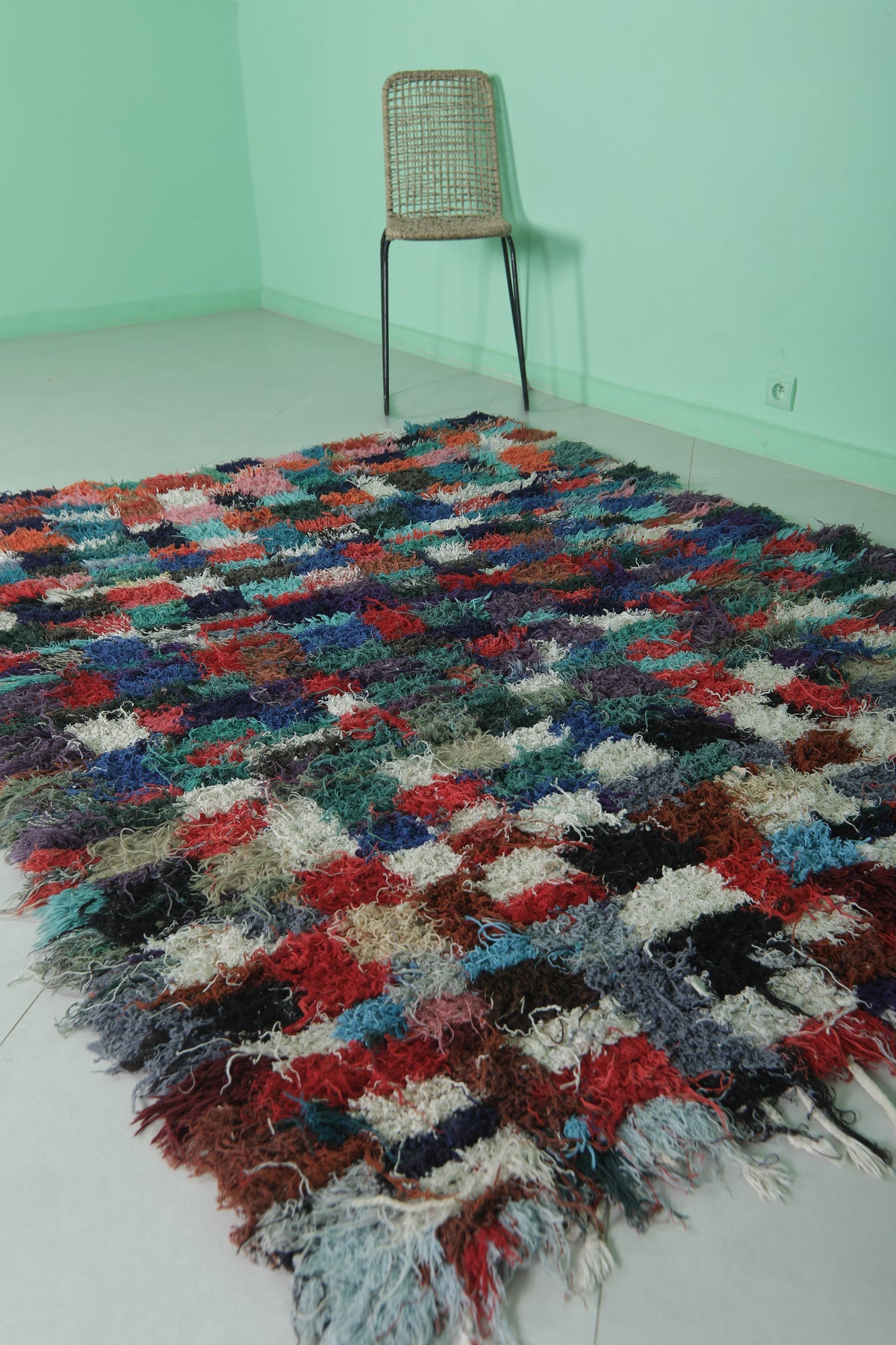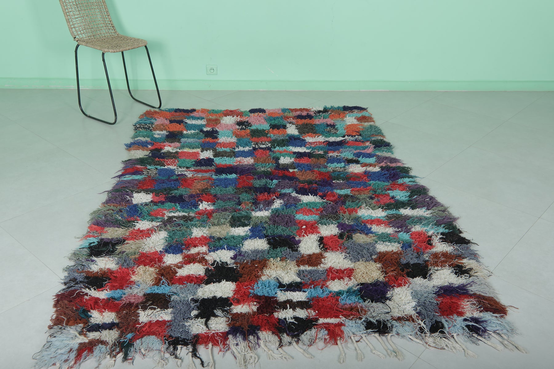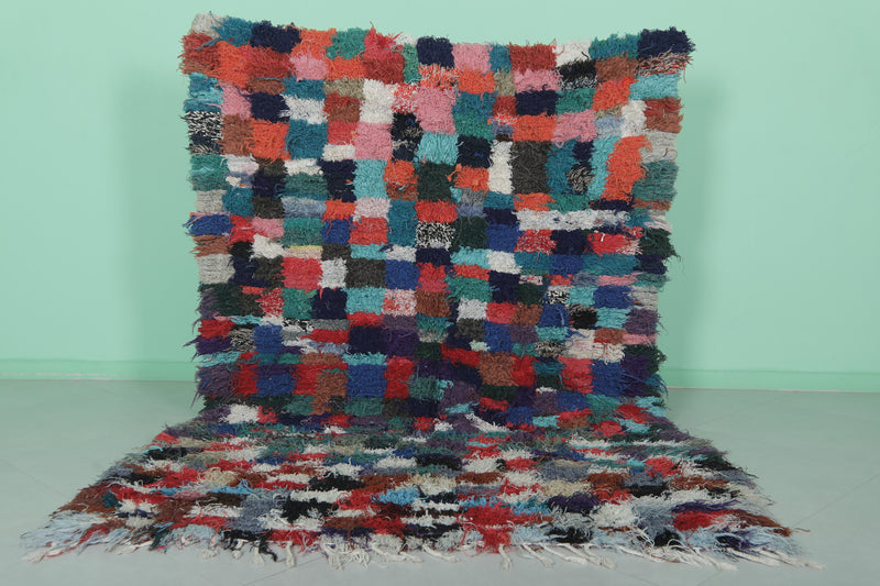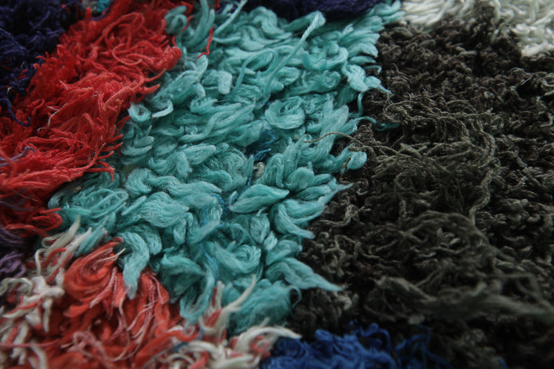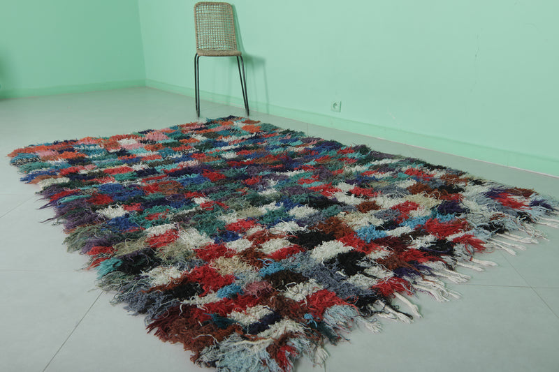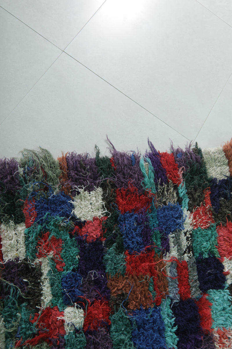 Transform your space with this shaggy handmade Moroccan rug, measuring 5.1 x 7.2 ft. Featuring a vibrant patchwork of colorful squares in hues of red, blue, green, and pink, this rug adds a playful yet cozy touch to your home. Its soft texture and high-pile design provide comfort and warmth, making it ideal for living rooms, bedrooms, or lounge areas. Handcrafted by skilled artisans, this one-of-a-kind piece brings authentic Moroccan charm and quality craftsmanship to your decor.