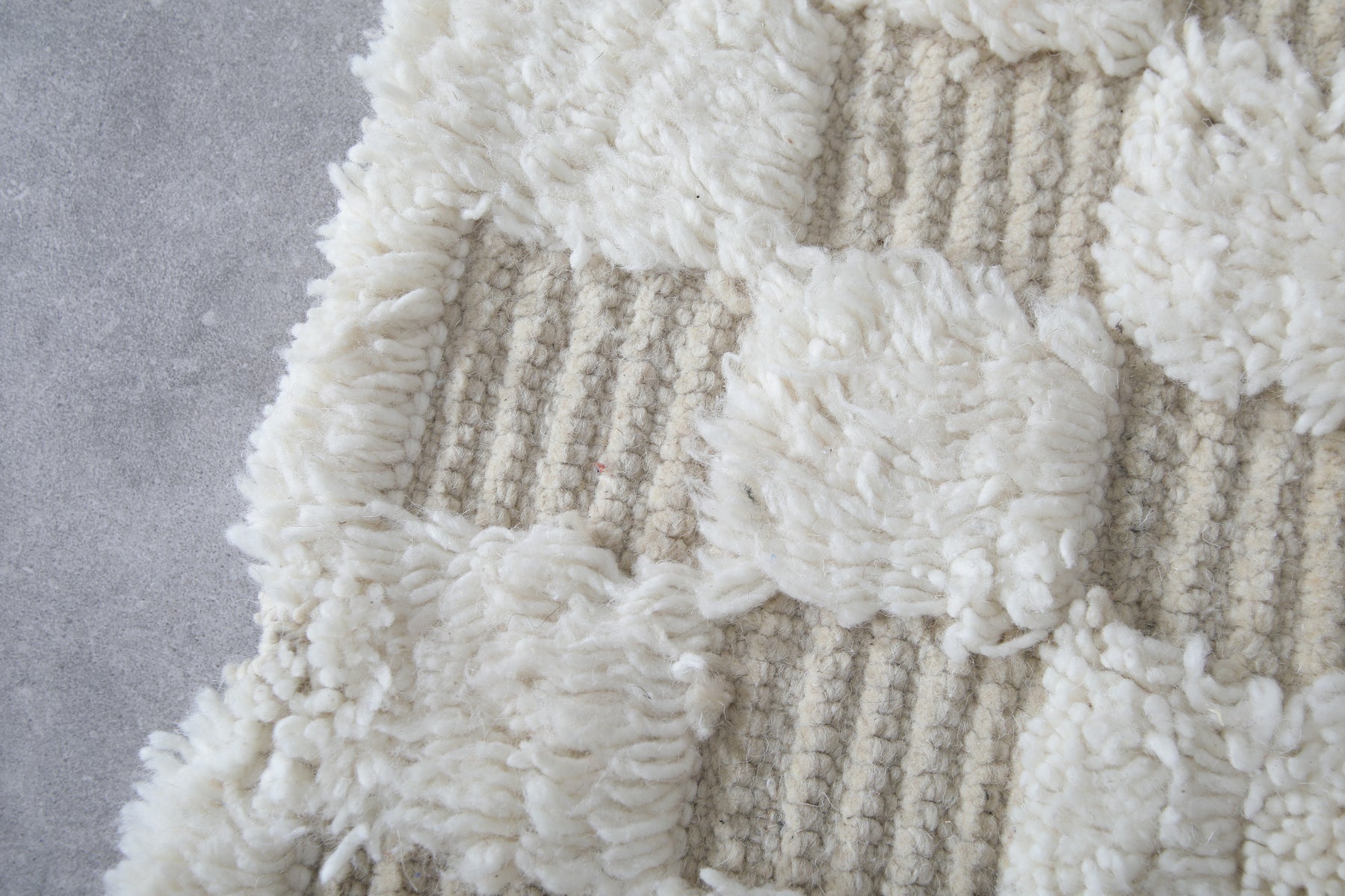 Add charm to your space with this checkered small Moroccan rug, measuring 2 x 3.3 feet (61 CM x 101 CM). Featuring a beautiful ivory and beige checkered pattern, this handwoven wool rug is crafted by skilled Moroccan artisans. Its compact size is perfect for entryways, bedside areas, or as an accent piece in your living room. The soft and plush texture offers both comfort and style, while the timeless checkered design complements various decor themes. Bring warmth and authenticity to your home with this exquisite handmade rug.