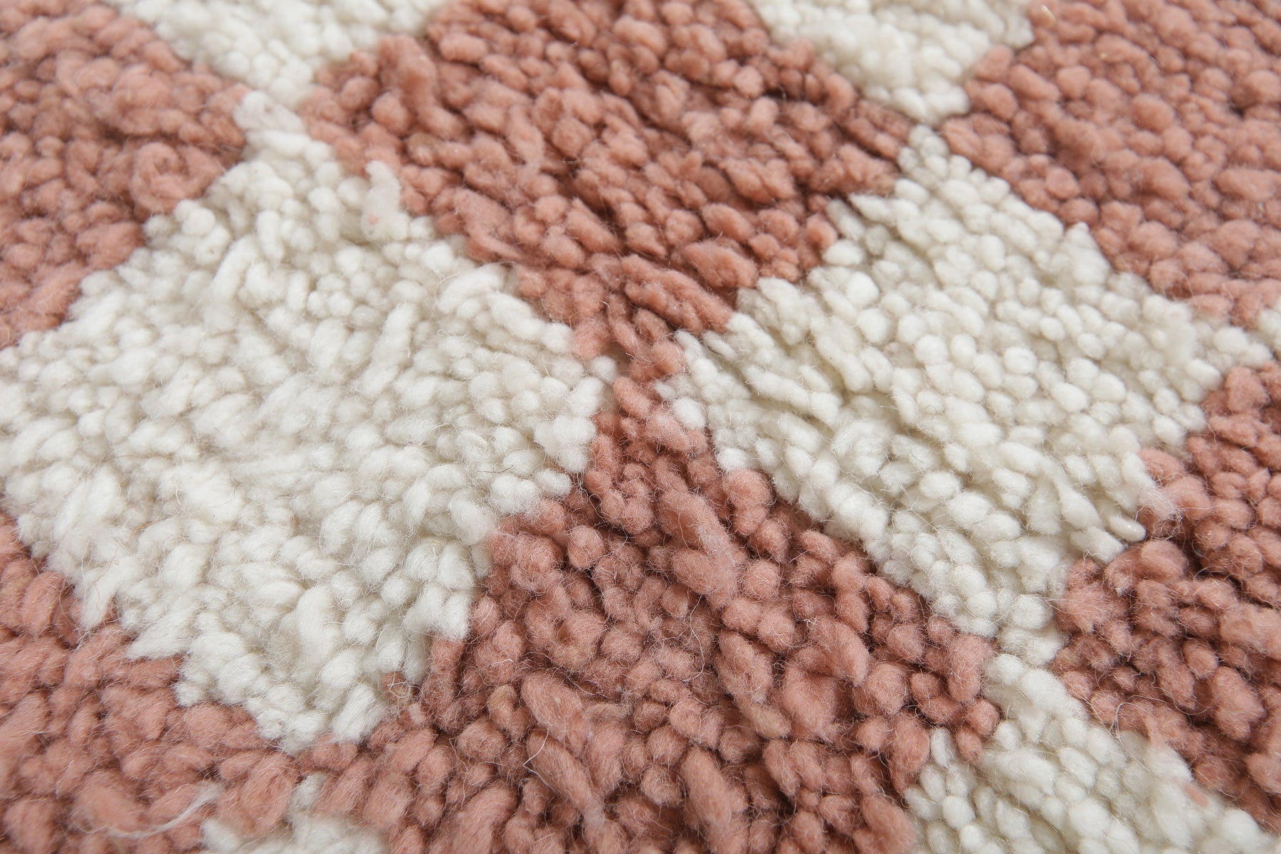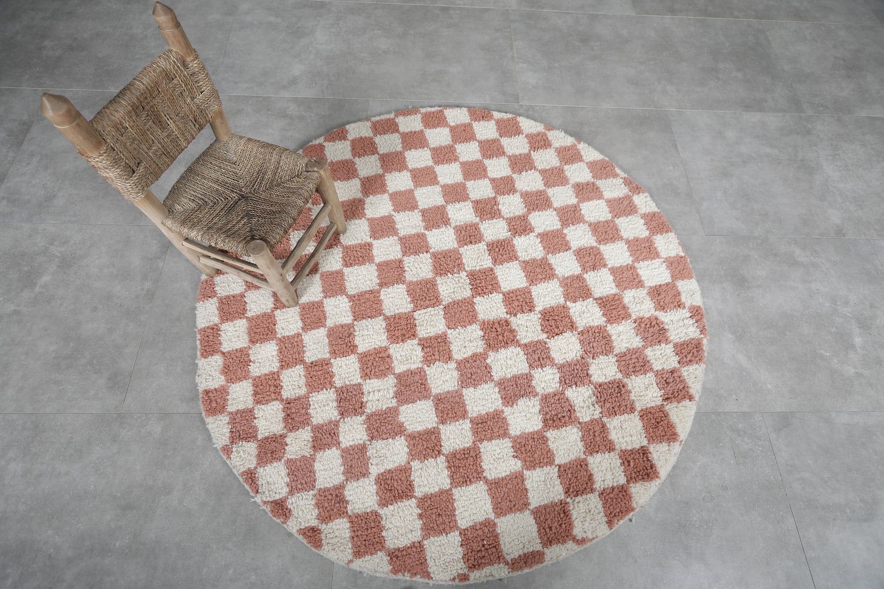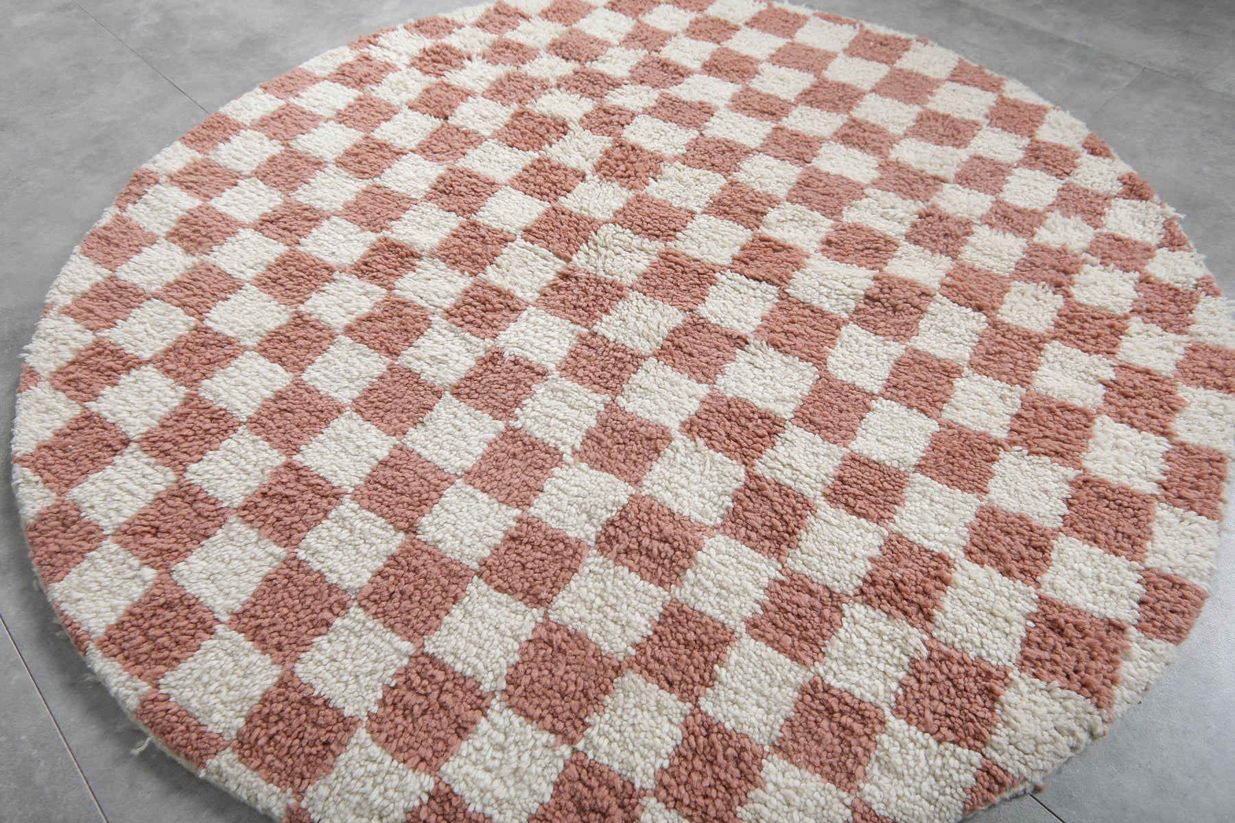 Upgrade your décor with this handcrafted 5-foot round Moroccan wool rug, featuring a terracotta and white checkerboard pattern. Made from 100% natural wool, this rug combines softness, durability, and an elegant design.