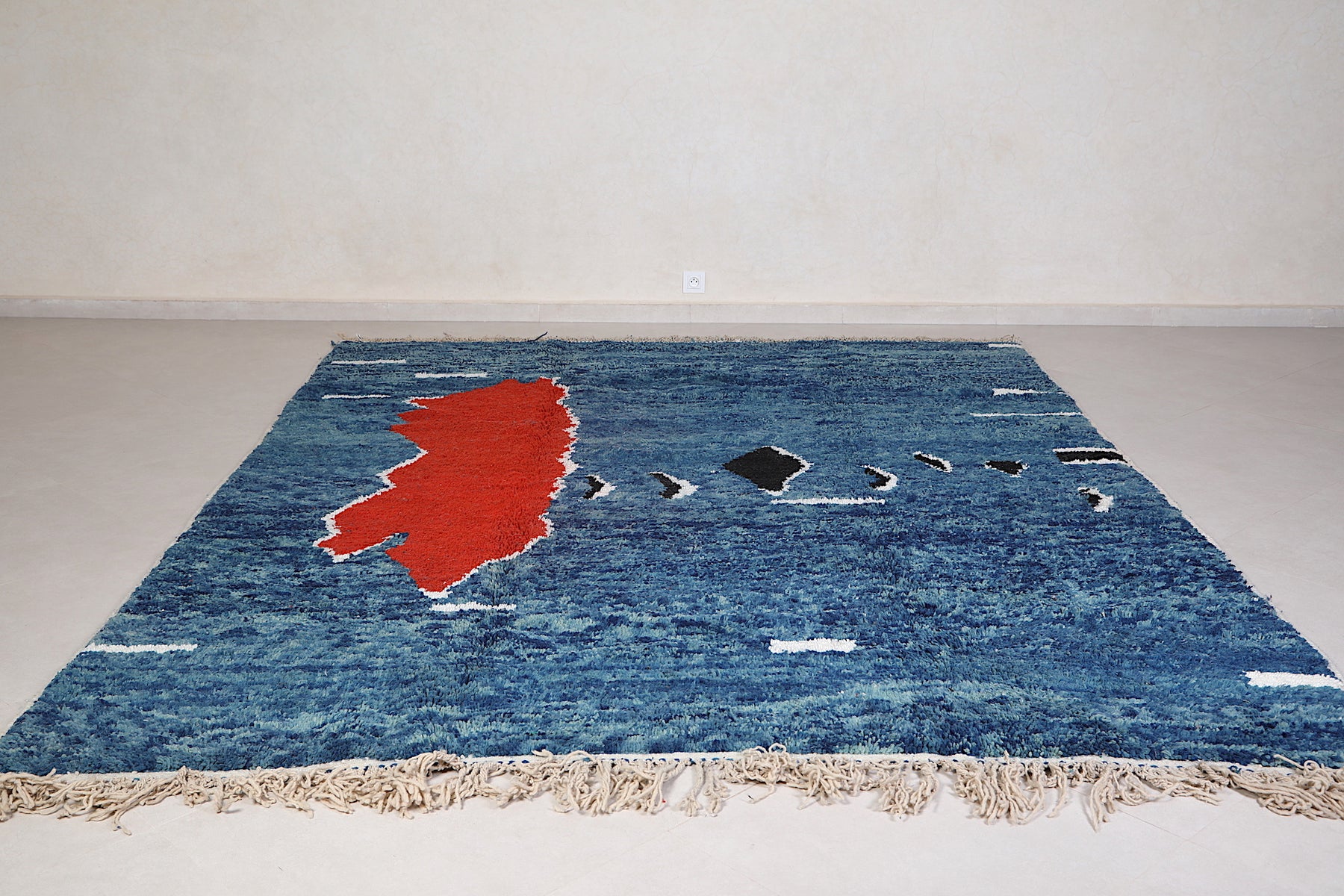 This 8.2 x 10.1 feet Blue Moroccan Beni Ourain Tribal Rug features a deep blue background accented with bold red and black abstract motifs, blending traditional craftsmanship with a striking modern aesthetic. Handwoven from 100% premium wool, it offers a plush, soft, and durable texture that enhances any space. Perfect for large living rooms, bedrooms, or statement interiors, this unique rug adds warmth, elegance, and Moroccan artistry while complementing both contemporary and bohemian décor styles.