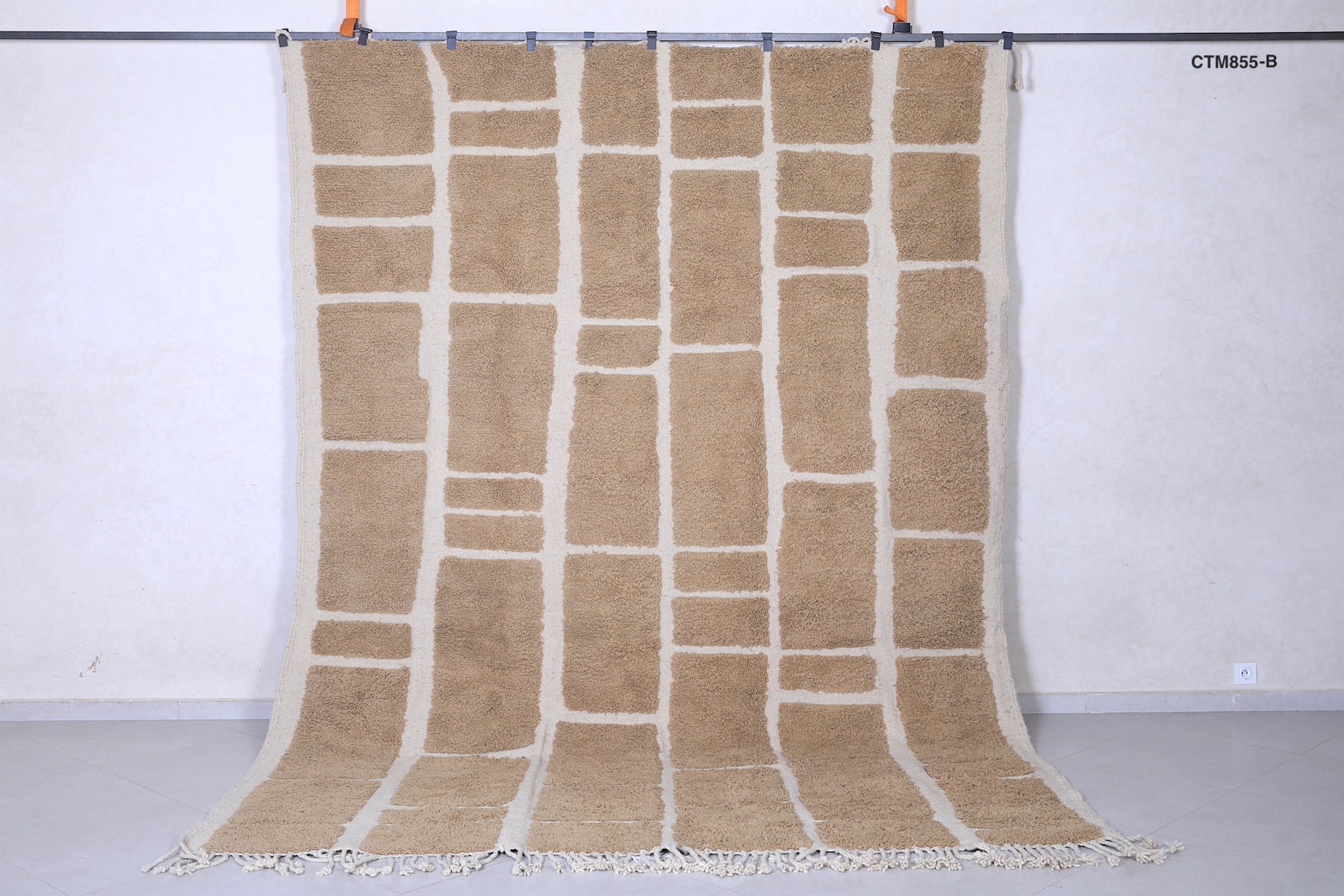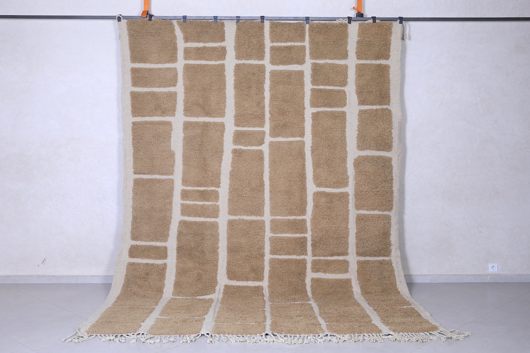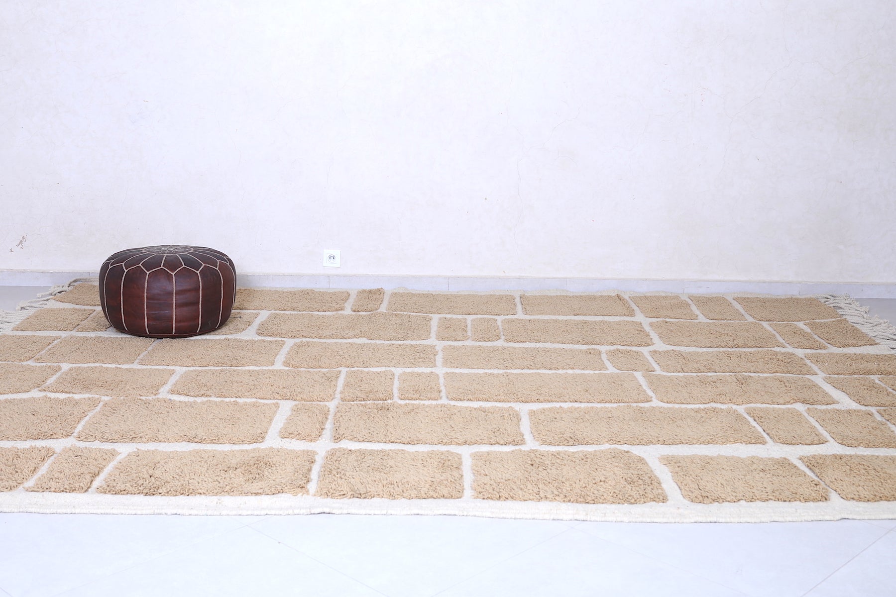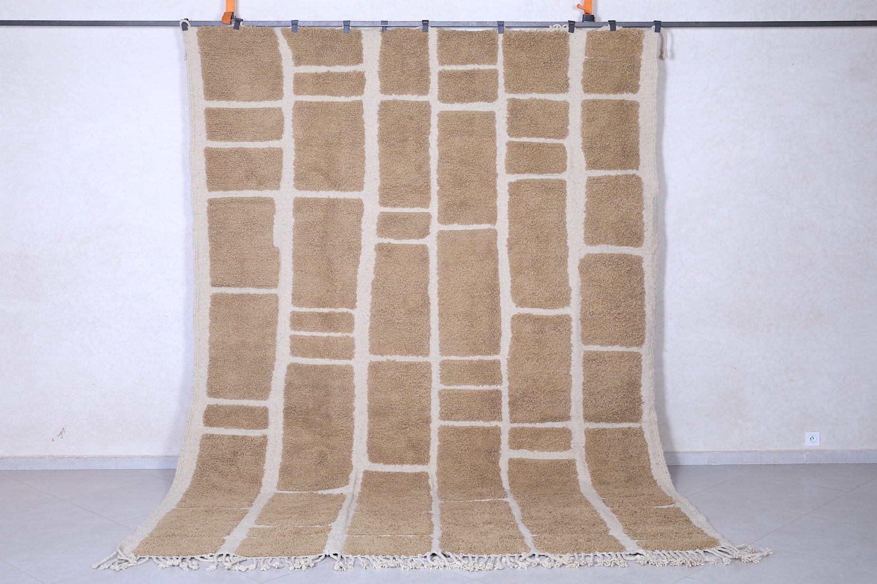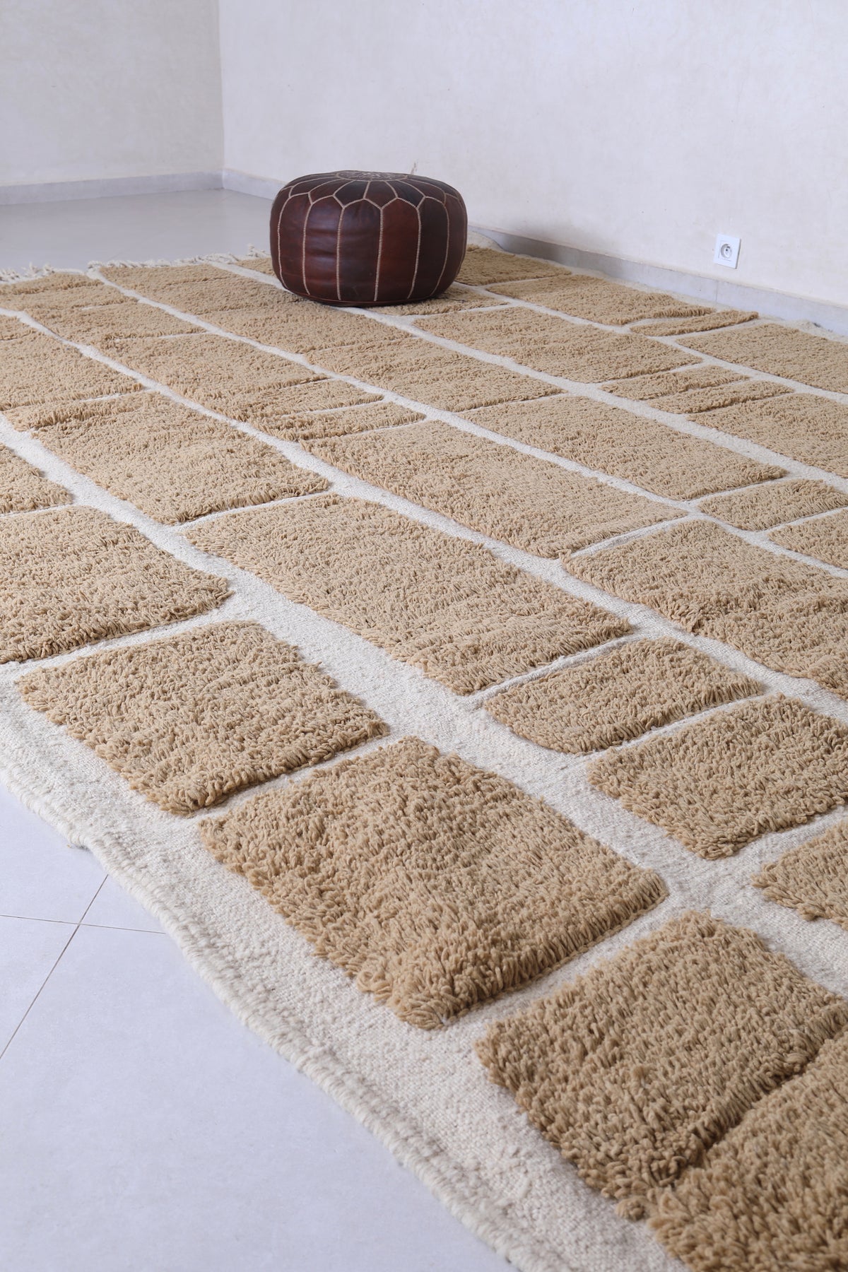 Handcrafted in Morocco's Atlas Mountains, this authentic Berber wool rug showcases traditional geometric patterns in soothing beige tones. Each piece is meticulously woven by skilled artisans using 100% natural wool, ensuring durability and timeless appeal. The minimalist grid design complements contemporary and eclectic interiors alike, while the neutral palette seamlessly integrates with any décor scheme. Naturally stain-resistant and increasingly softer with age, this investment piece brings warmth, texture, and cultural authenticity to your space. A versatile foundation for layered styling or a standalone statement.