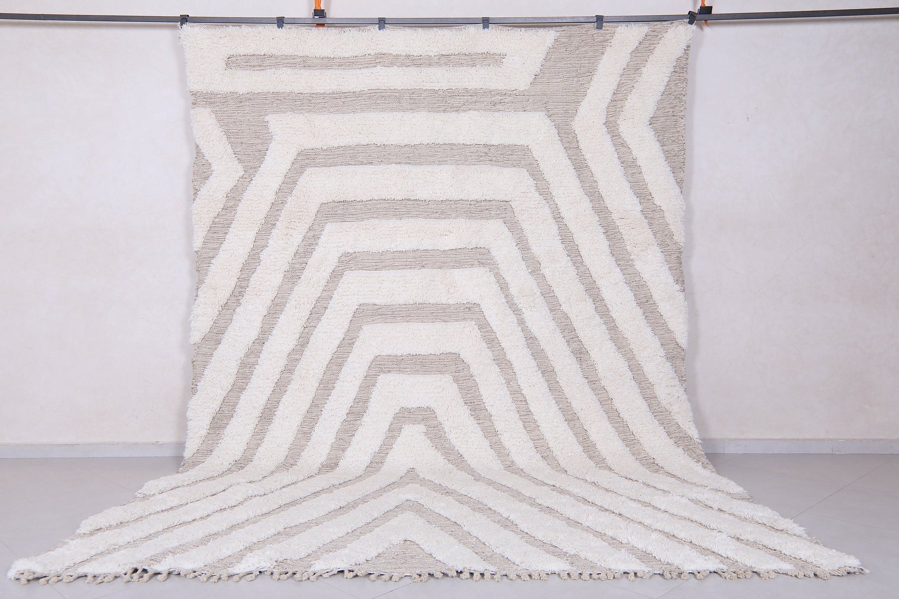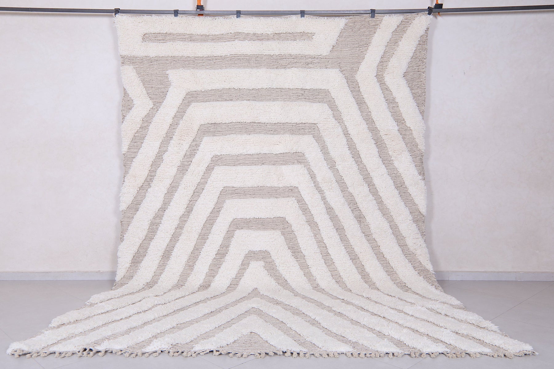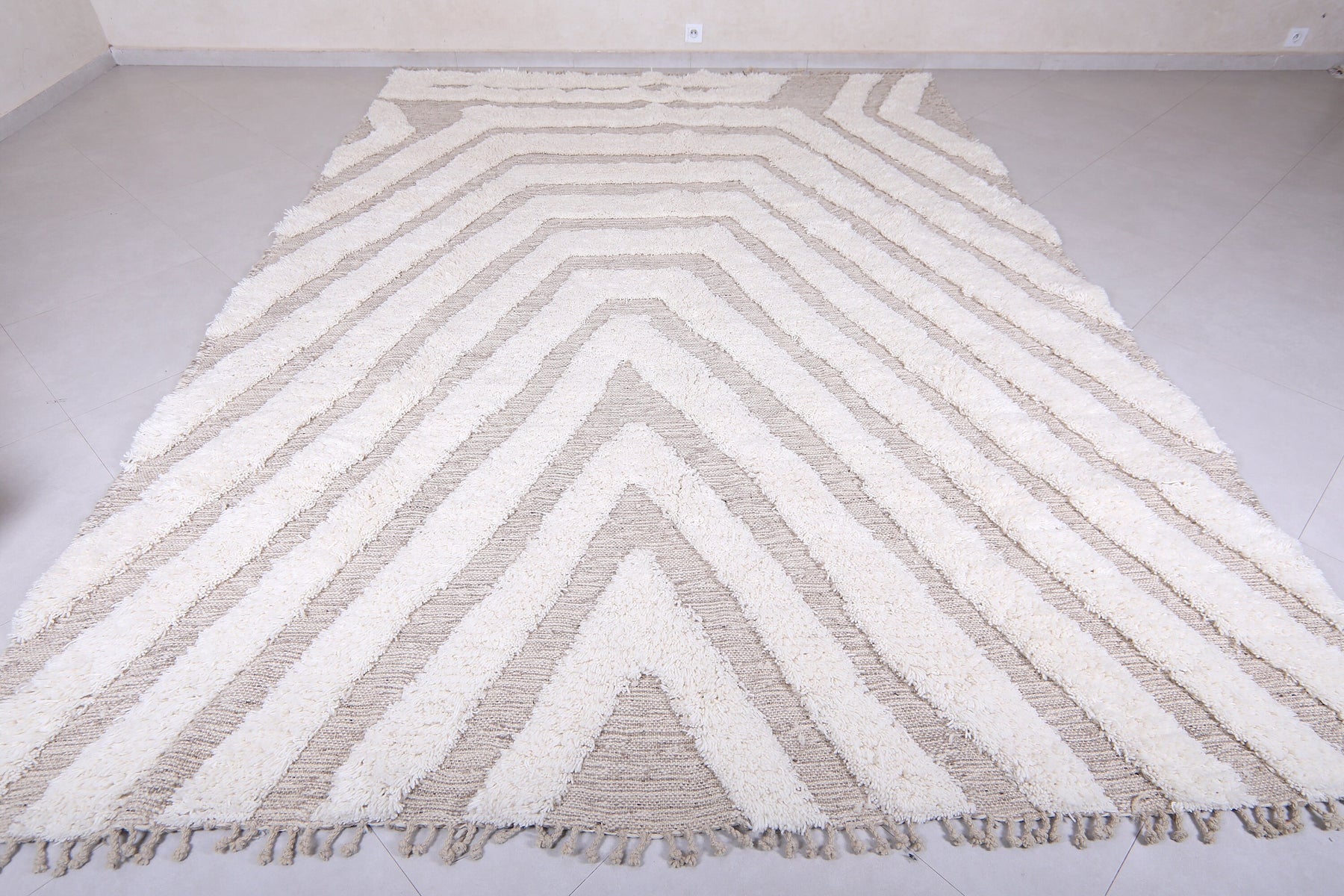 Sleek, soft, and effortlessly stylish — this Modern Moroccan Wool Rug features a captivating cream and beige geometric pattern that draws the eye with layered symmetry and subtle contrast. The design forms a cascading series of lines that create a sense of depth and dimension, making it the perfect centerpiece for any modern or minimalist space.