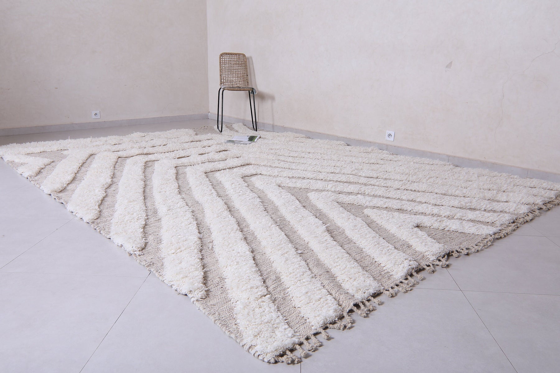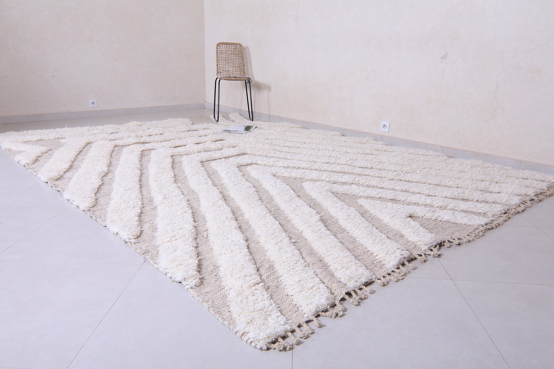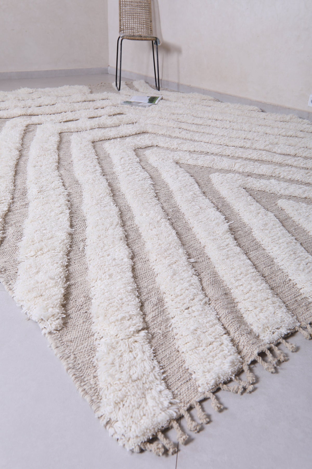 Sleek, soft, and effortlessly stylish — this Modern Moroccan Wool Rug features a captivating cream and beige geometric pattern that draws the eye with layered symmetry and subtle contrast. The design forms a cascading series of lines that create a sense of depth and dimension, making it the perfect centerpiece for any modern or minimalist space.