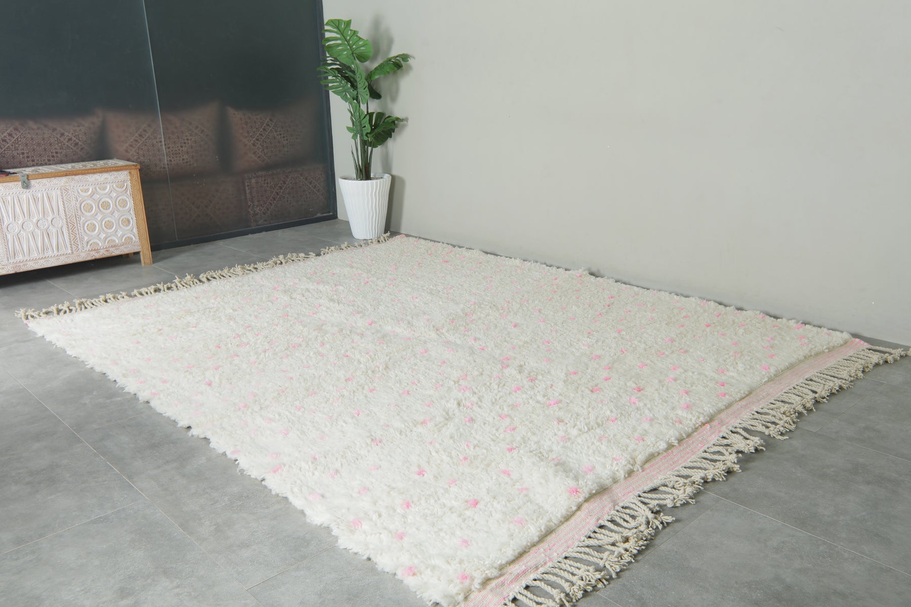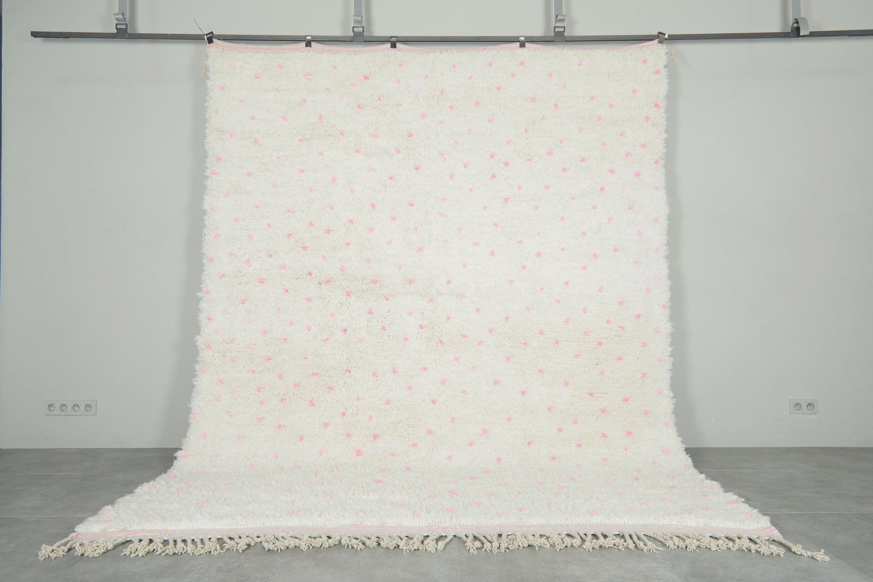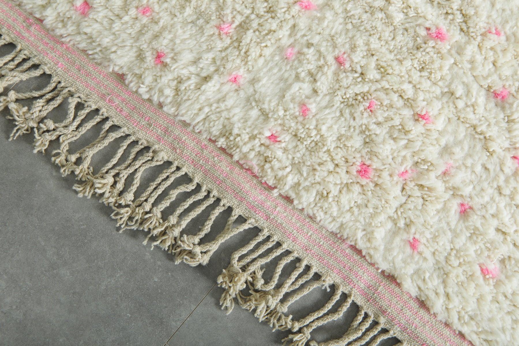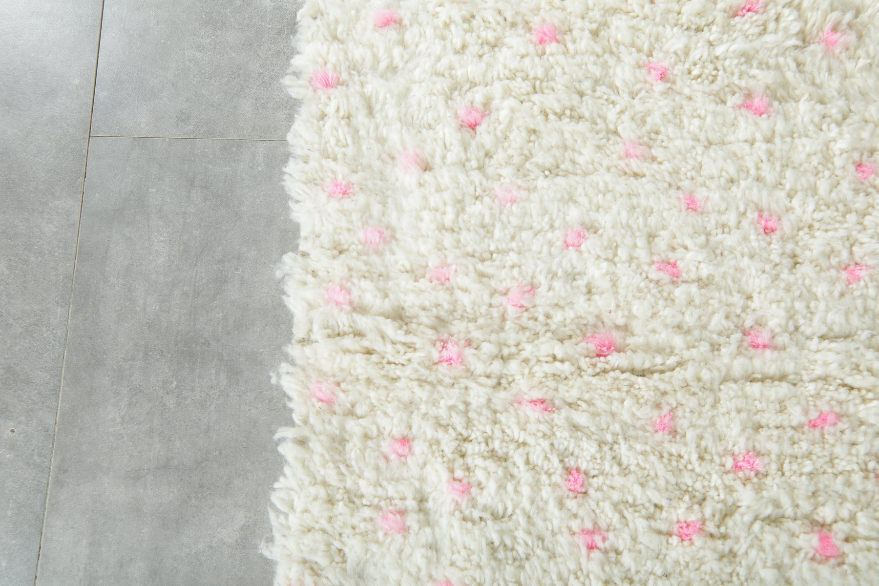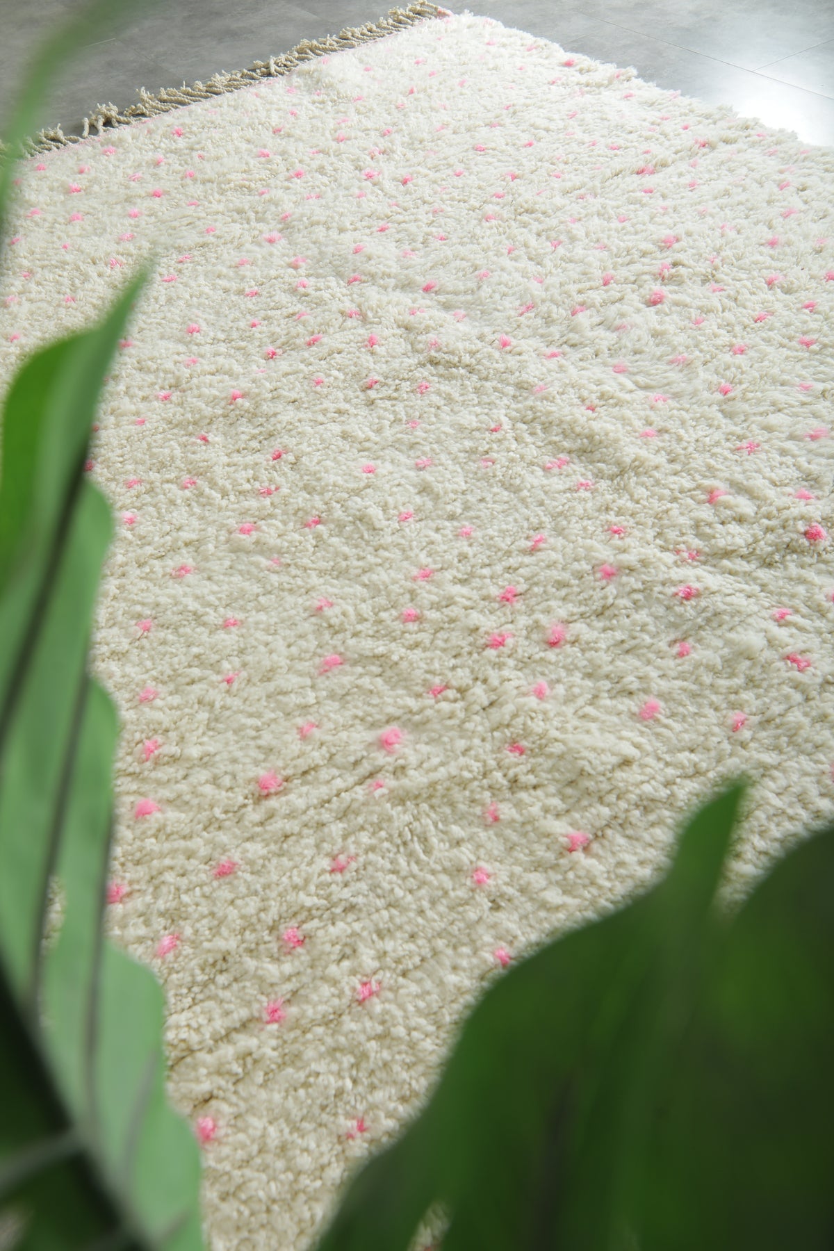 Bring a touch of playful elegance to your space with this handmade Moroccan Beni Ourain rug, crafted from soft white wool and delicately accented with pastel pink dots. Its minimalist yet charming design makes it perfect for modern, Scandinavian, or bohemian interiors, adding a gentle pop of color while maintaining a clean and timeless aesthetic.