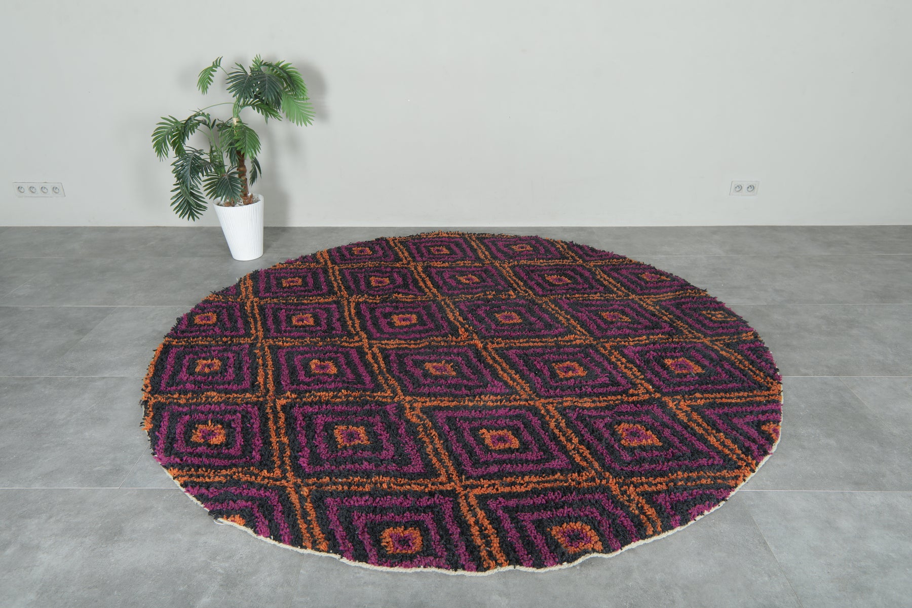 This Moroccan Round Rug features a bold diamond pattern in vibrant orange, pink, and purple hues—perfect for making a statement in any space. A playful yet artistic design rooted in tradition.