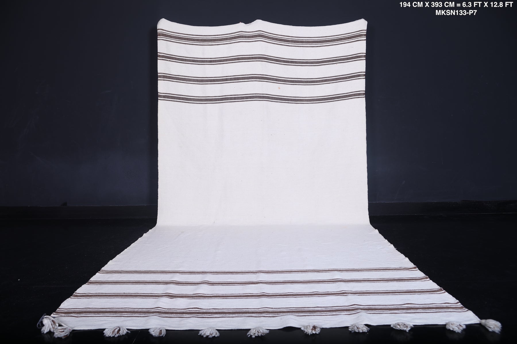This 6.3 x 12.8 feet Berber Handwoven Moroccan Kilim Rug features a crisp white base with elegant black and brown stripes, offering a sophisticated and timeless appeal. Handcrafted from premium wool, this one-of-a-kind piece provides lasting durability and warmth, making it perfect for large living areas or statement interiors.