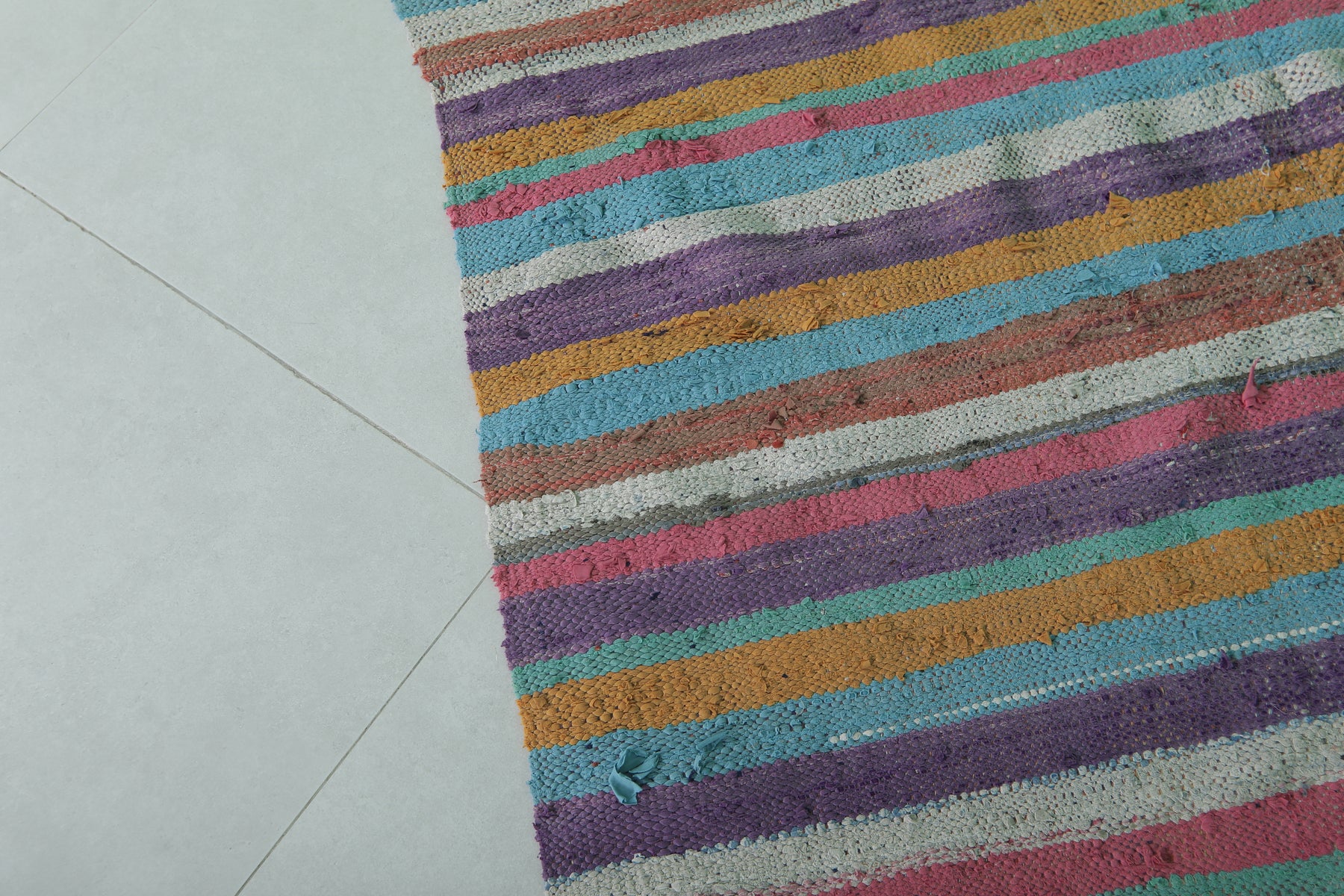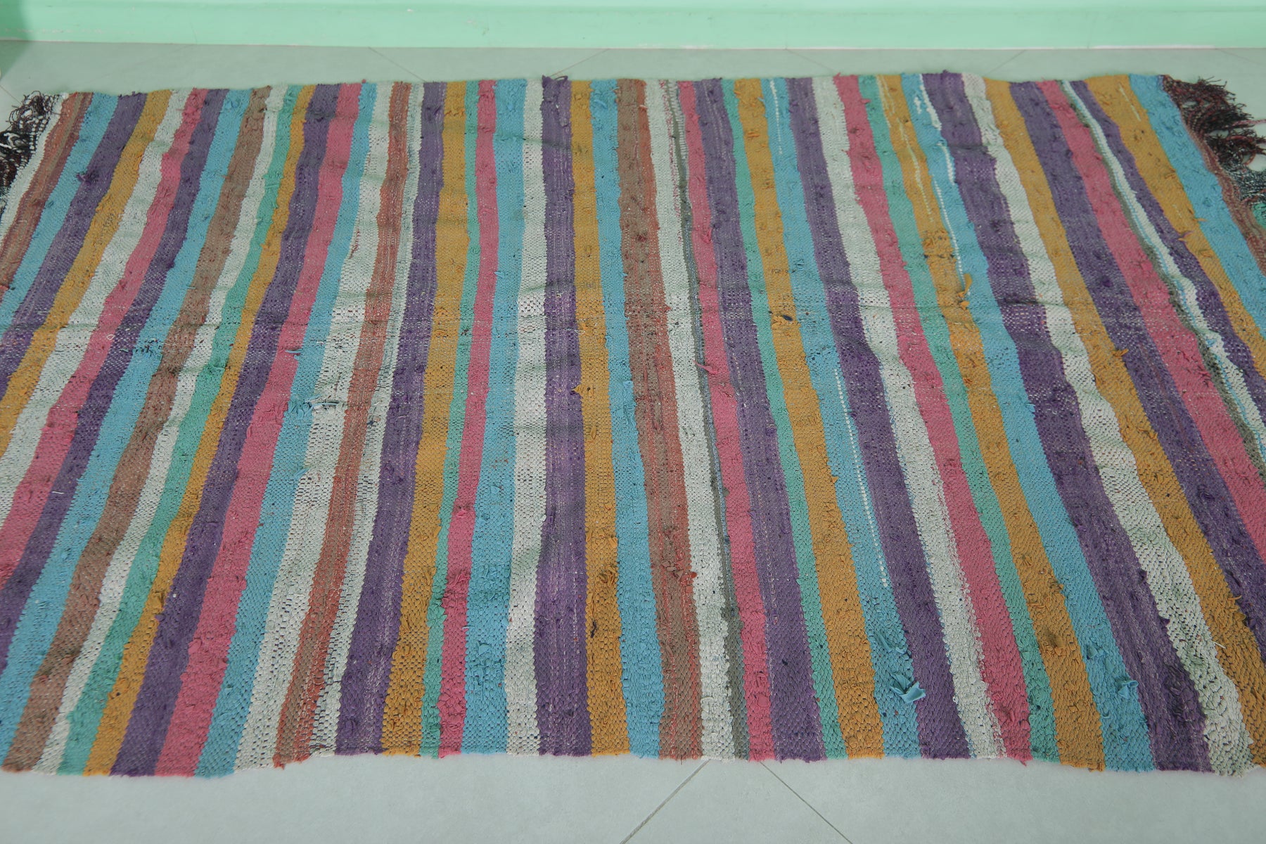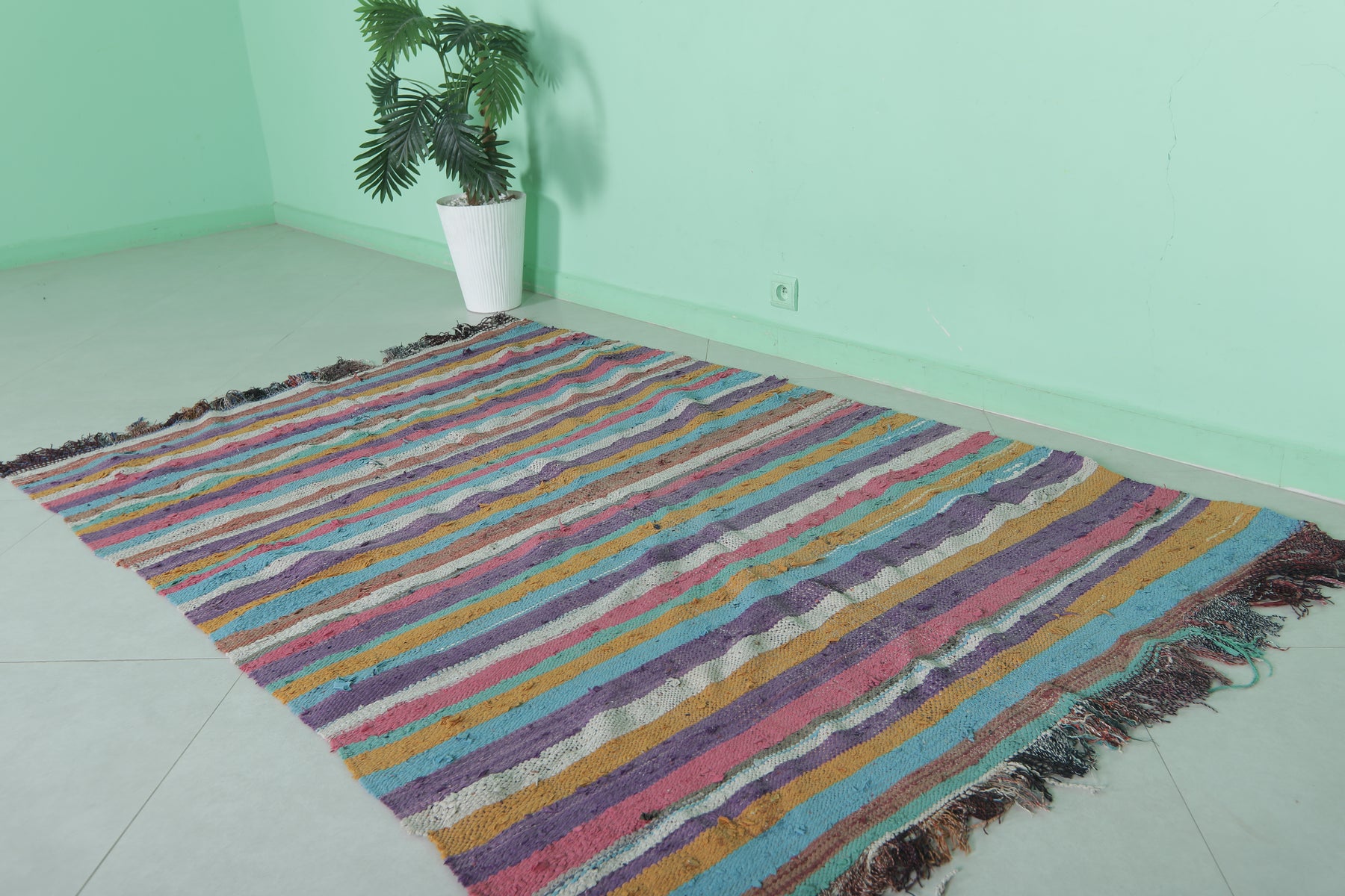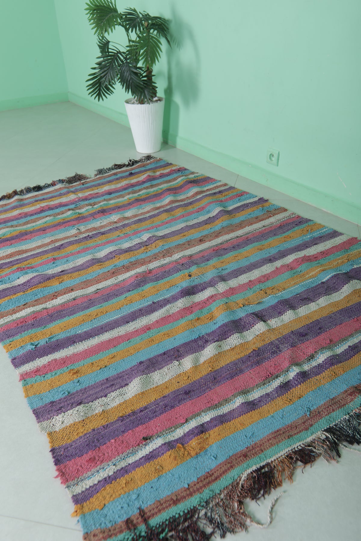 This 4.5 x 6.7 feet colorful Berber Moroccan Kilim features a lively striped design in a spectrum of colors, blending traditional artistry with a vibrant aesthetic. Handwoven from premium wool, it offers durability and warmth, making it ideal for living rooms, bedrooms, or eclectic interiors.