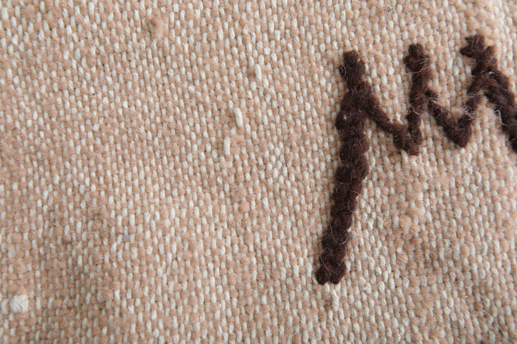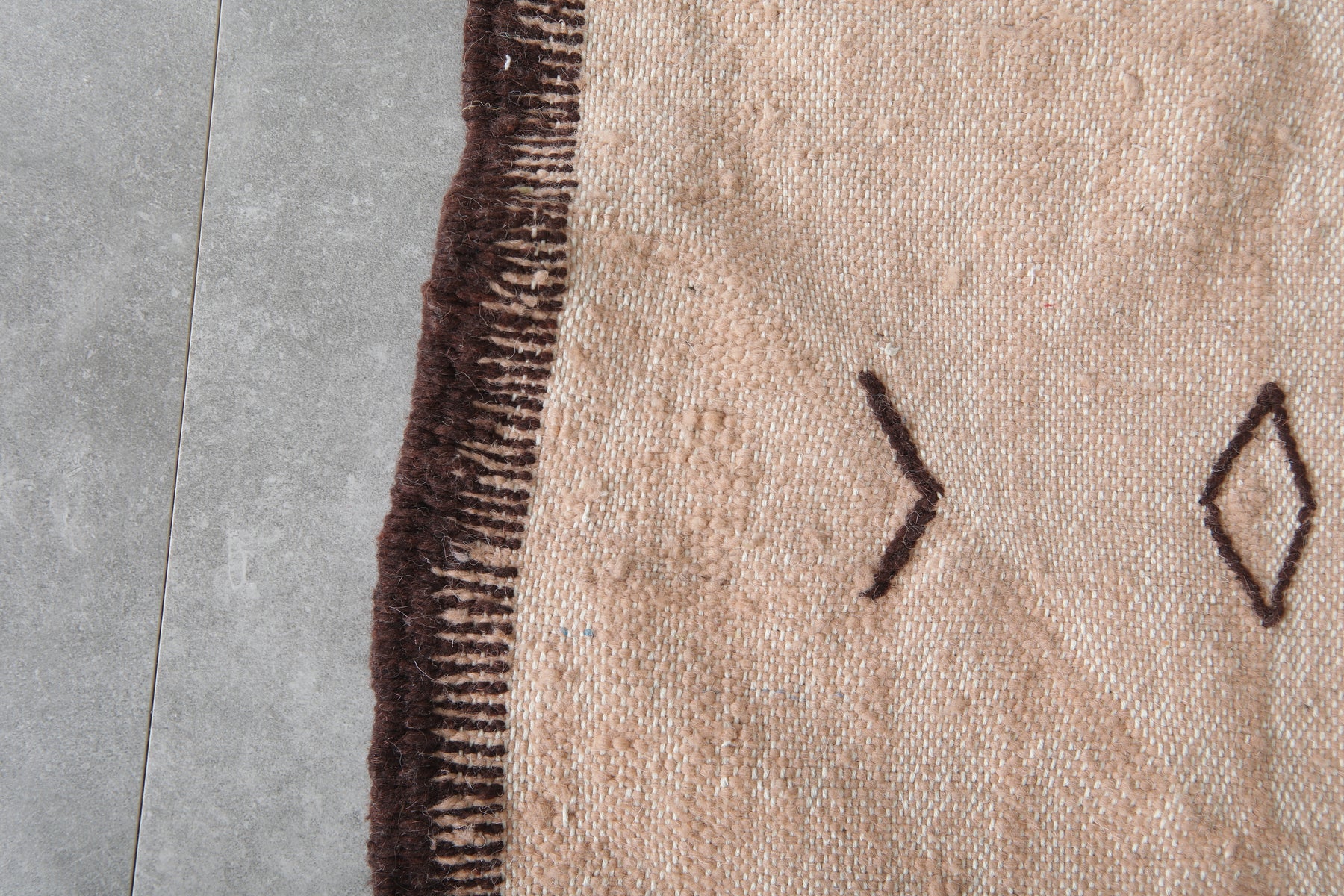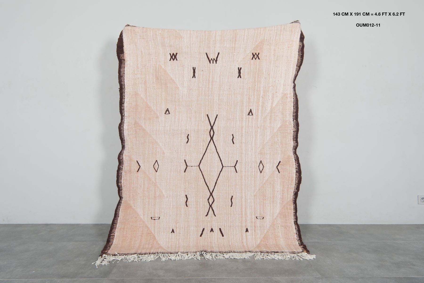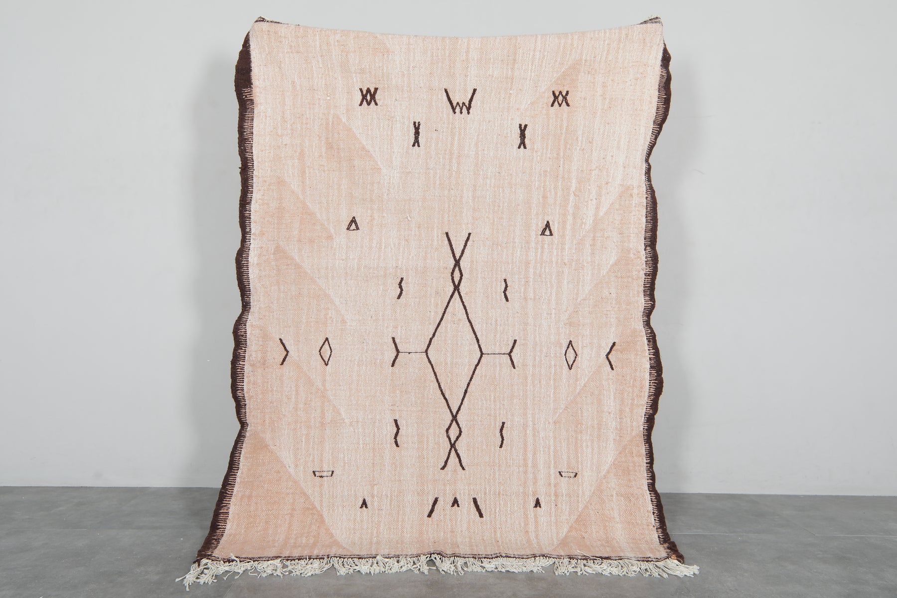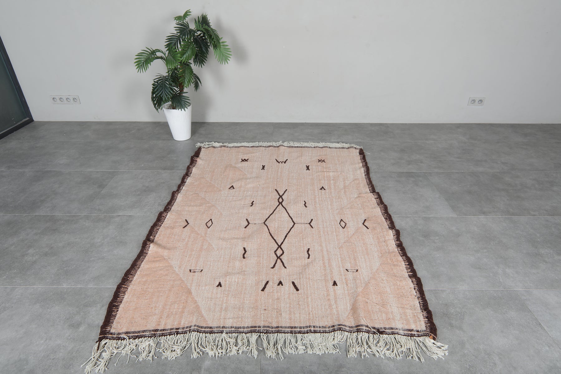 Elegant Moroccan Kilim rug measuring 4.6 x 6.2 ft, handwoven with intricate Berber motifs in warm, earthy tones. This lightweight, flatweave carpet adds a sophisticated touch to bohemian, rustic, or modern interiors. A timeless artisan piece for any home.