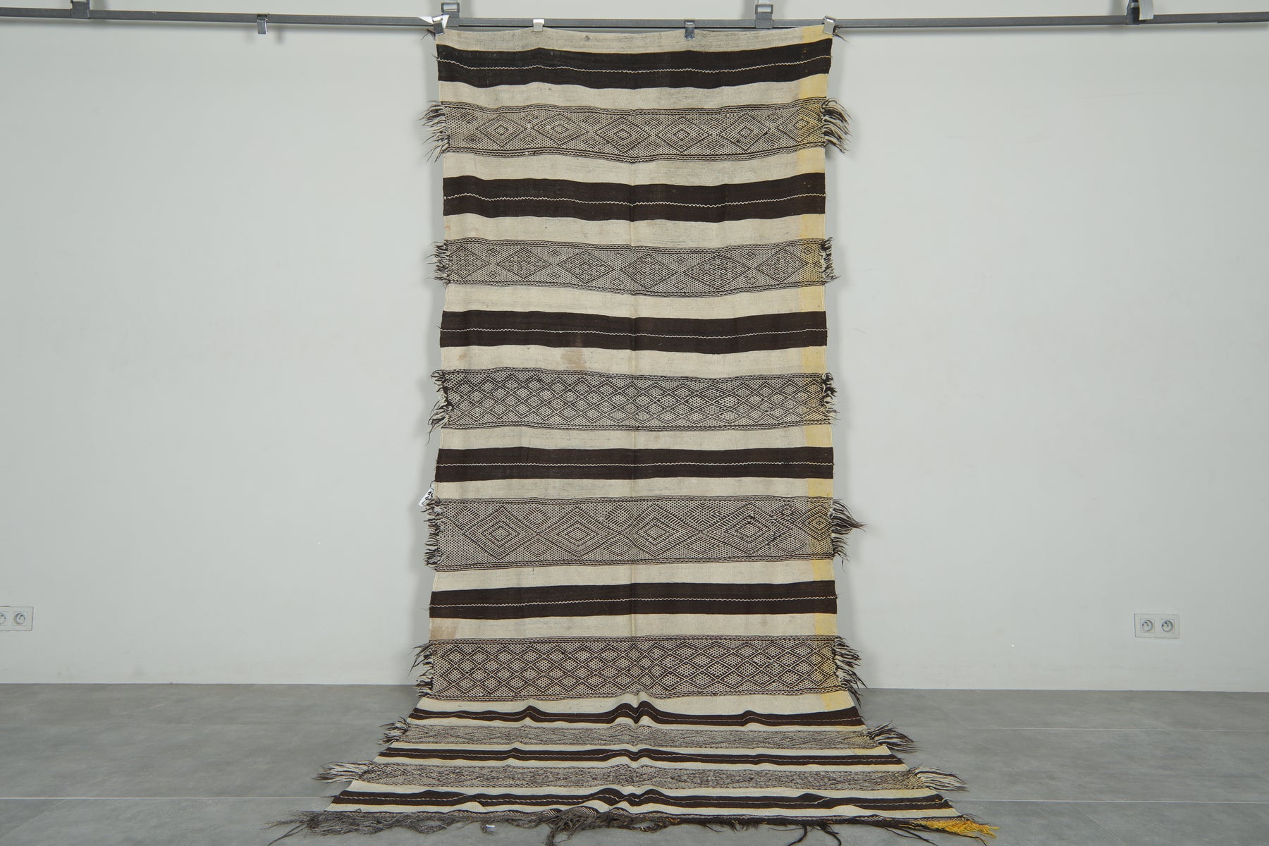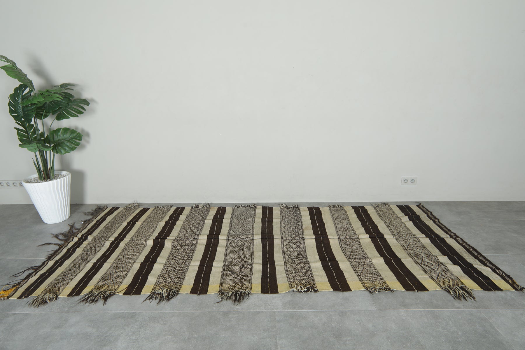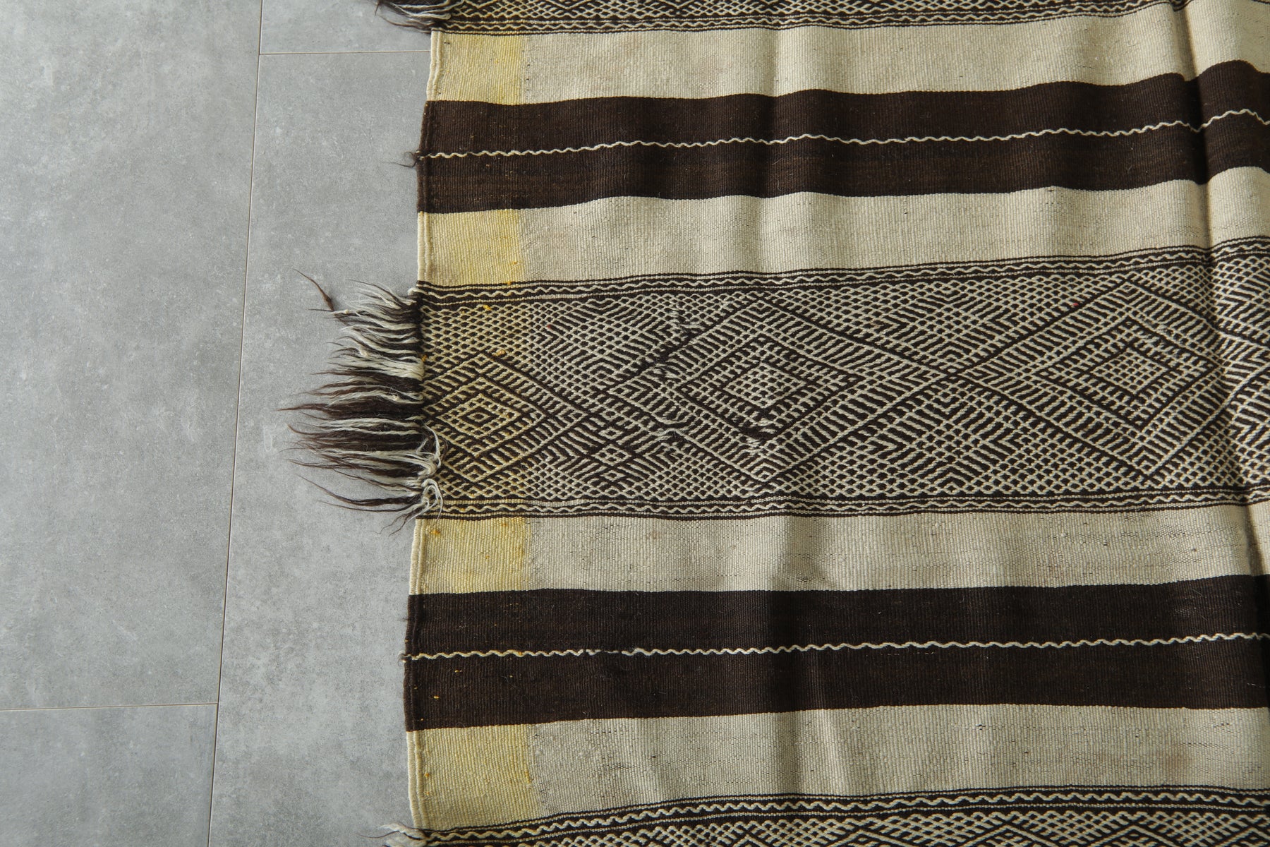 Introduce timeless elegance and earthy texture to your home with this flatwoven Moroccan rug in rich brown and natural beige tones. Expertly handcrafted by skilled artisans, this long wool rug features bold horizontal stripes, intricate diamond motifs, and subtle golden yellow accents—perfect for adding warmth and cultural flair to your space.