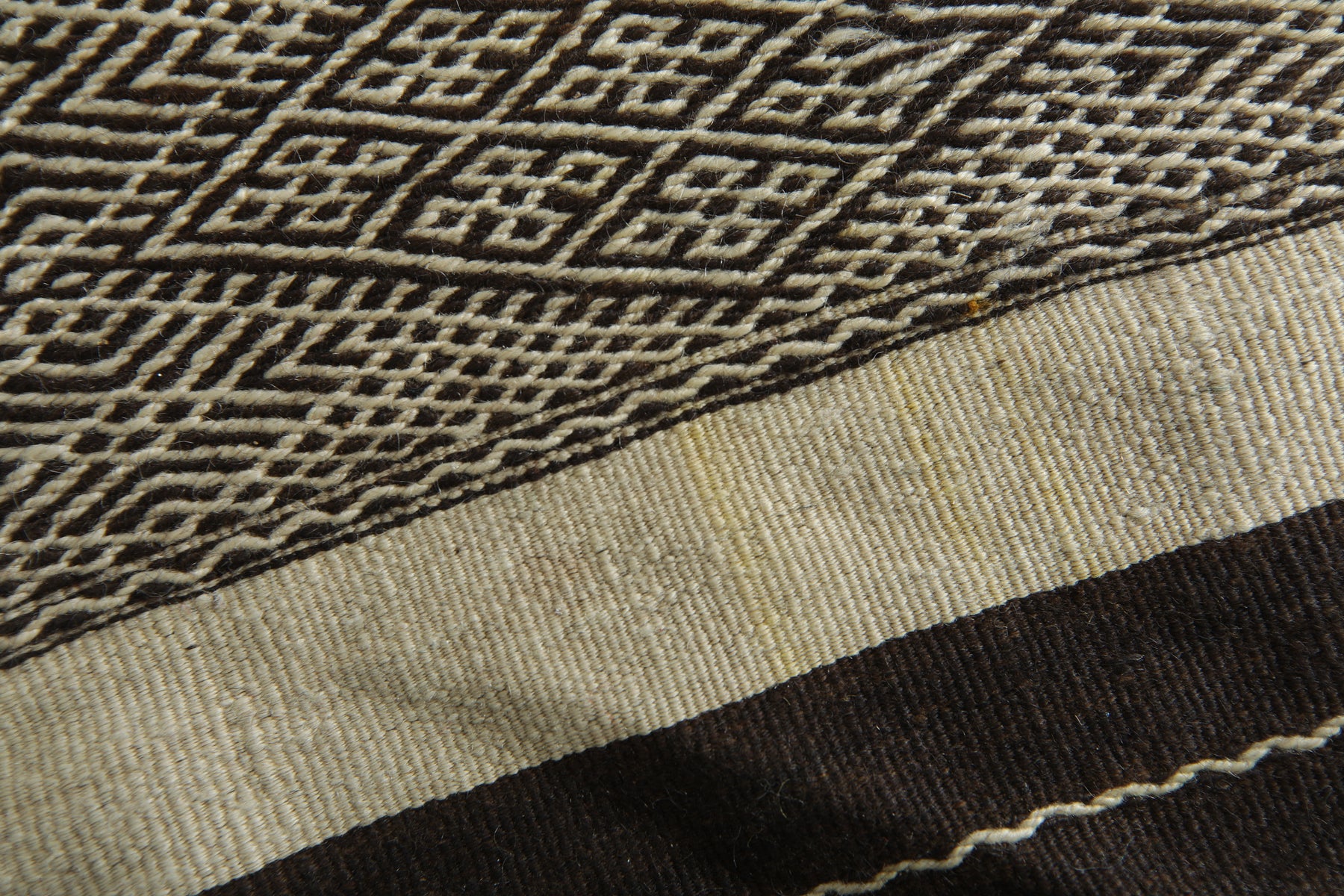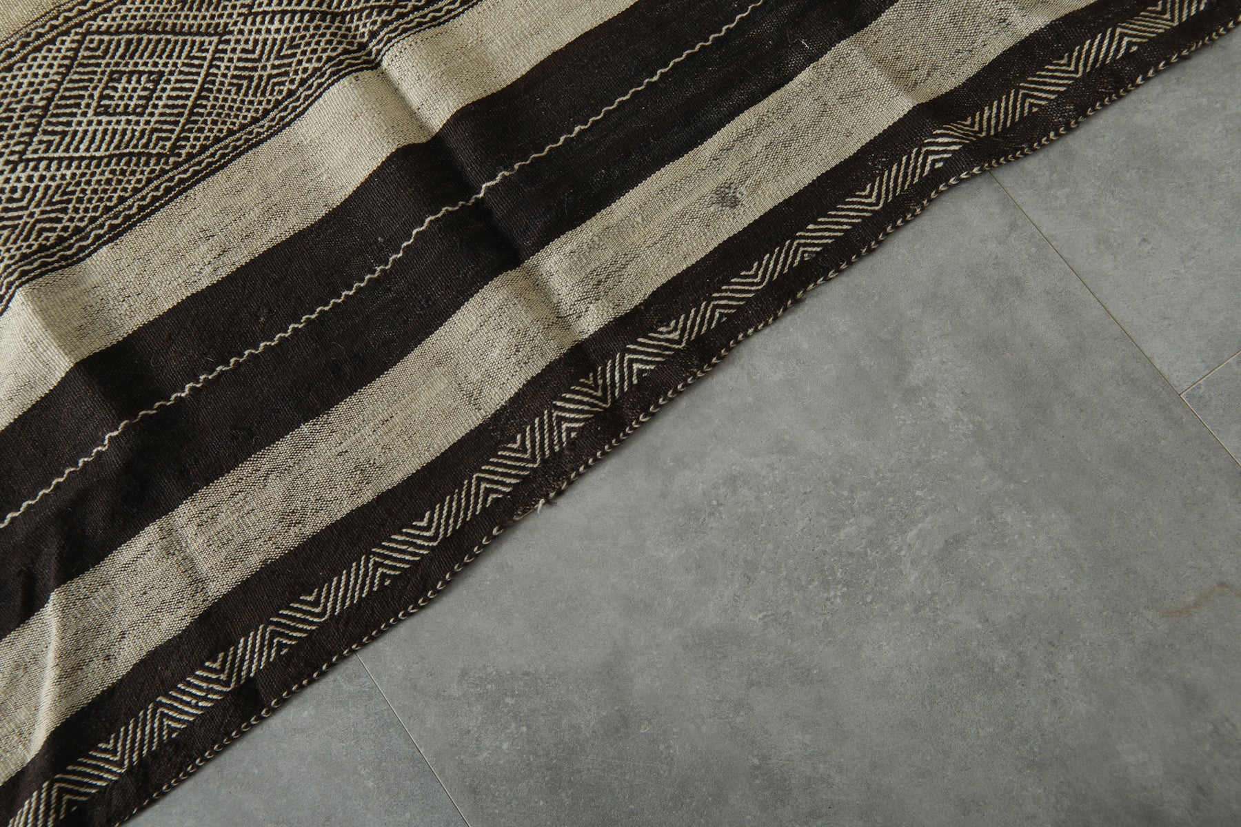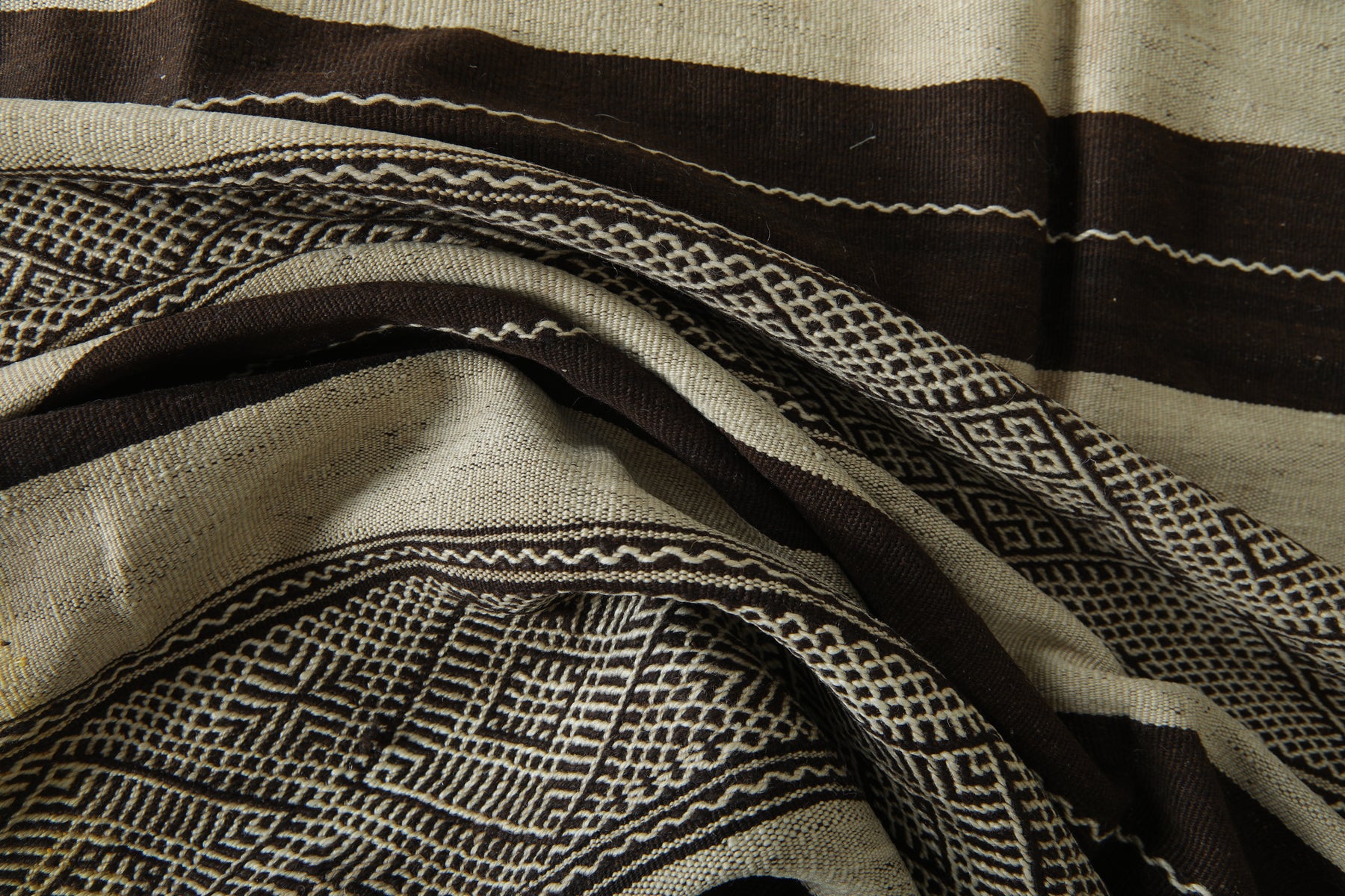 Introduce timeless elegance and earthy texture to your home with this flatwoven Moroccan rug in rich brown and natural beige tones. Expertly handcrafted by skilled artisans, this long wool rug features bold horizontal stripes, intricate diamond motifs, and subtle golden yellow accents—perfect for adding warmth and cultural flair to your space.