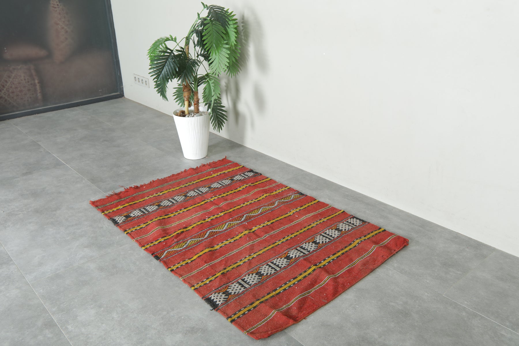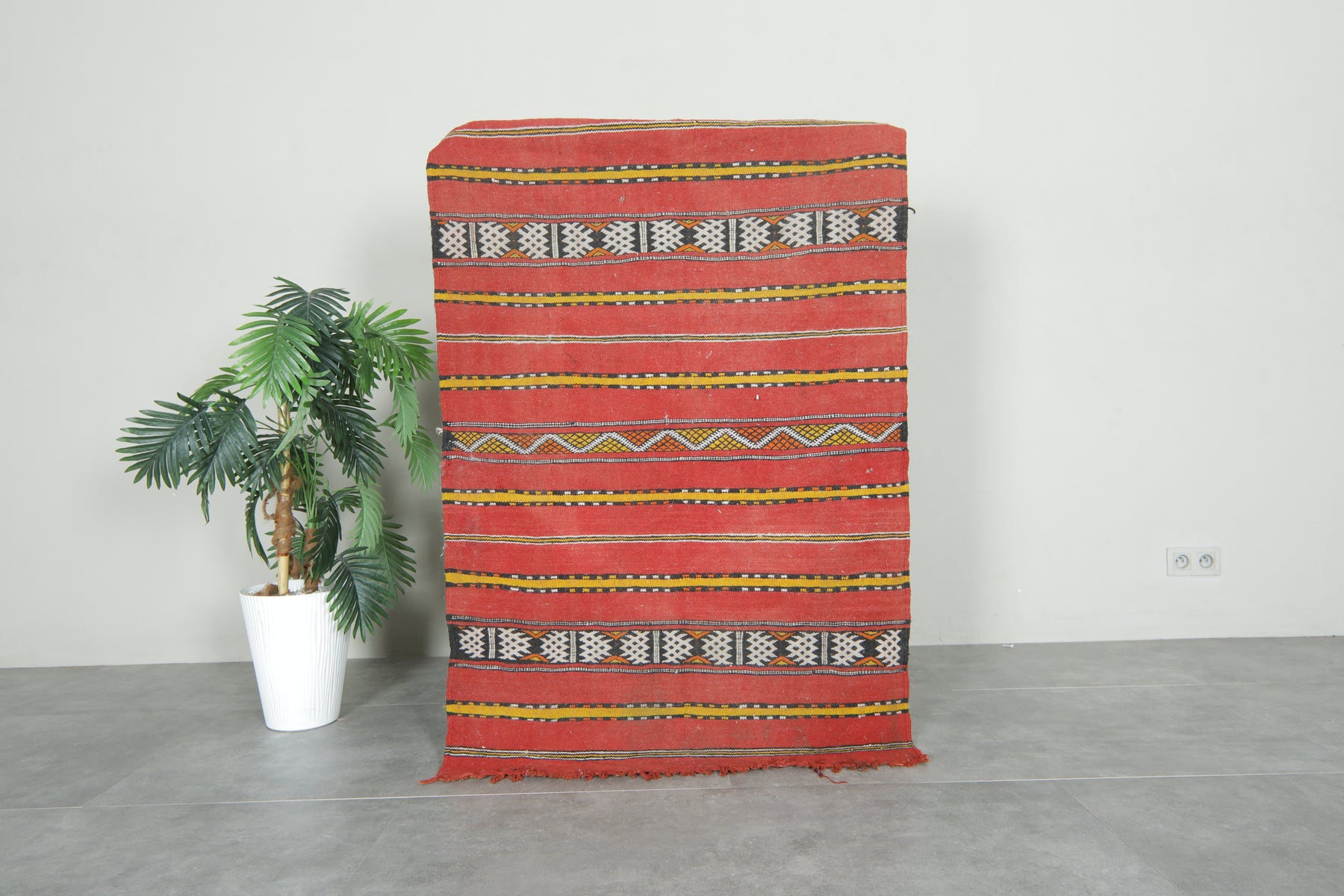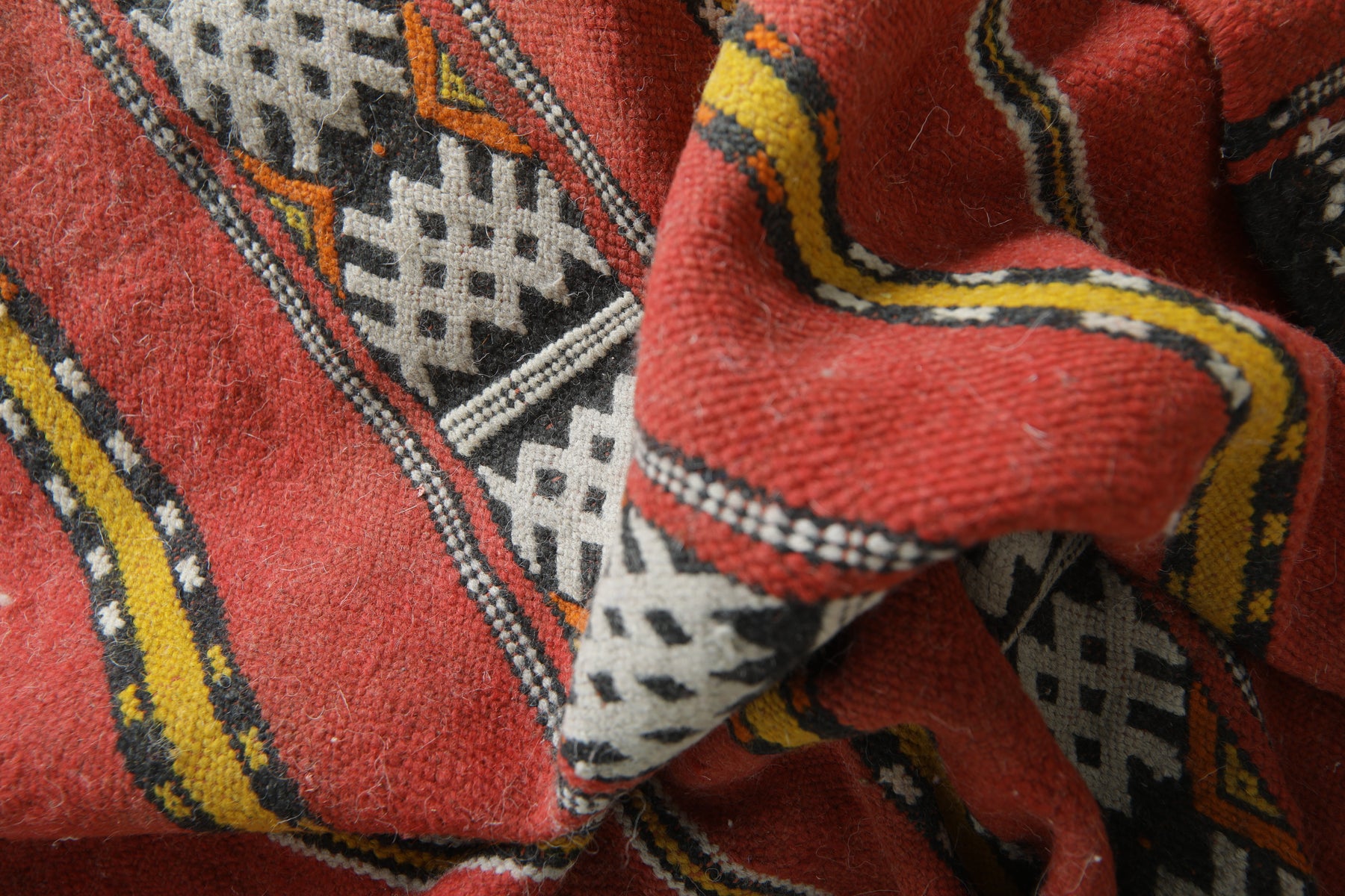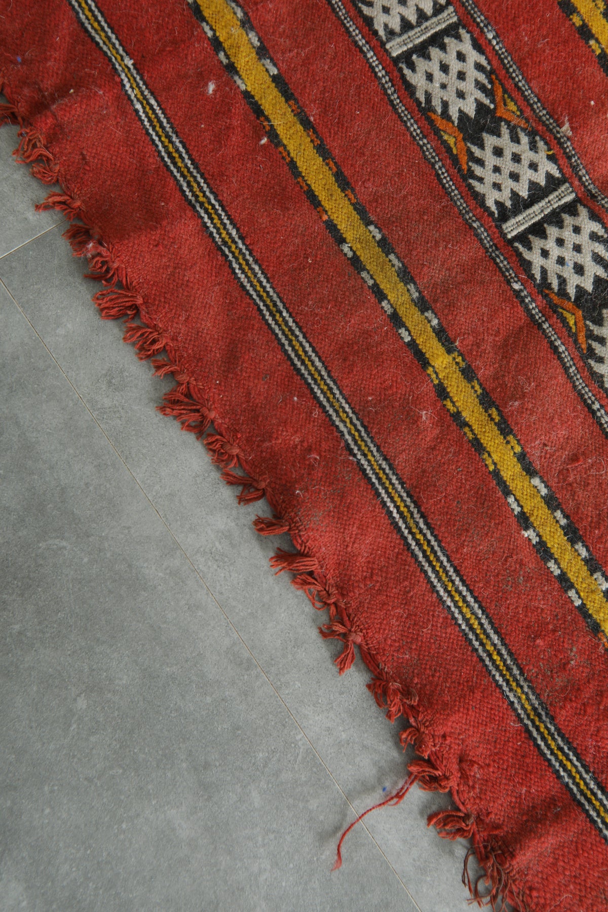 This beautiful, authentic flat woven rug is a true masterpiece of Moroccan craftsmanship. Handwoven from natural wool, it features a striking high pile and a vibrant, diamond-patterned design. The rug’s warm, earthy tones of red, black, yellow, and cream create a cozy, inviting feel, while the unique abstract motifs add a touch of modern artistry. Perfect for adding a global, bohemian flair to your living room, bedroom, or study.