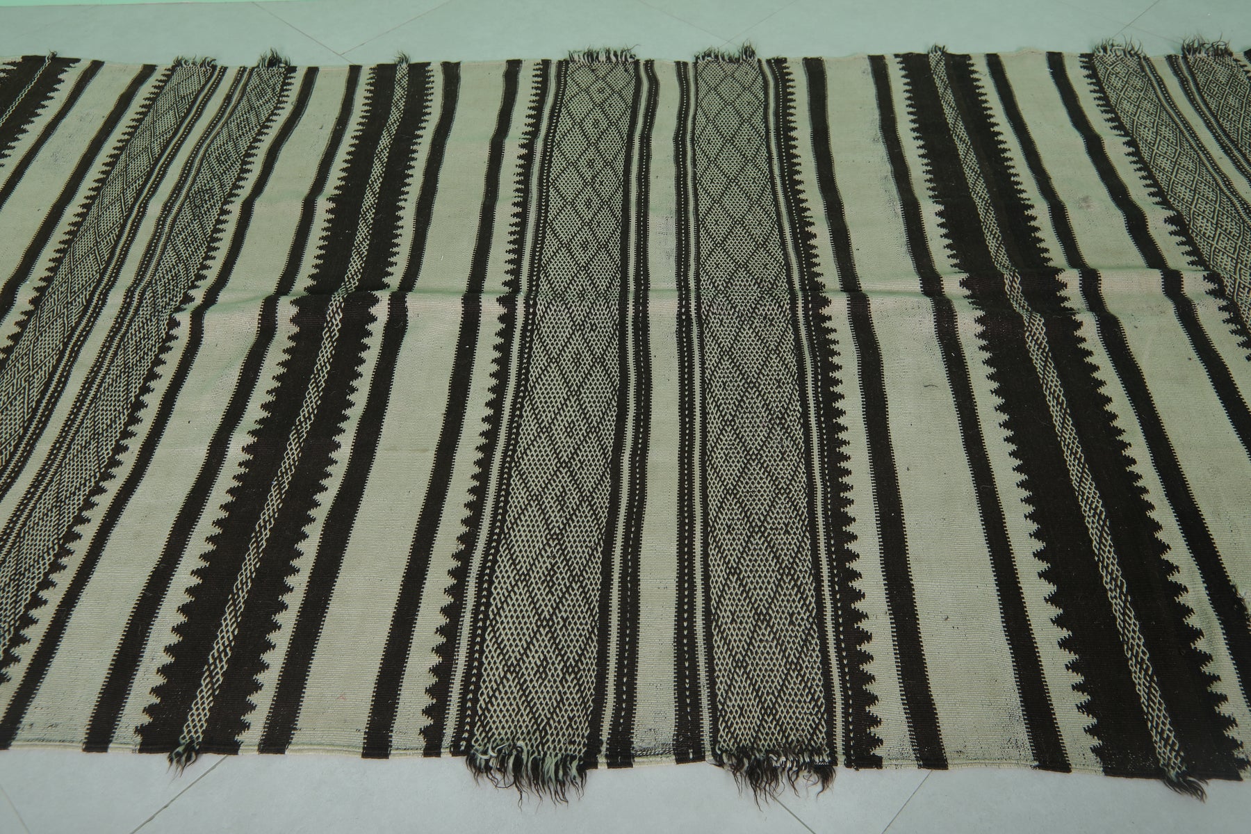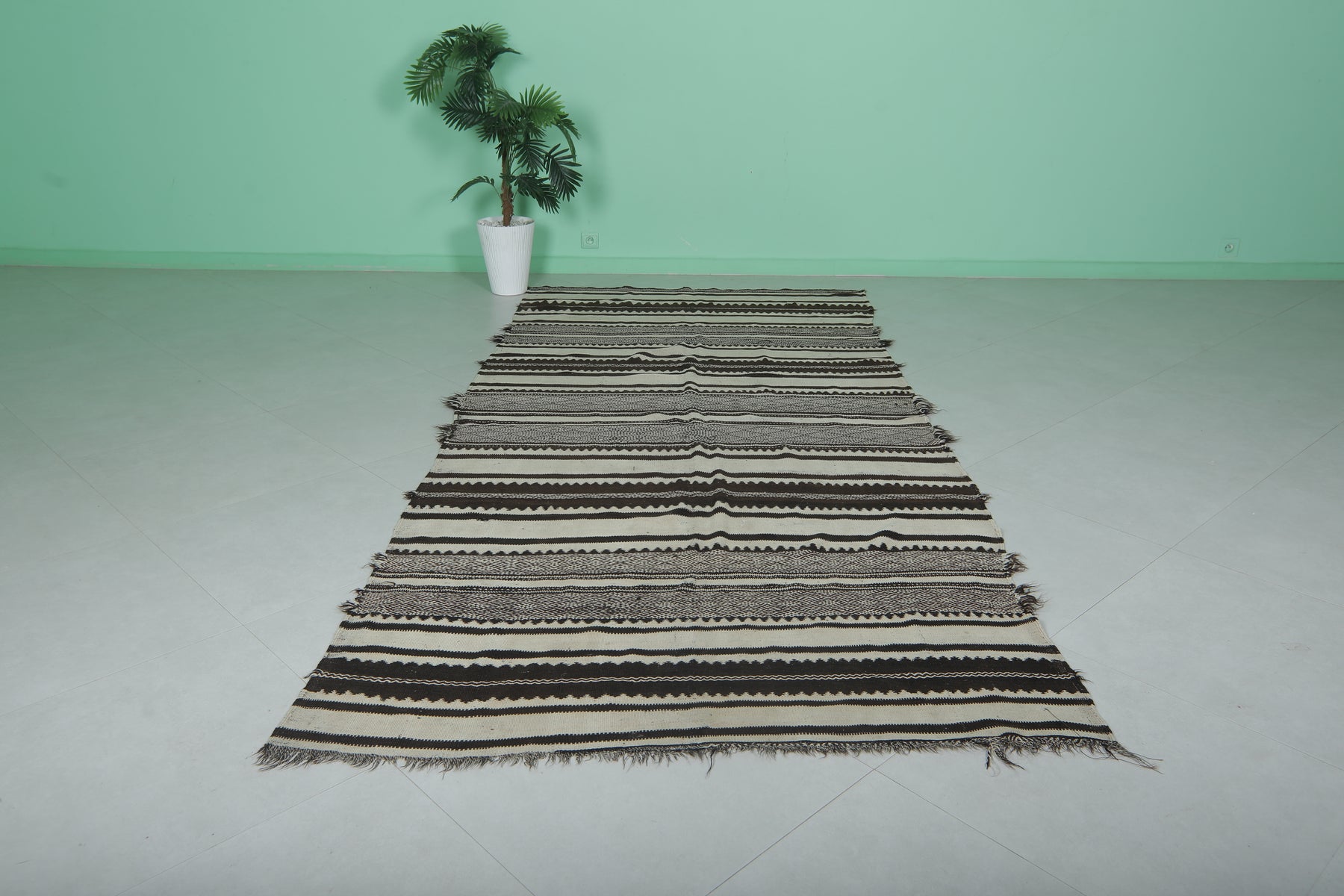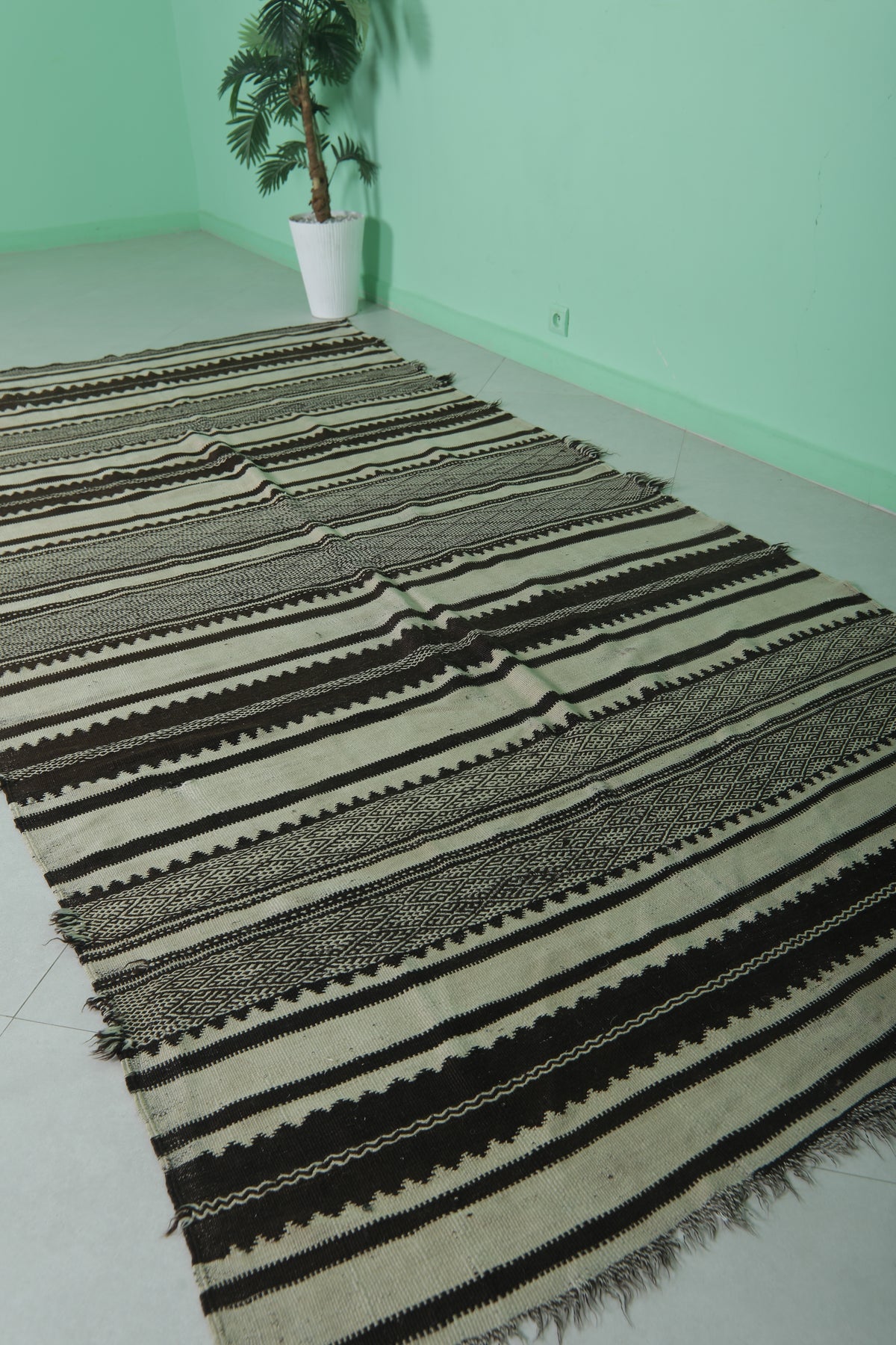 Handwoven Kilim Rug 4.9 FT x 10.7 FT – Elegant Black and White Design