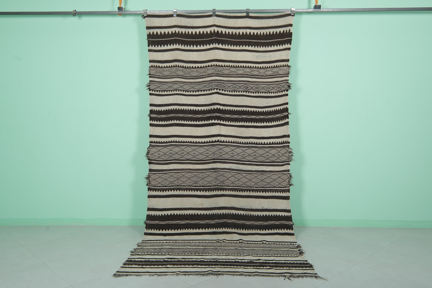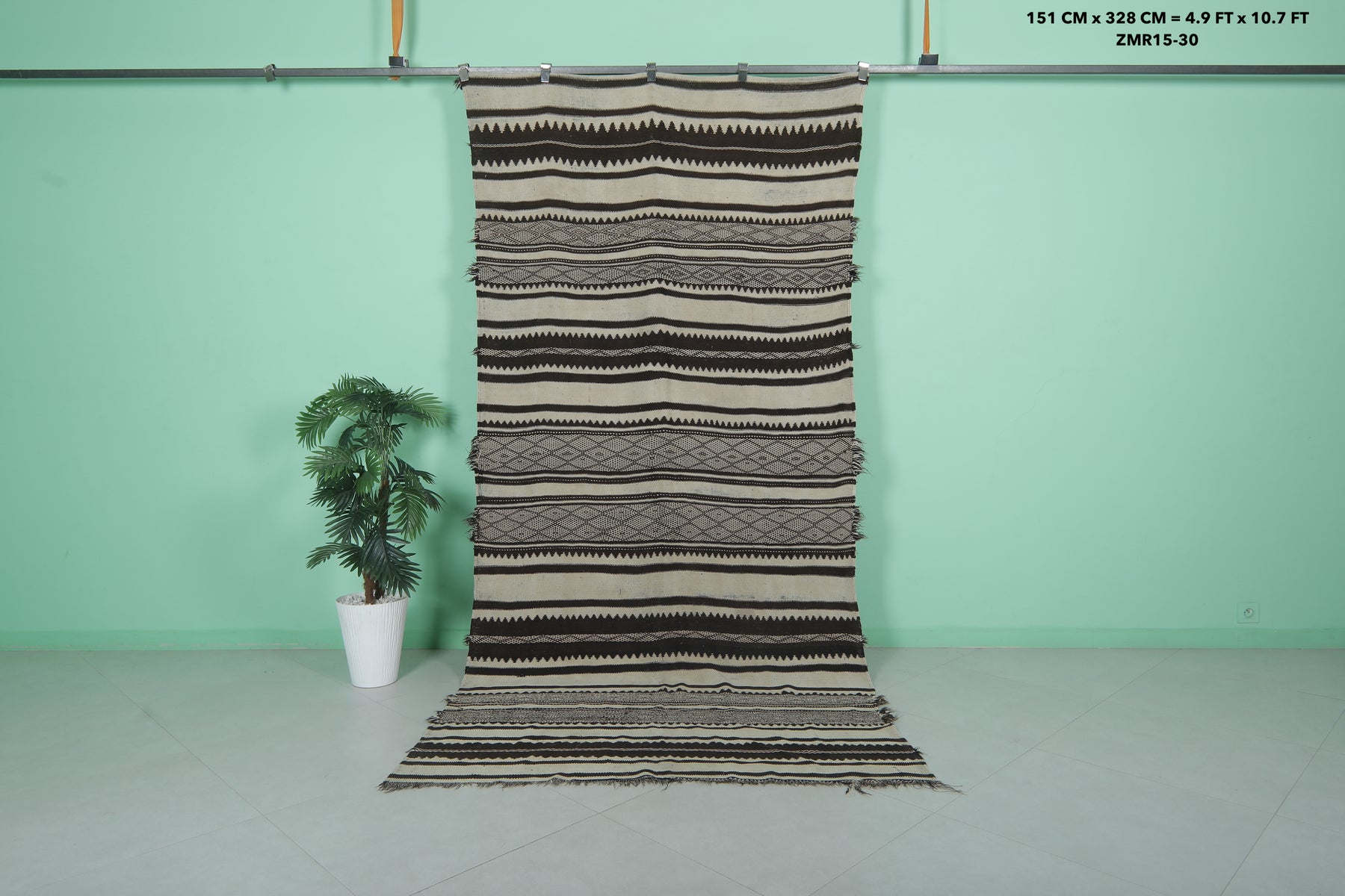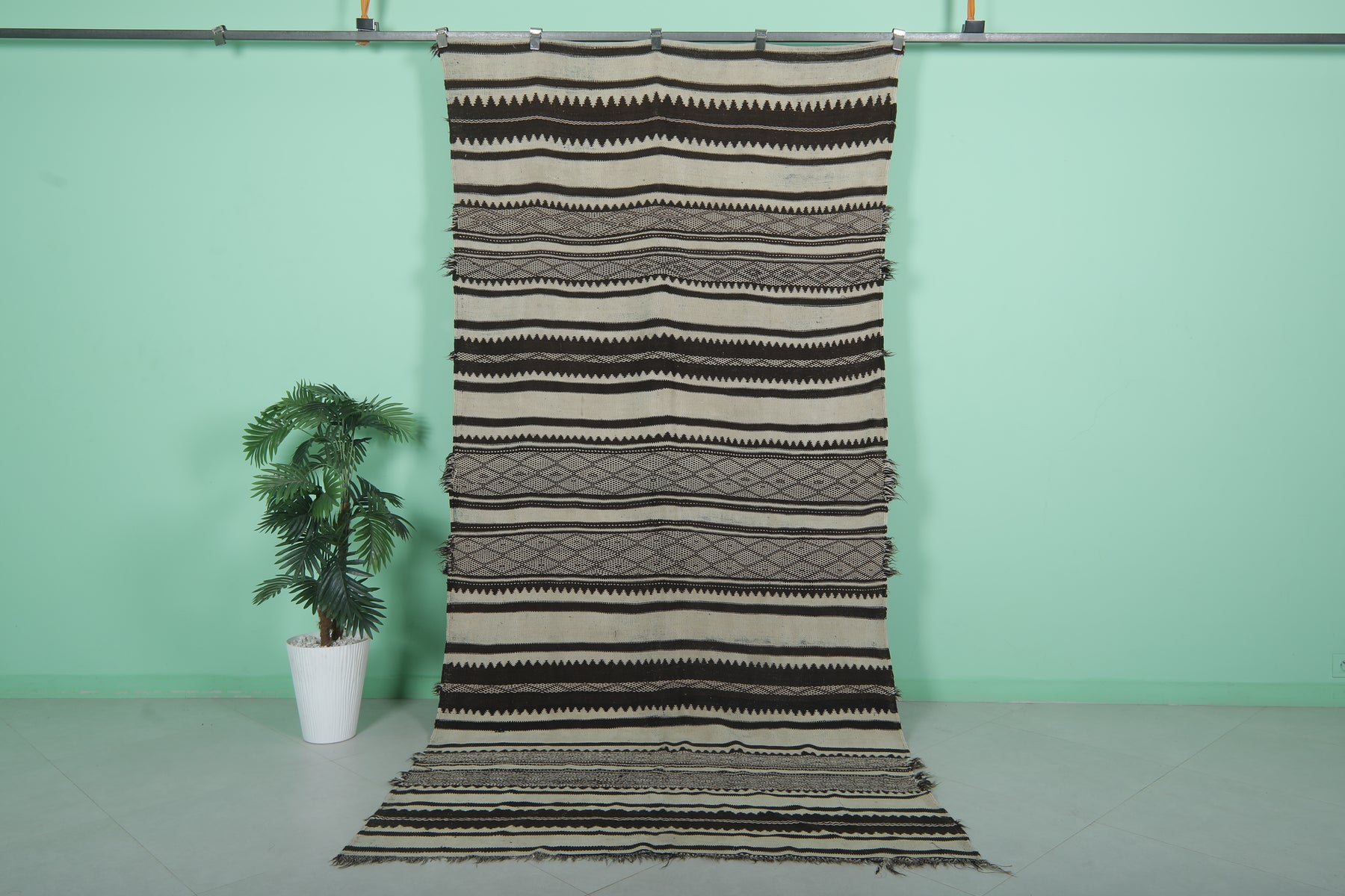 Handwoven Kilim Rug 4.9 FT x 10.7 FT – Elegant Black and White Design