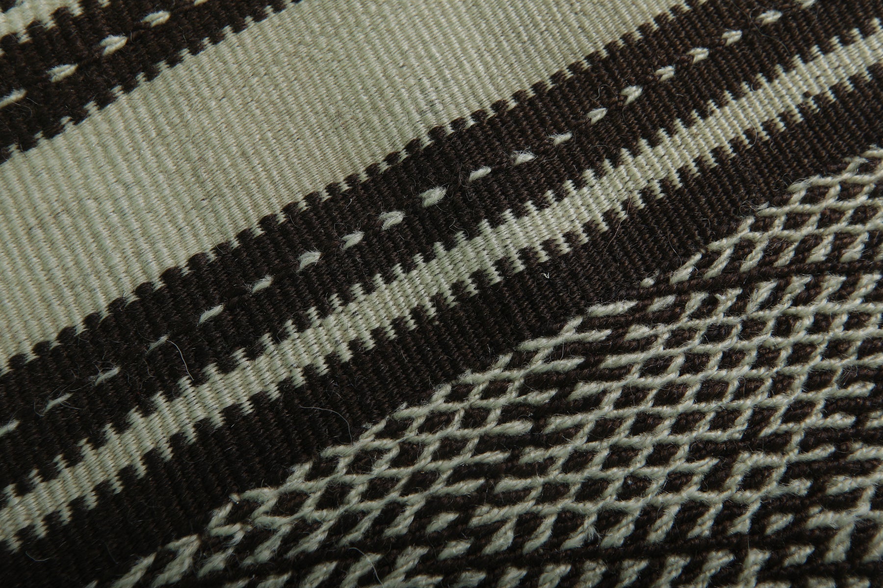 • Features bold horizontal patterns in black and off-white tones.