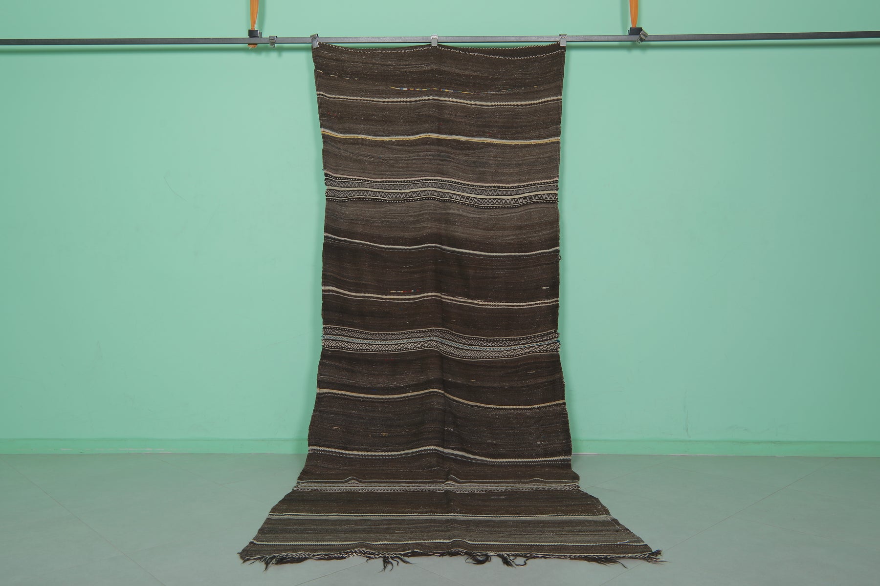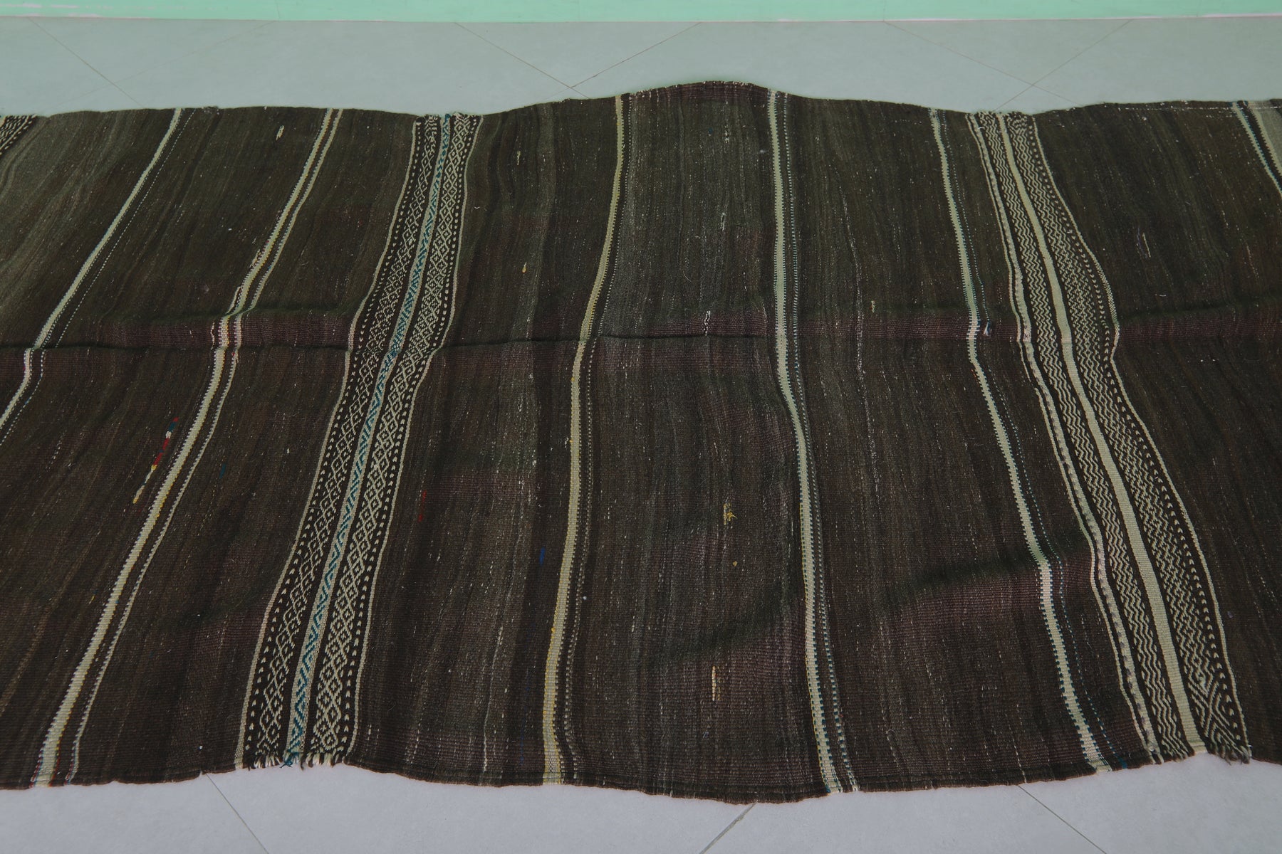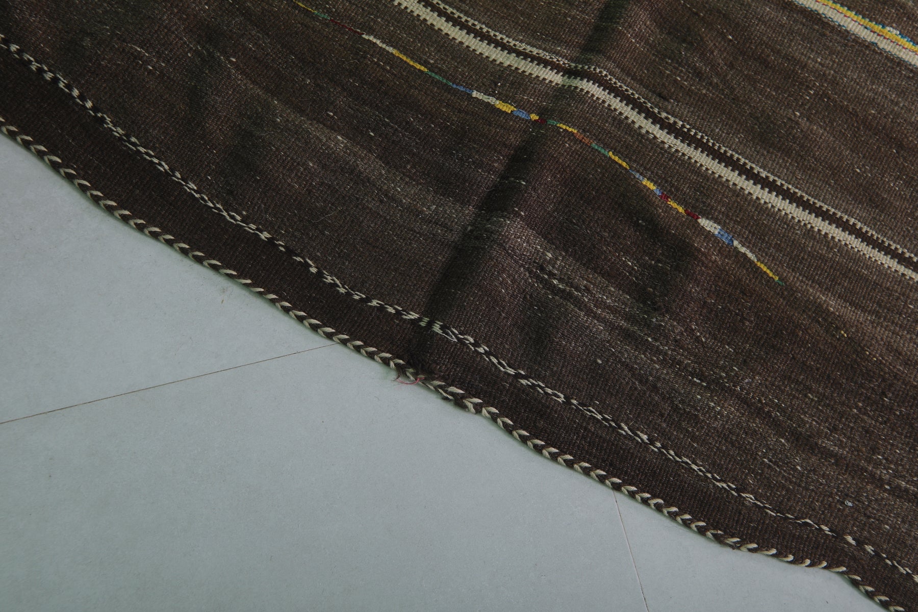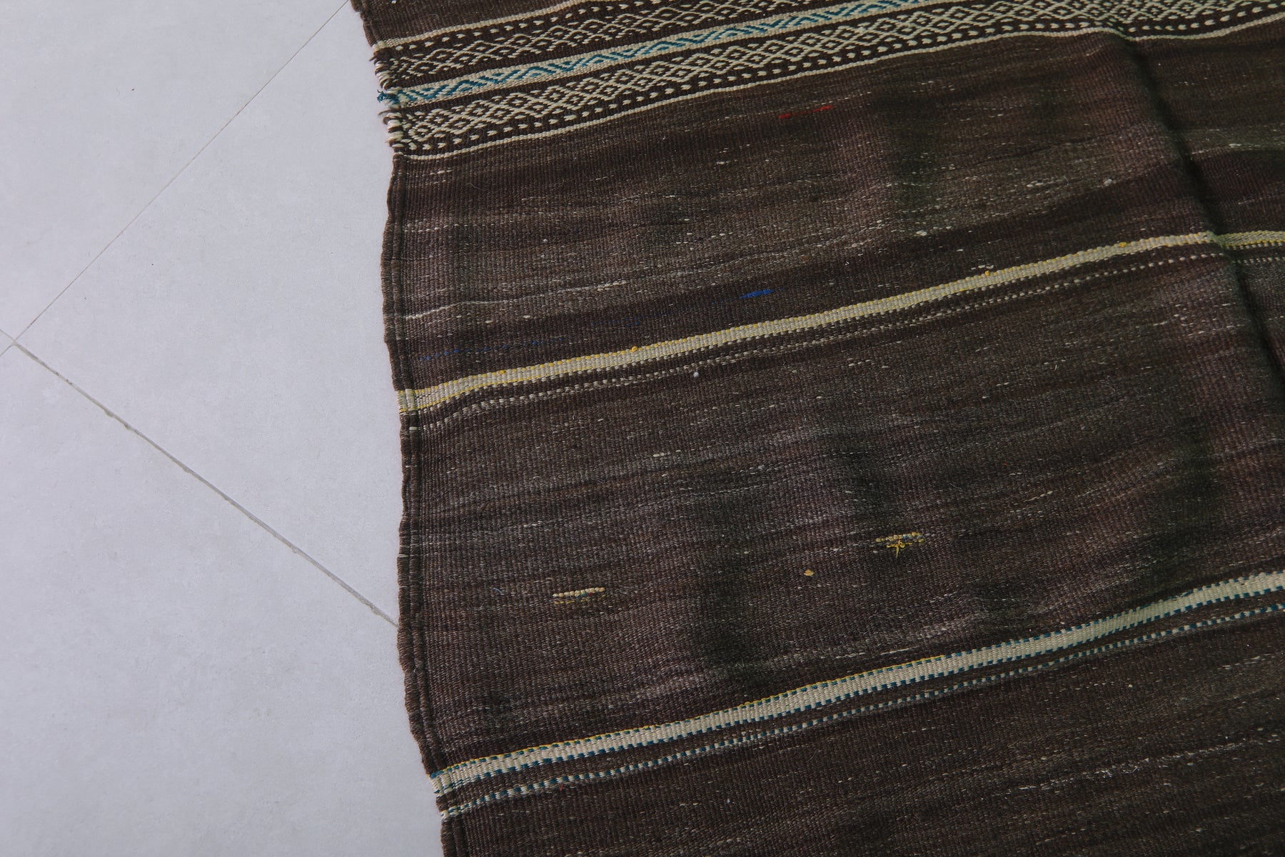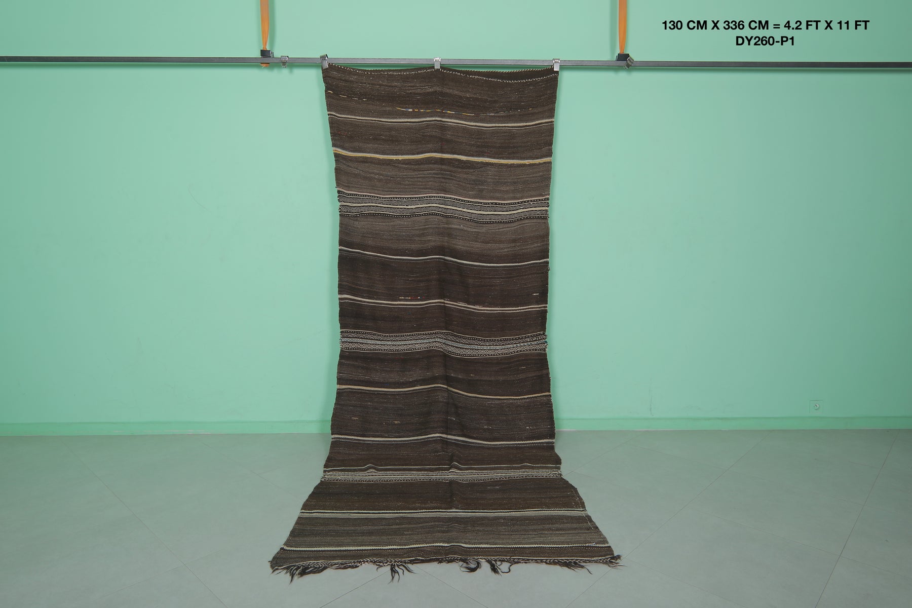 This 4.2 x 11 feet Handwoven Moroccan Kilim rug features a deep brown base with subtle striped accents, creating a grounded, earthy aesthetic. Its narrow and elongated shape is ideal for hallways, runners, or transitional spaces in both rustic and contemporary interiors.