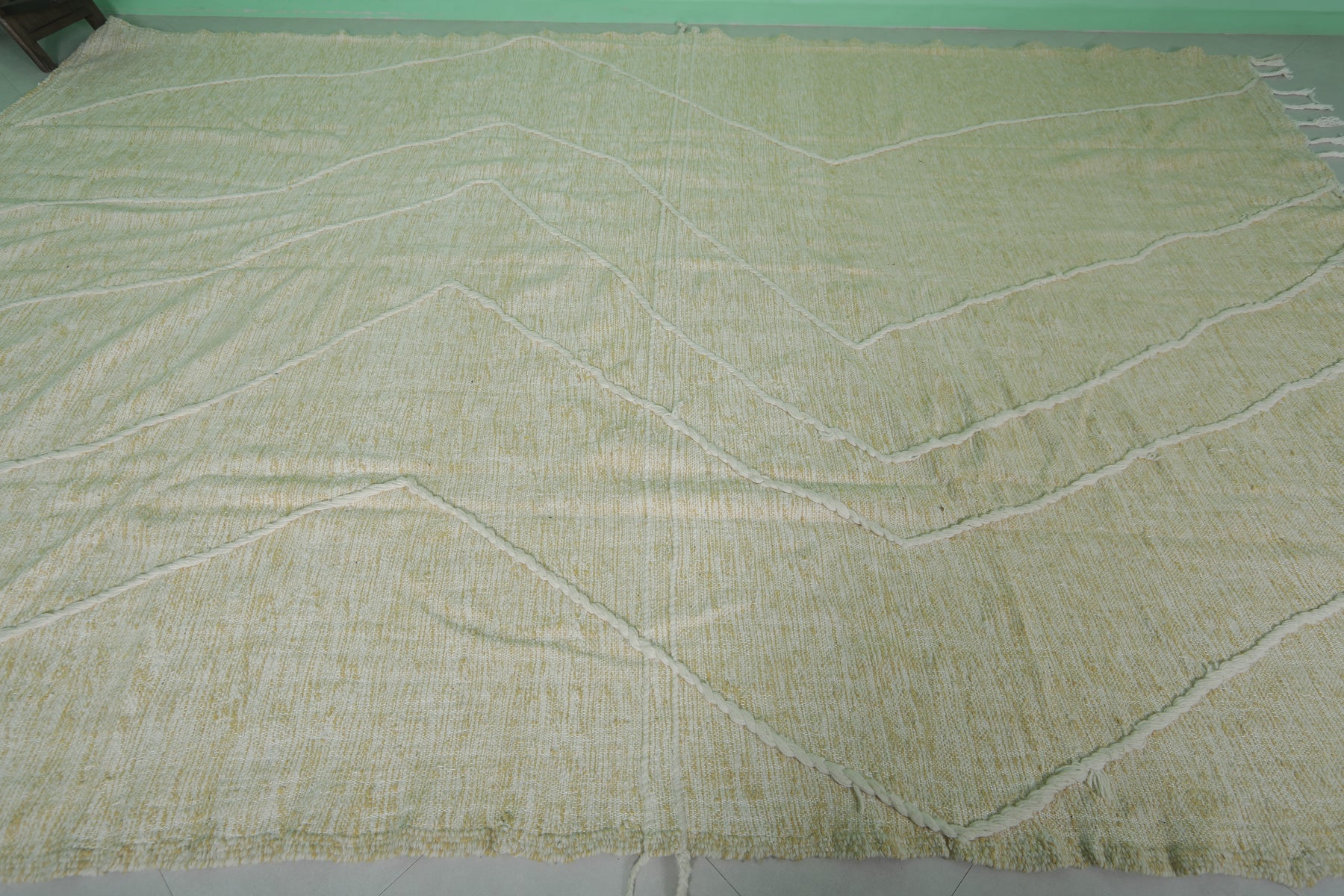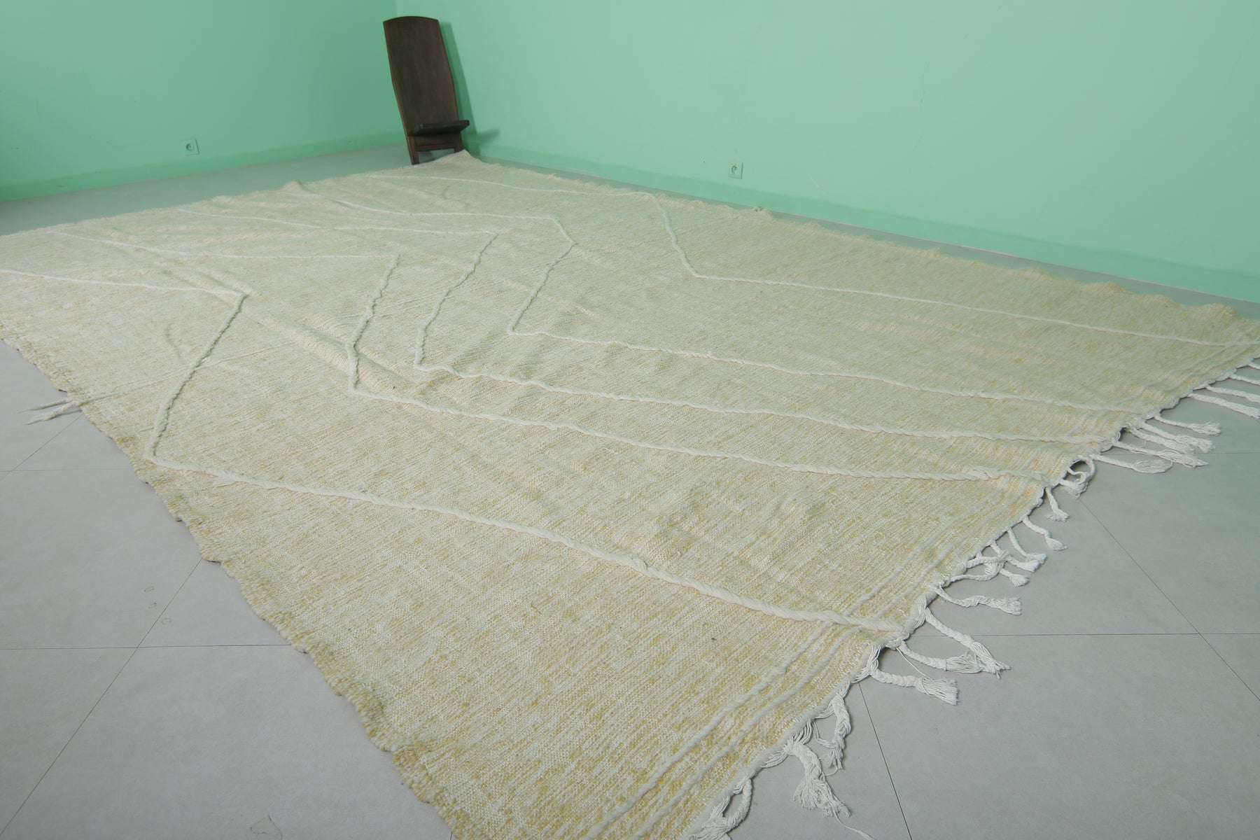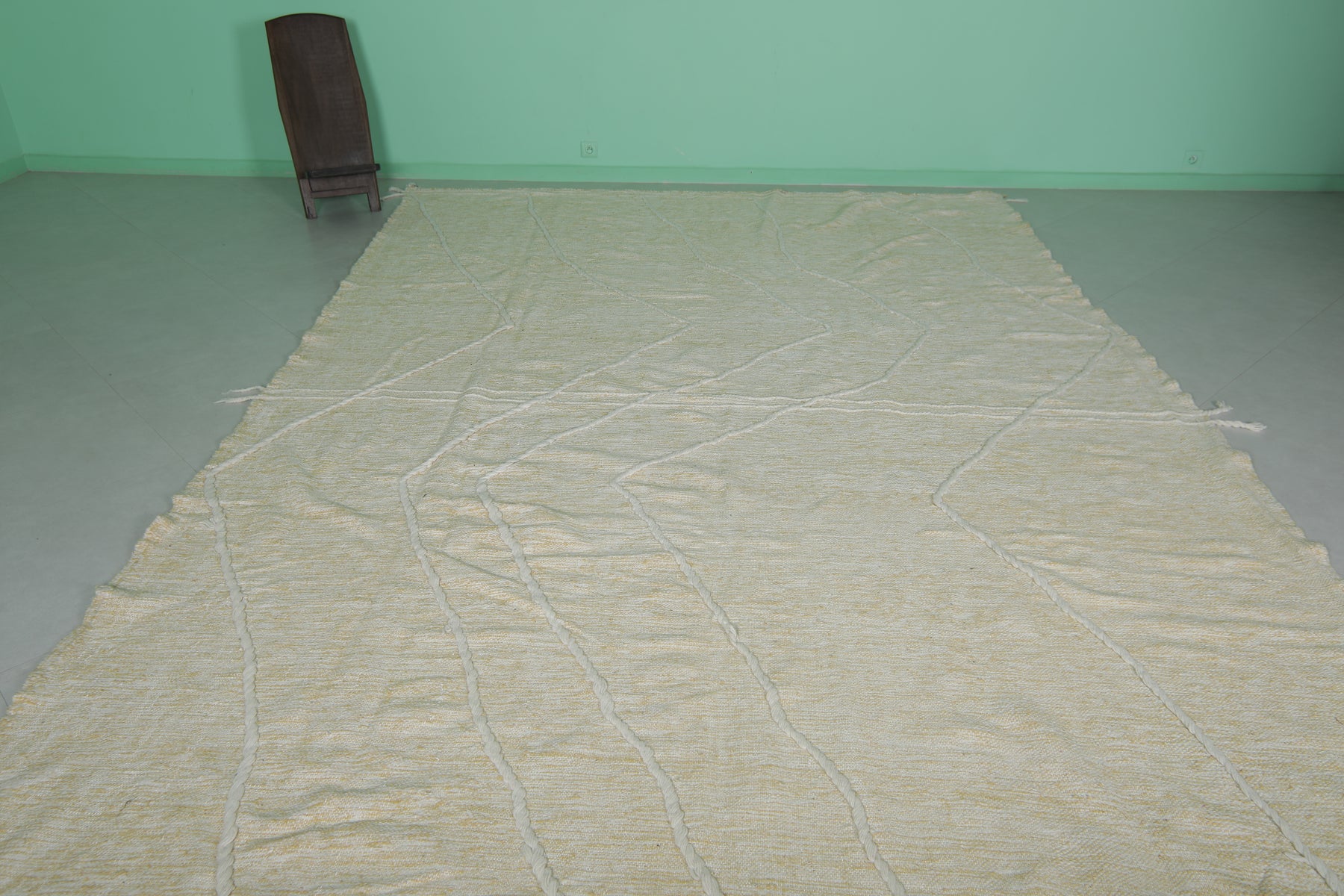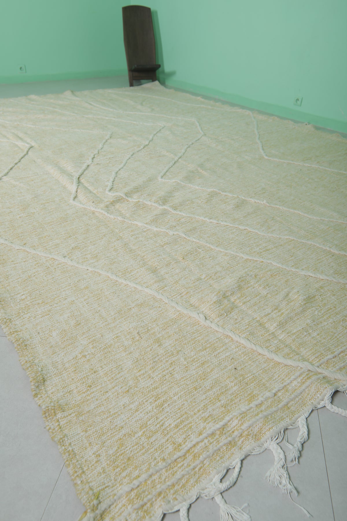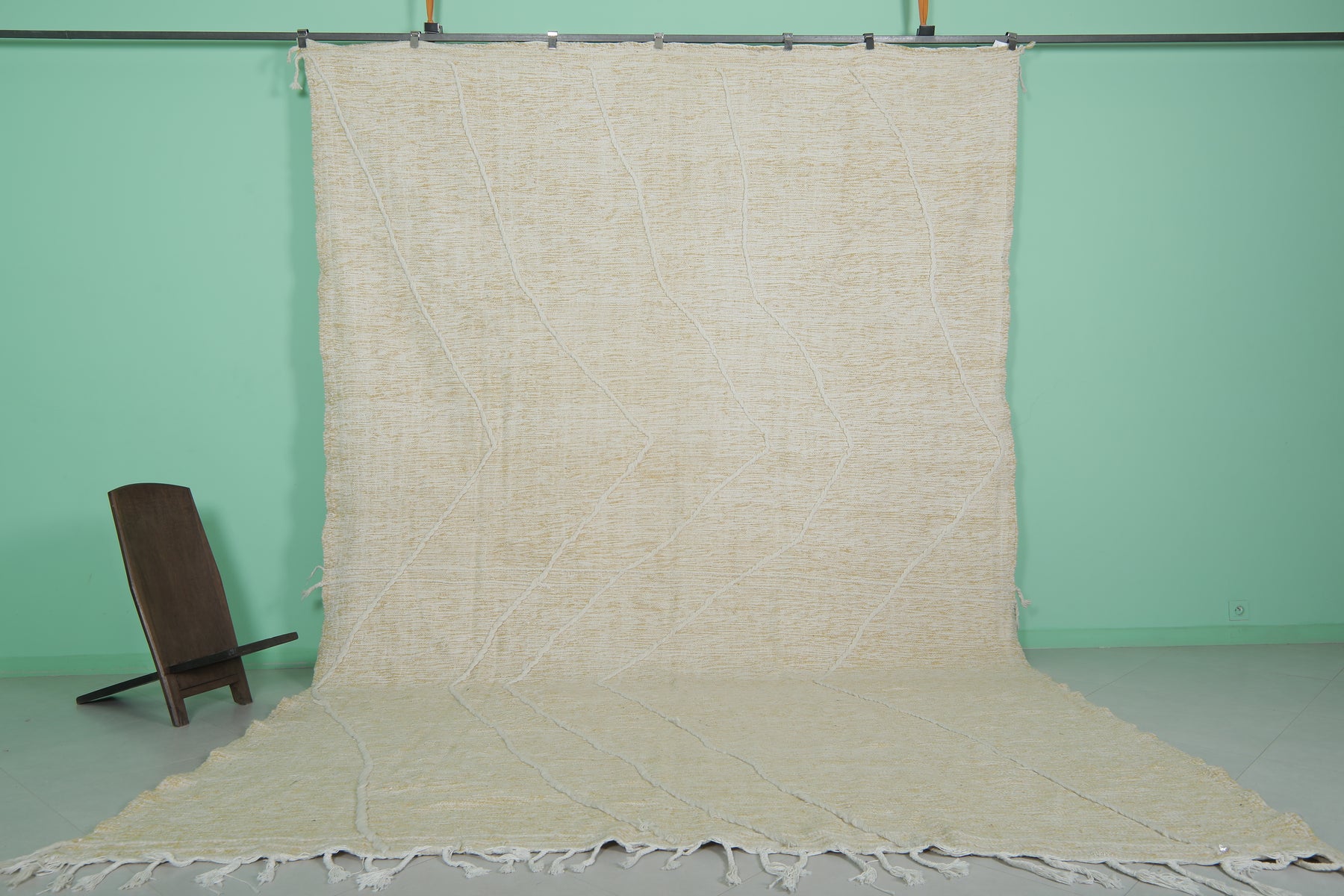 This 9.5 x 13.9 feet oversized Moroccan Berber Kilim rug showcases a subtle geometric design in a natural tone, blending traditional craftsmanship with modern elegance. Handwoven from premium wool, it provides a soft texture and durable quality, making it ideal for spacious living rooms, dining areas, or master bedrooms.