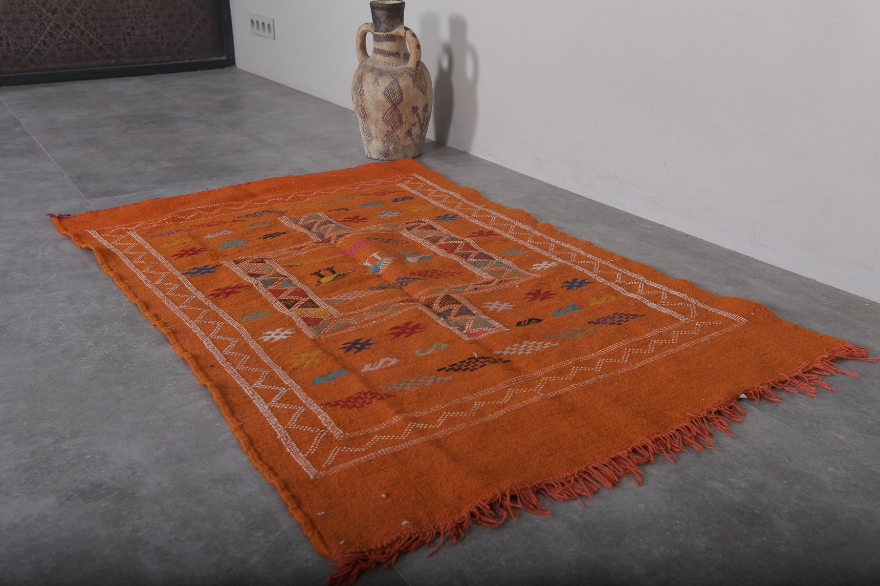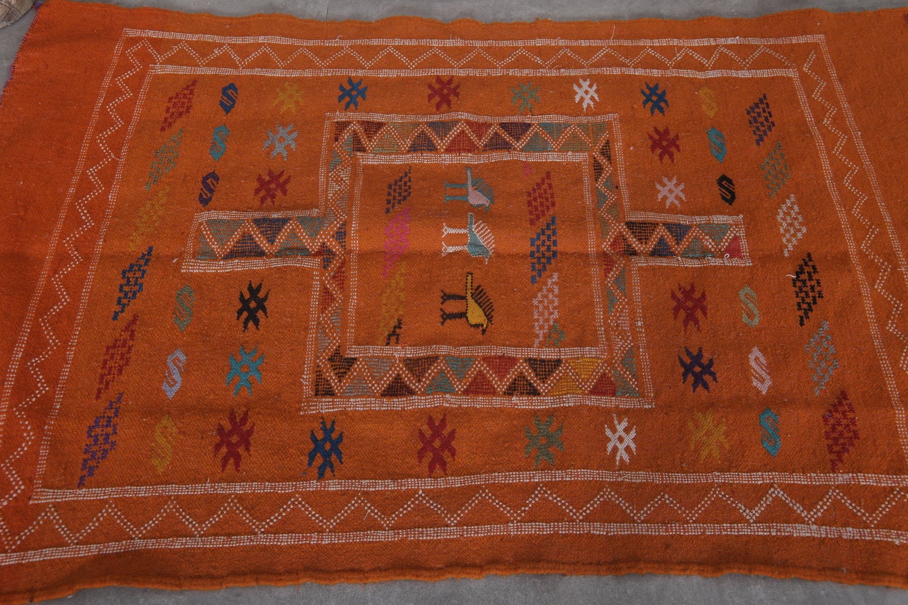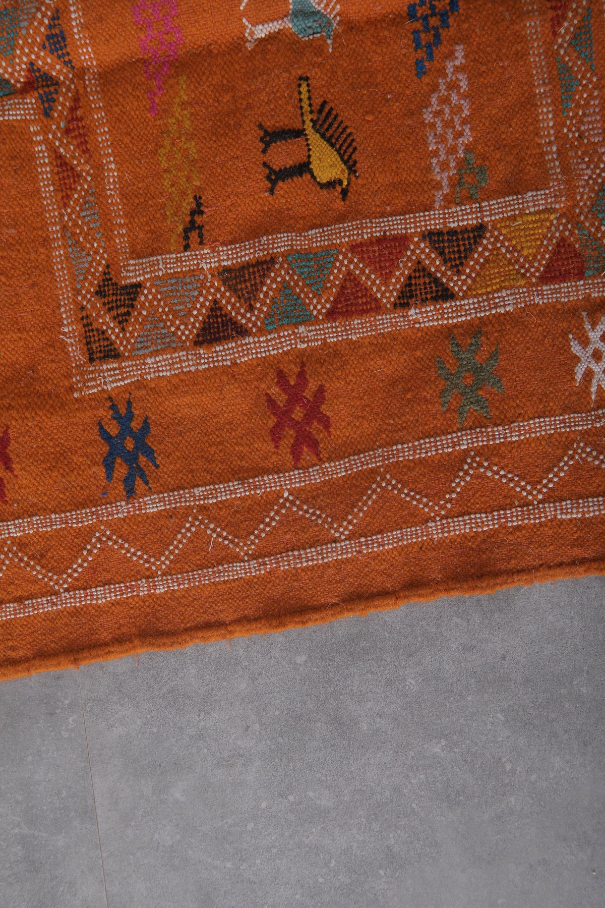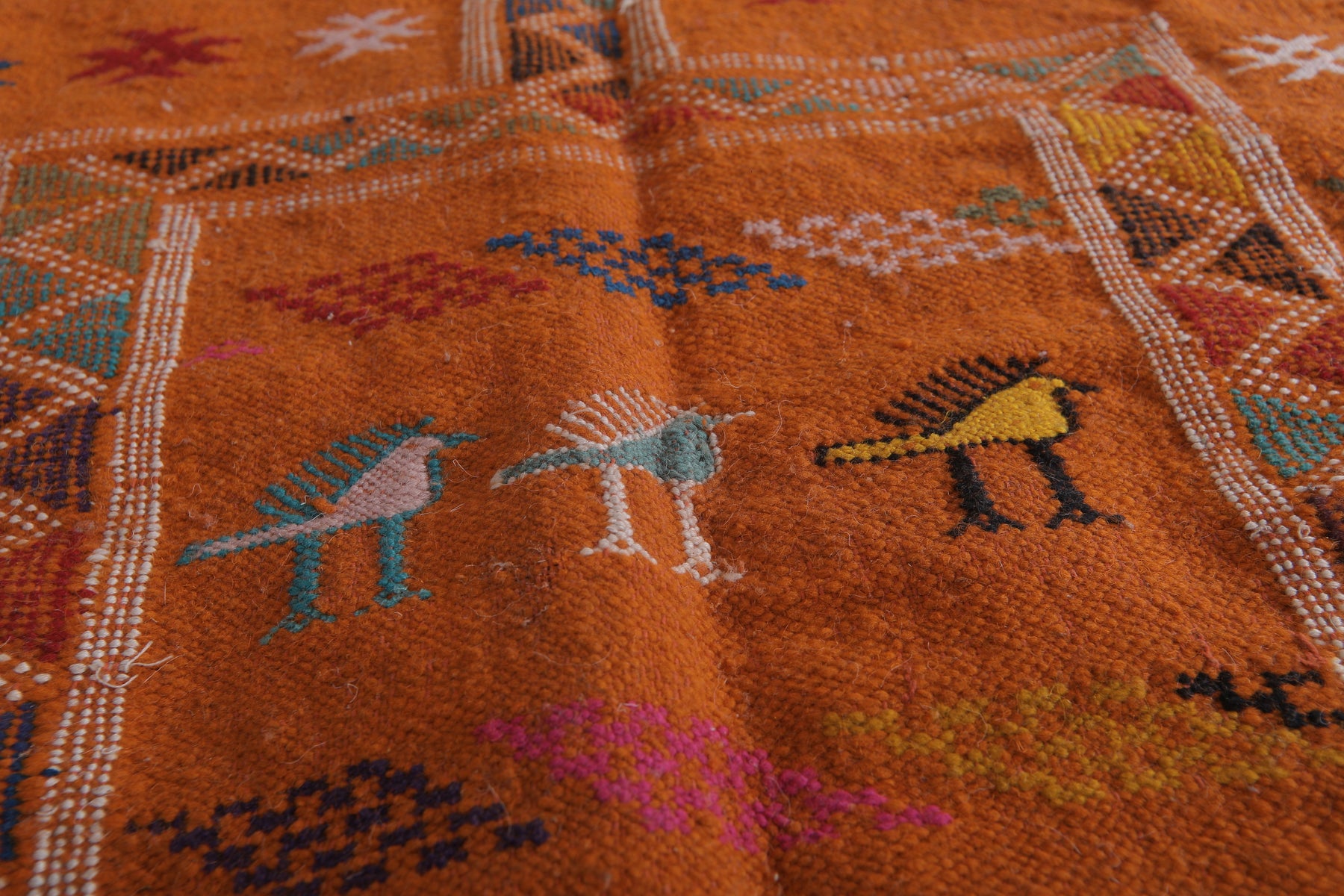 This 3 x 4.9 feet handwoven Moroccan rug bursts with vibrant color and intricate patterns, bringing warmth and cultural charm to any space. Featuring traditional geometric designs on a rich orange base, this rug is a stunning statement piece. Its compact size makes it ideal for entryways, bedside areas, or as an accent in living spaces.