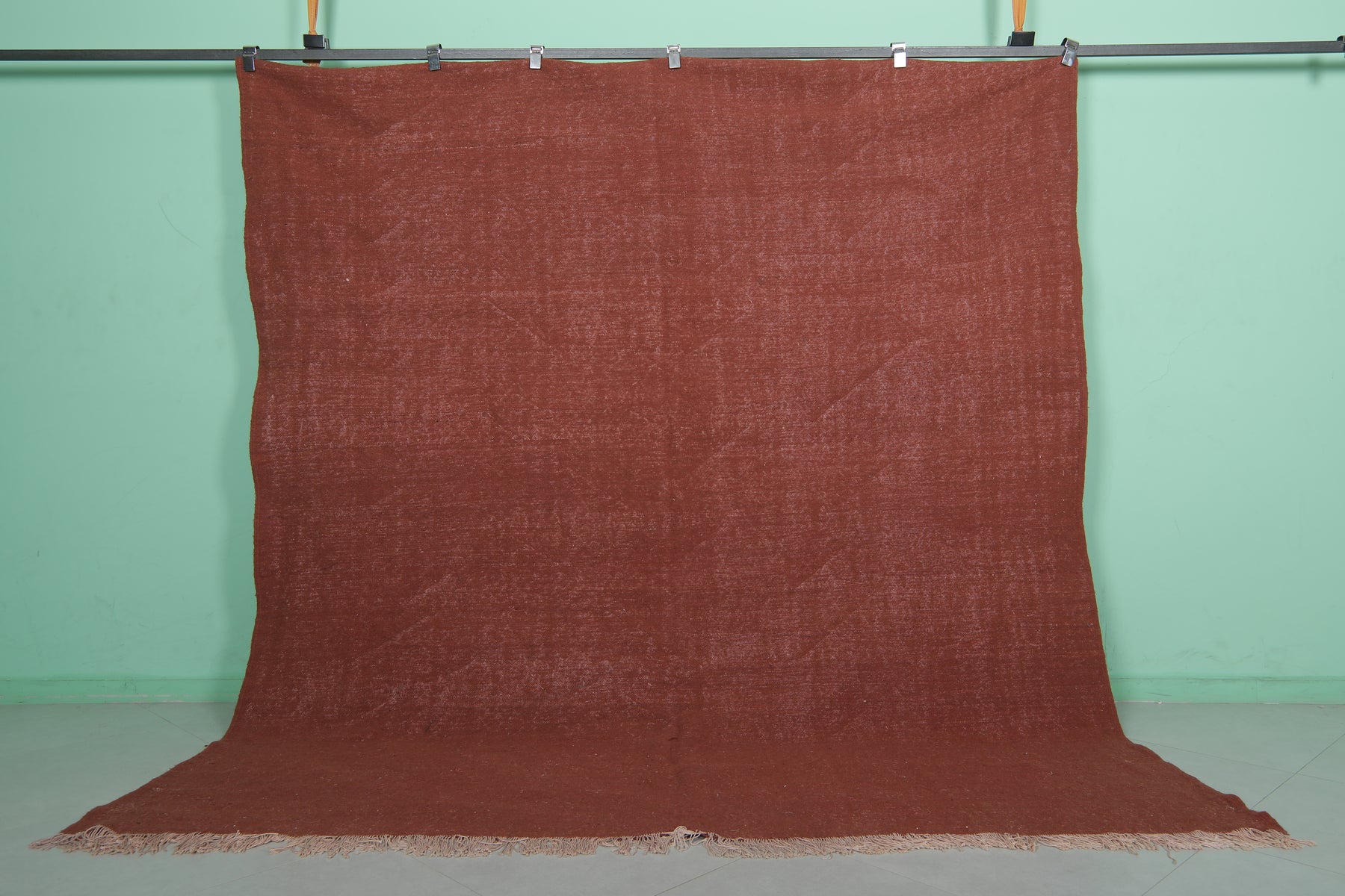 This 8 x 9 feet handwoven Moroccan wool rug brings warm, rustic charm with its rich terracotta hue and subtle texture. A seamless blend of traditional craftsmanship and modern elegance, it enhances bohemian, farmhouse, and contemporary interiors effortlessly.