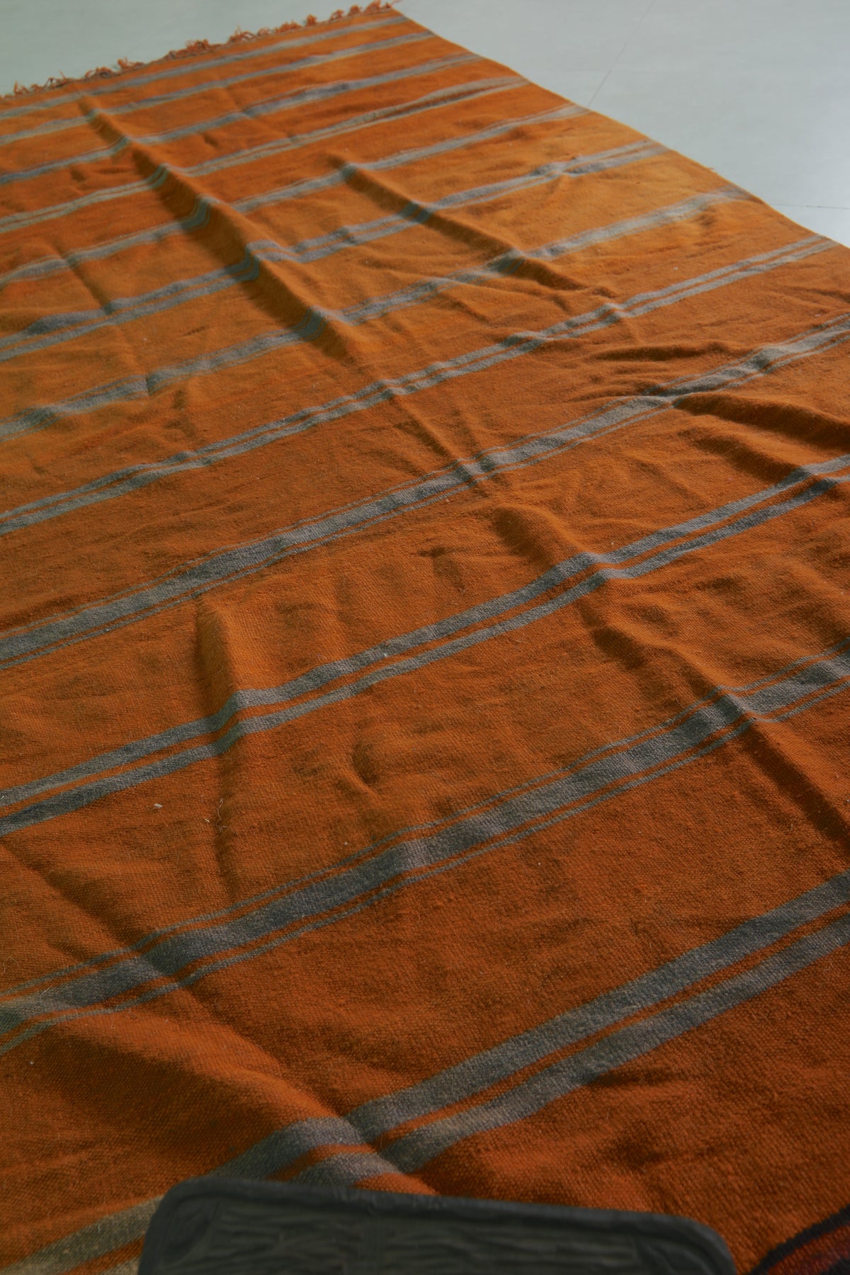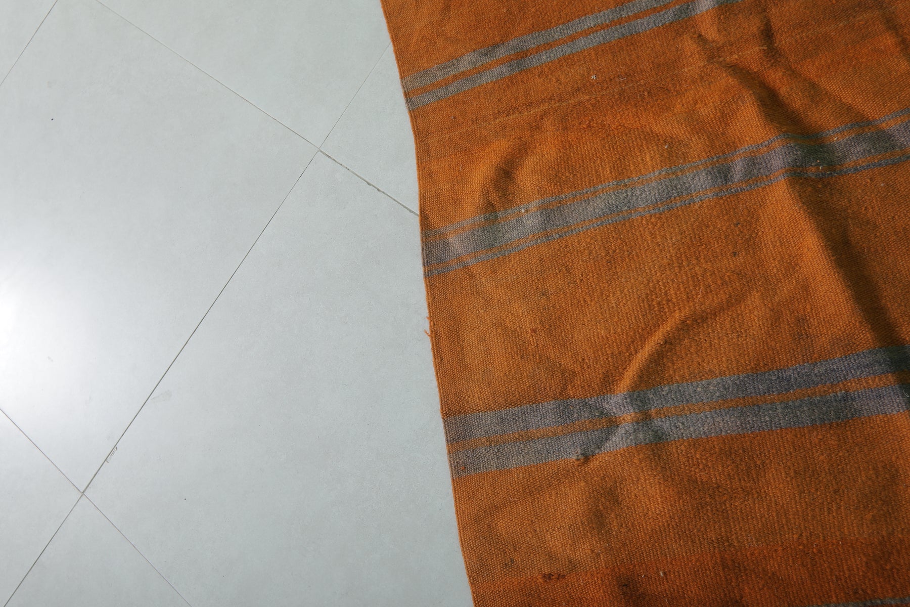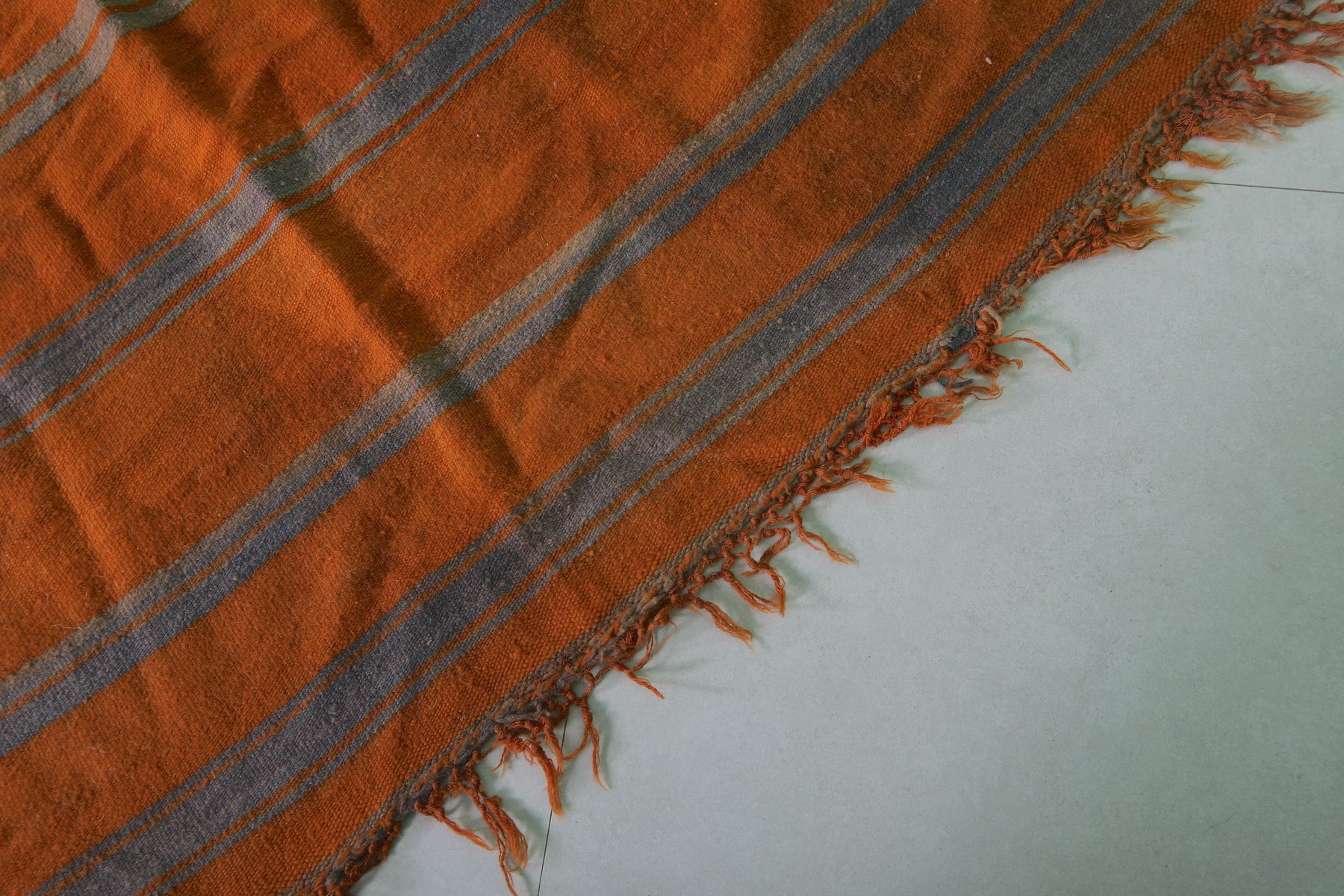 This 5.4 x 9.4 feet handwoven Moroccan wool rug features a striking striped design in warm earthy tones. Crafted by skilled artisans using 100% natural wool, it showcases a beautiful blend of rich orange and subtle gray stripes, making it a perfect statement piece for both modern and rustic interiors. Its soft texture and durable weave add warmth and character to any space.