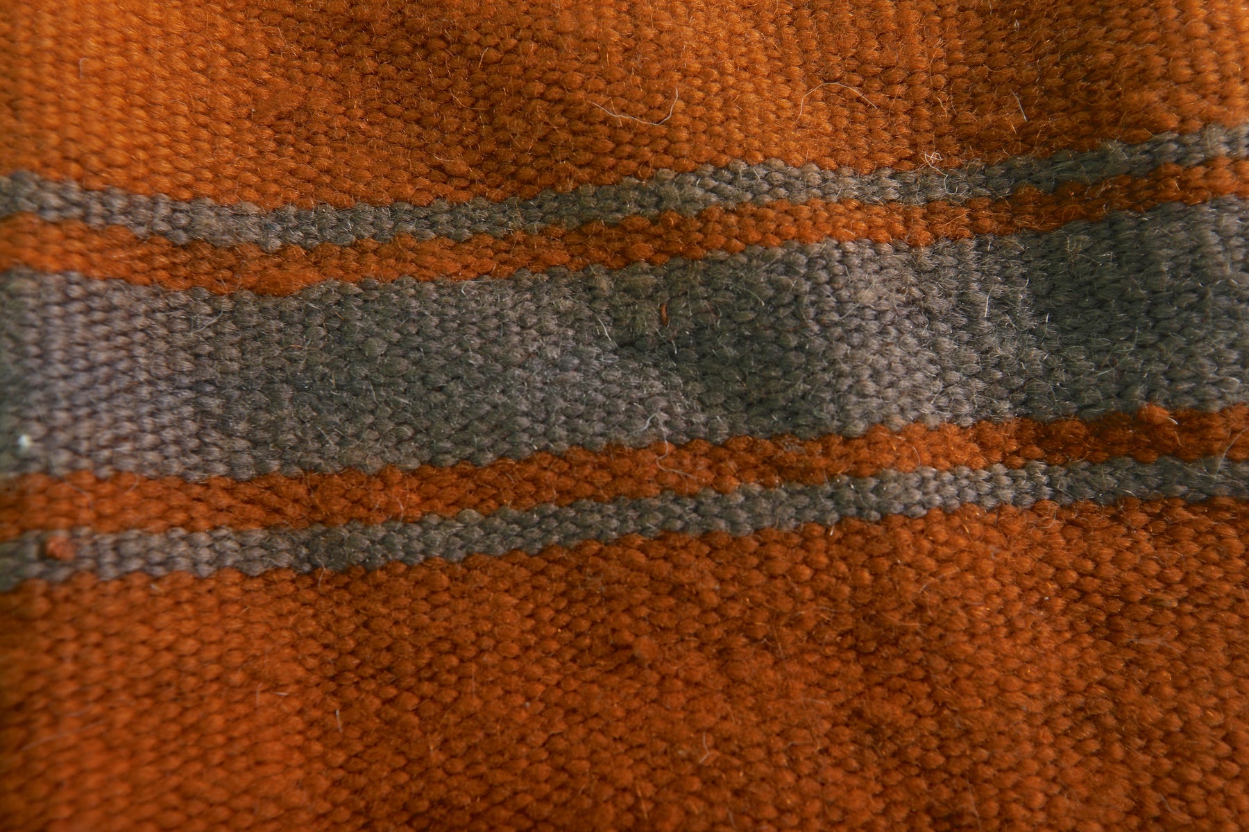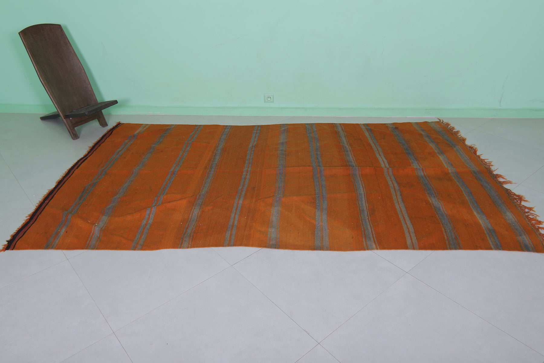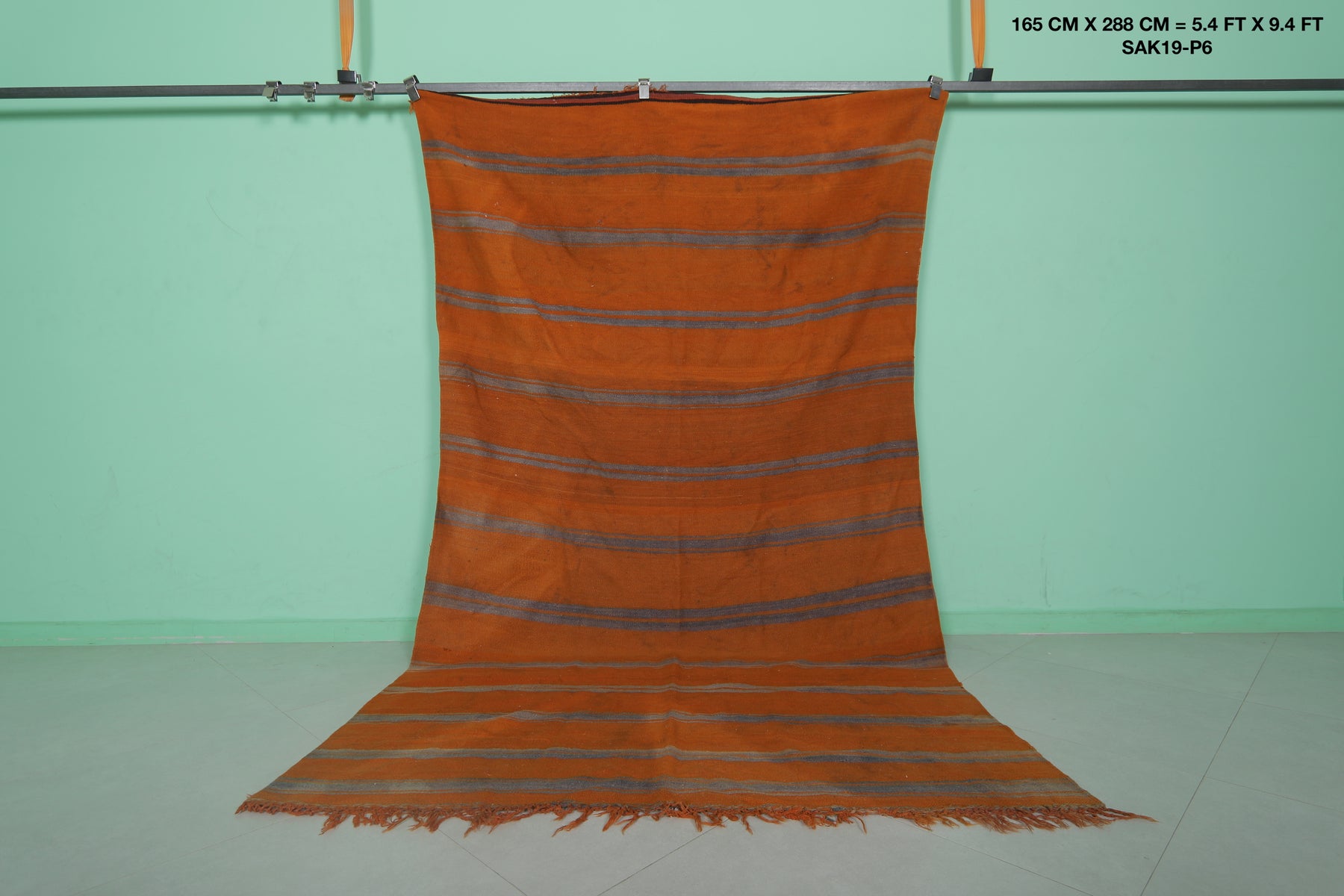 This 5.4 x 9.4 feet handwoven Moroccan wool rug features a striking striped design in warm earthy tones. Crafted by skilled artisans using 100% natural wool, it showcases a beautiful blend of rich orange and subtle gray stripes, making it a perfect statement piece for both modern and rustic interiors. Its soft texture and durable weave add warmth and character to any space.