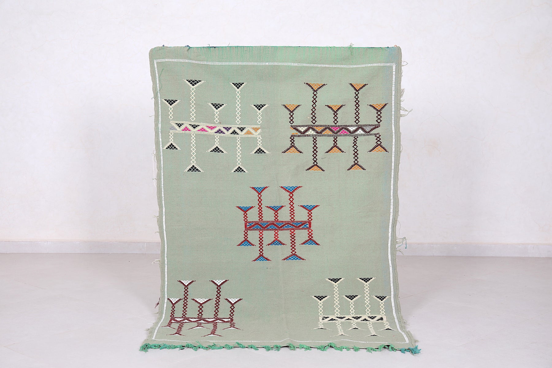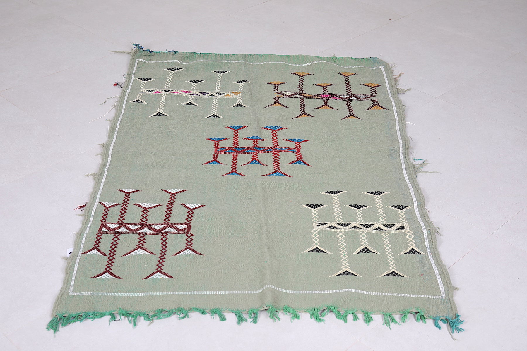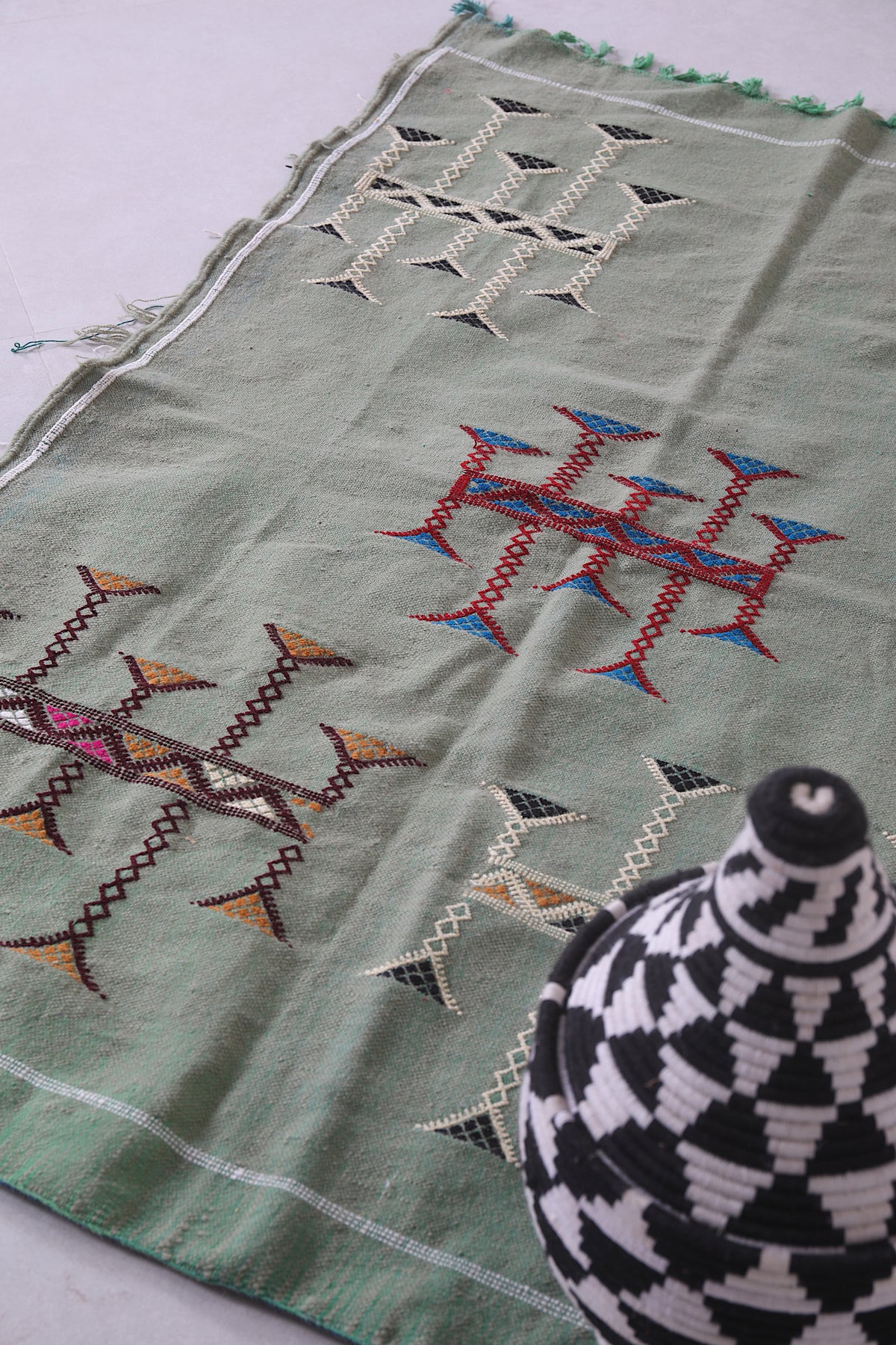 Small Green Kilim Rug 3.3 ft x 5 ft - Handwoven Moroccan Design