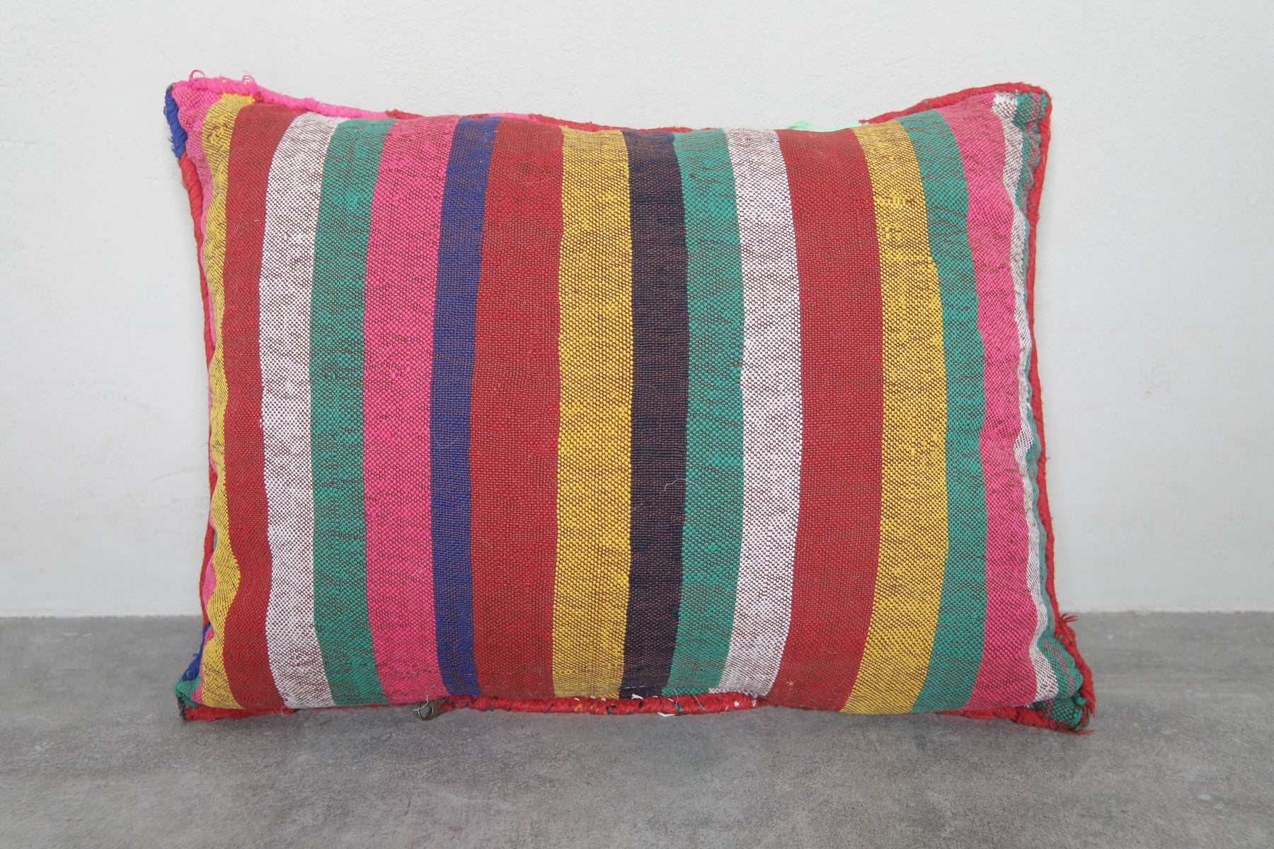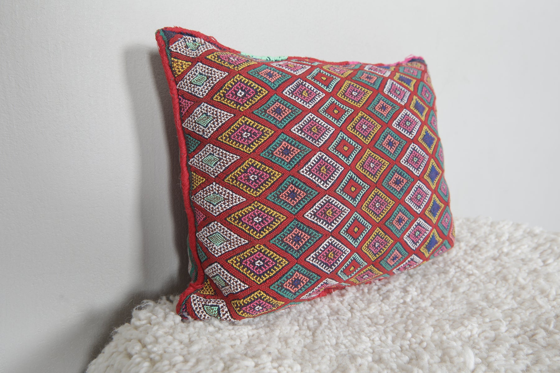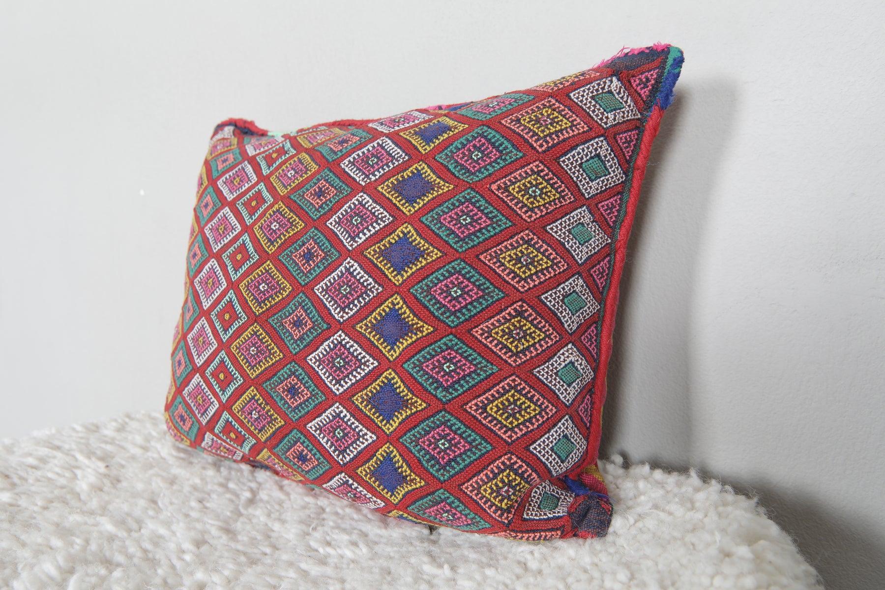 Add a bold splash of color to your home with this Moroccan kilim pillow. Featuring intricate diamond patterns in vivid hues of red, pink, green, blue, and yellow, this handwoven pillow is a celebration of Moroccan craftsmanship. Perfect for brightening up sofas, chairs, or beds. Dimensions: 13.3 x 18.1 inches.