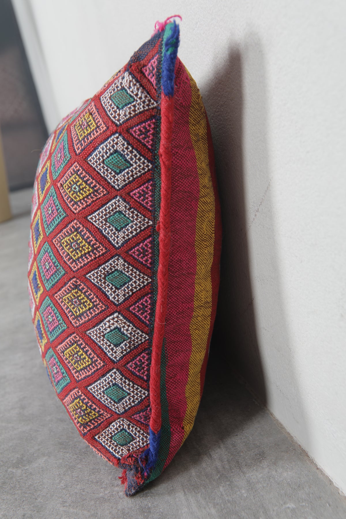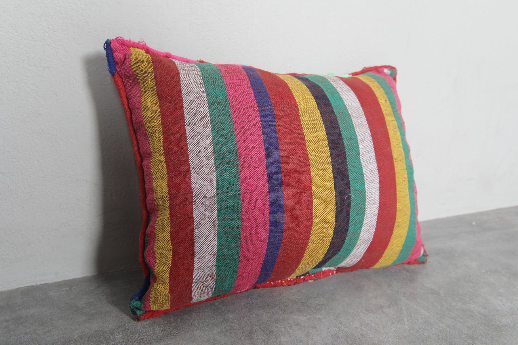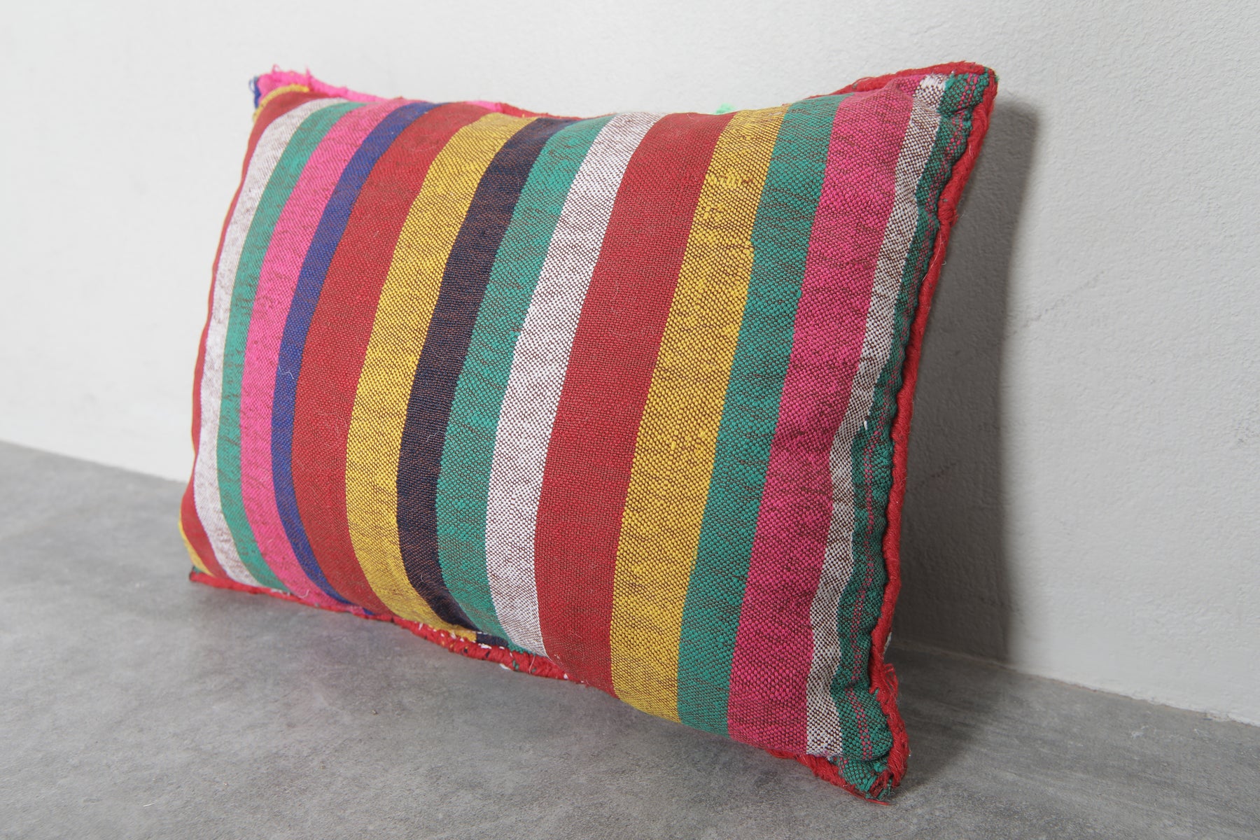 Add a bold splash of color to your home with this Moroccan kilim pillow. Featuring intricate diamond patterns in vivid hues of red, pink, green, blue, and yellow, this handwoven pillow is a celebration of Moroccan craftsmanship. Perfect for brightening up sofas, chairs, or beds. Dimensions: 13.3 x 18.1 inches.