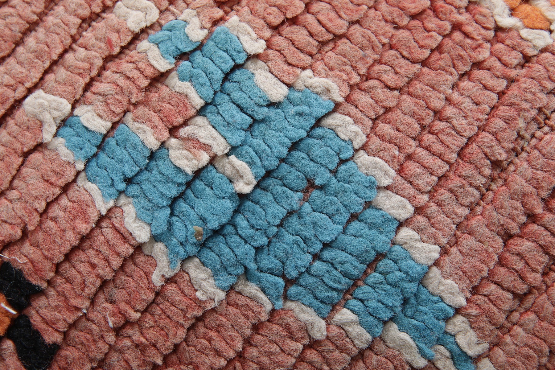 Brighten up your space with this handwoven Moroccan wool pouf, adorned with striking Berber motifs in a lively palette of peach, blue, yellow, and black. Crafted from vintage wool, this one-of-a-kind floor cushion is a fusion of artistry and functionality, offering a cozy seating option, stylish footrest, or statement decor piece. The intricate geometric patterns and richly textured surface embody traditional Moroccan craftsmanship, making it an ideal choice for adding warmth and character to any setting.