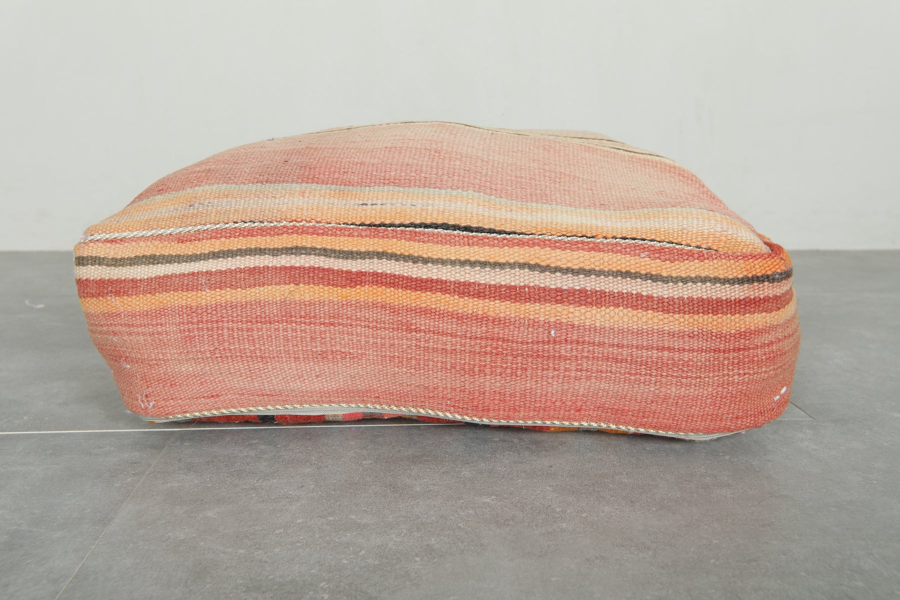 Add a warm, organic touch to your space with this handcrafted striped Moroccan Kilim pouf. Made from vintage wool rugs and naturally dyed fibers, this pouf showcases a sun-faded color palette of terracotta, dusty rose, golden yellow, and olive green. The handwoven stripes and earthy tones evoke a rustic, lived-in charm that fits effortlessly into bohemian, southwestern, or eclectic interiors.