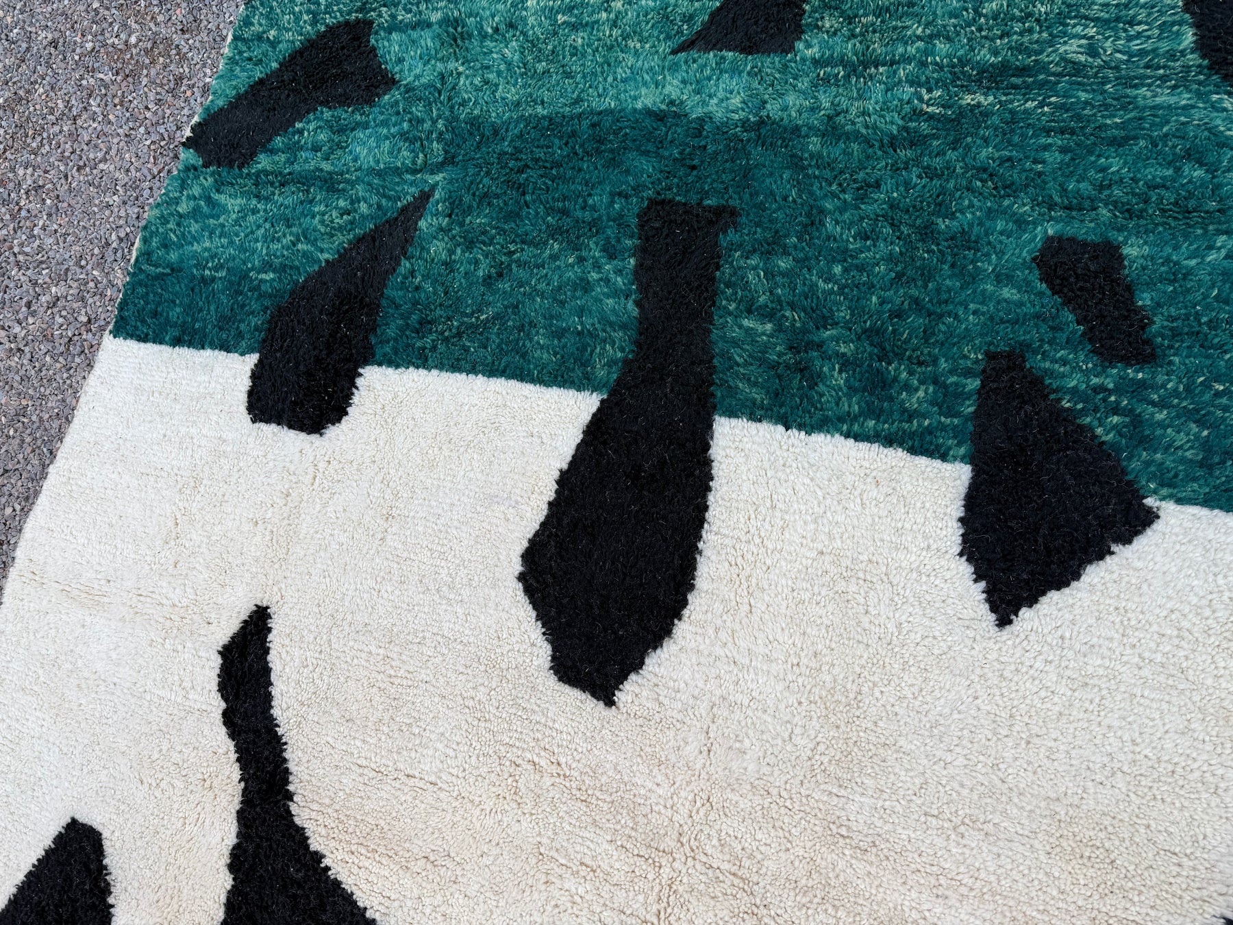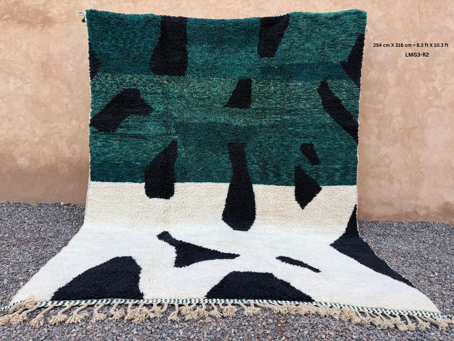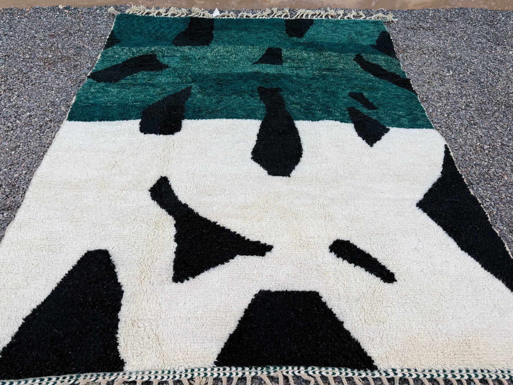 Add a bold artistic statement to your space with this abstract Moroccan rug, handcrafted from 100% natural wool. Featuring a dramatic fusion of deep forest green, jet black, and soft ivory, this piece transforms traditional Berber weaving into contemporary floor art.