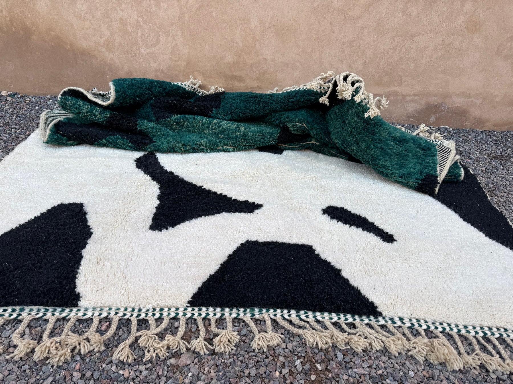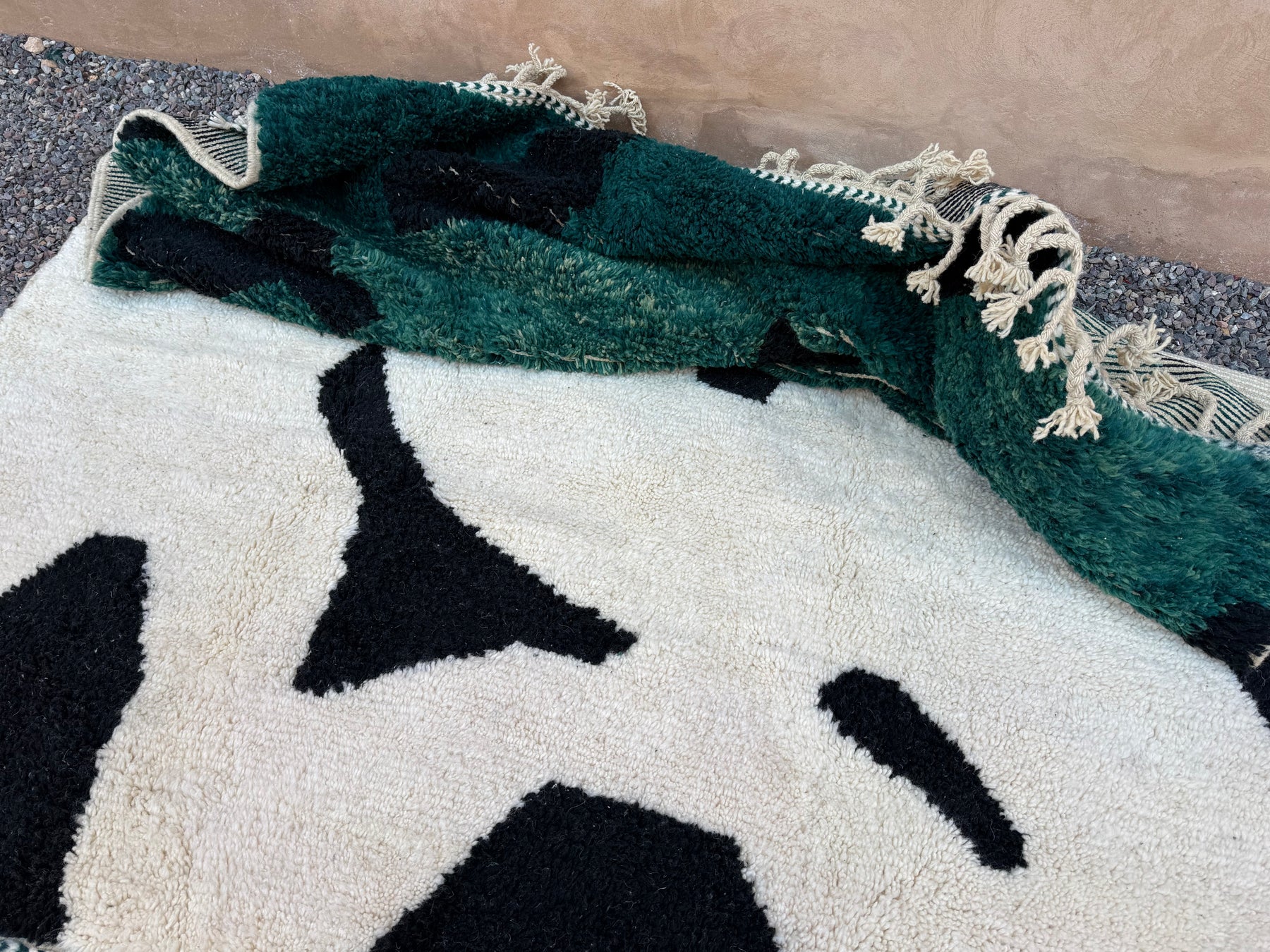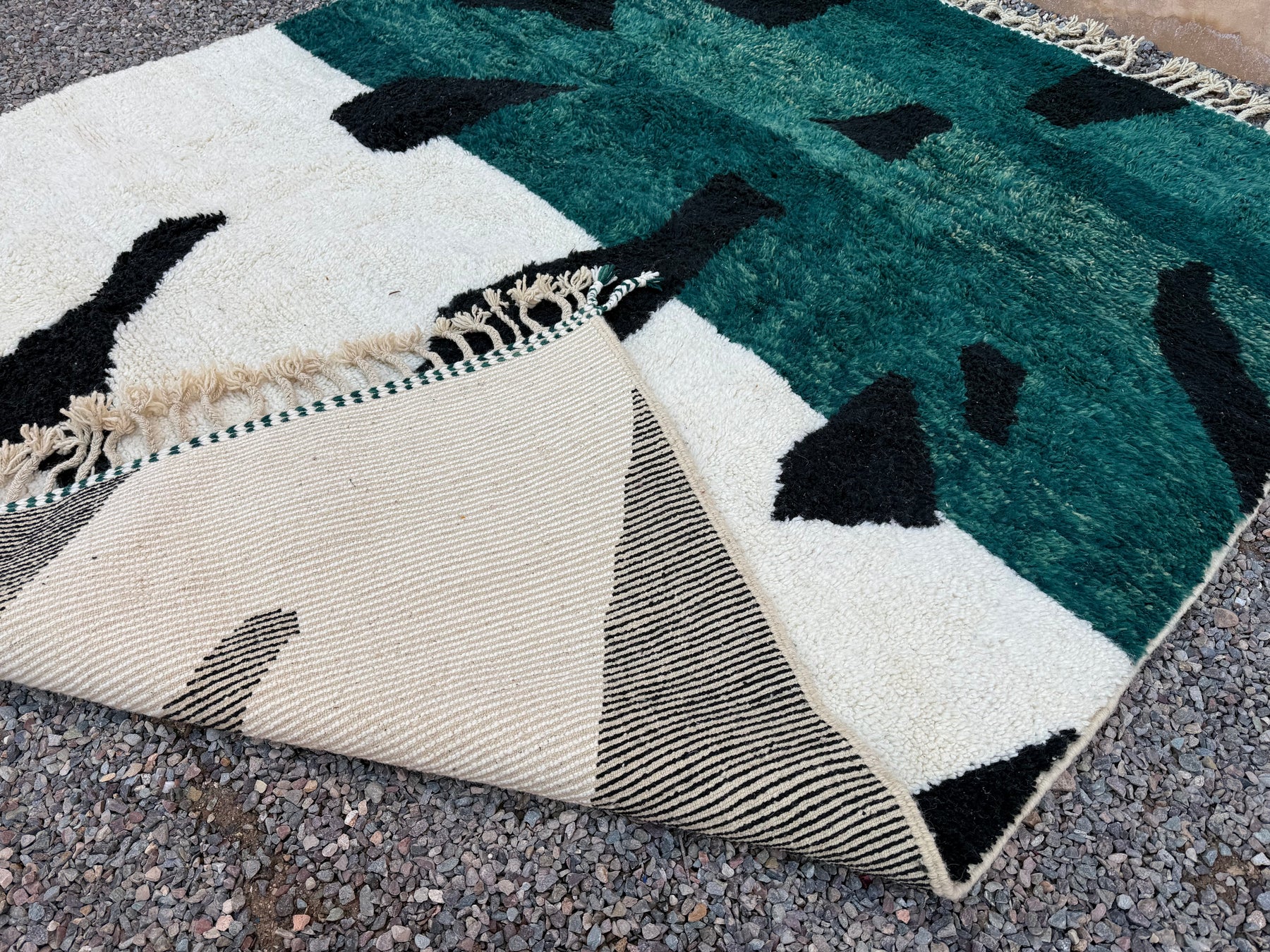 Add a bold artistic statement to your space with this abstract Moroccan rug, handcrafted from 100% natural wool. Featuring a dramatic fusion of deep forest green, jet black, and soft ivory, this piece transforms traditional Berber weaving into contemporary floor art.