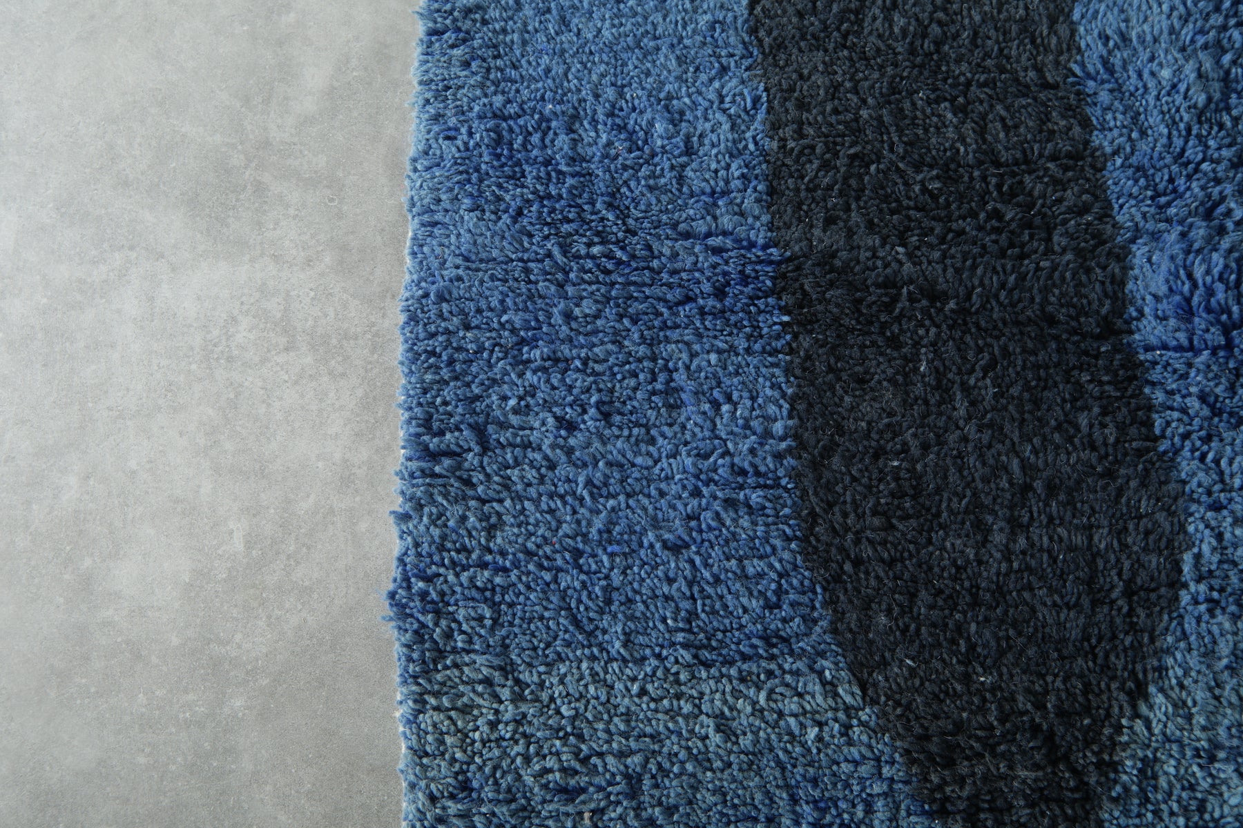 Elevate your home with this blue and black Beni Ourain rug, handwoven from natural wool by Berber artisans in Morocco. Its soft cream base is enriched with bold geometric motifs in deep blue and black, creating a striking yet harmonious design. The medium size makes it versatile for styling in living rooms, bedrooms, or home offices, while the plush wool texture ensures warmth and comfort underfoot. Durable and authentically crafted, this handmade rug combines timeless Moroccan heritage with a modern edge, making it a unique statement piece for your interior.