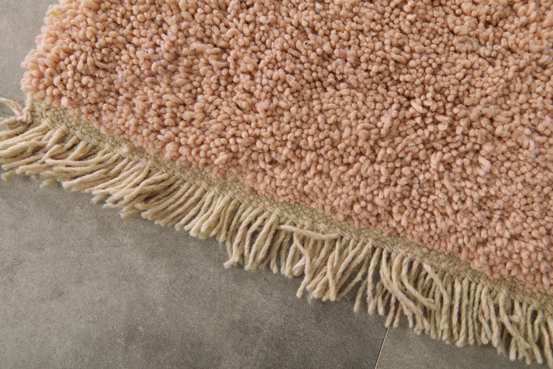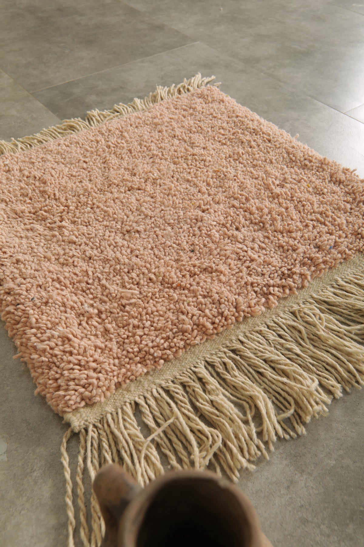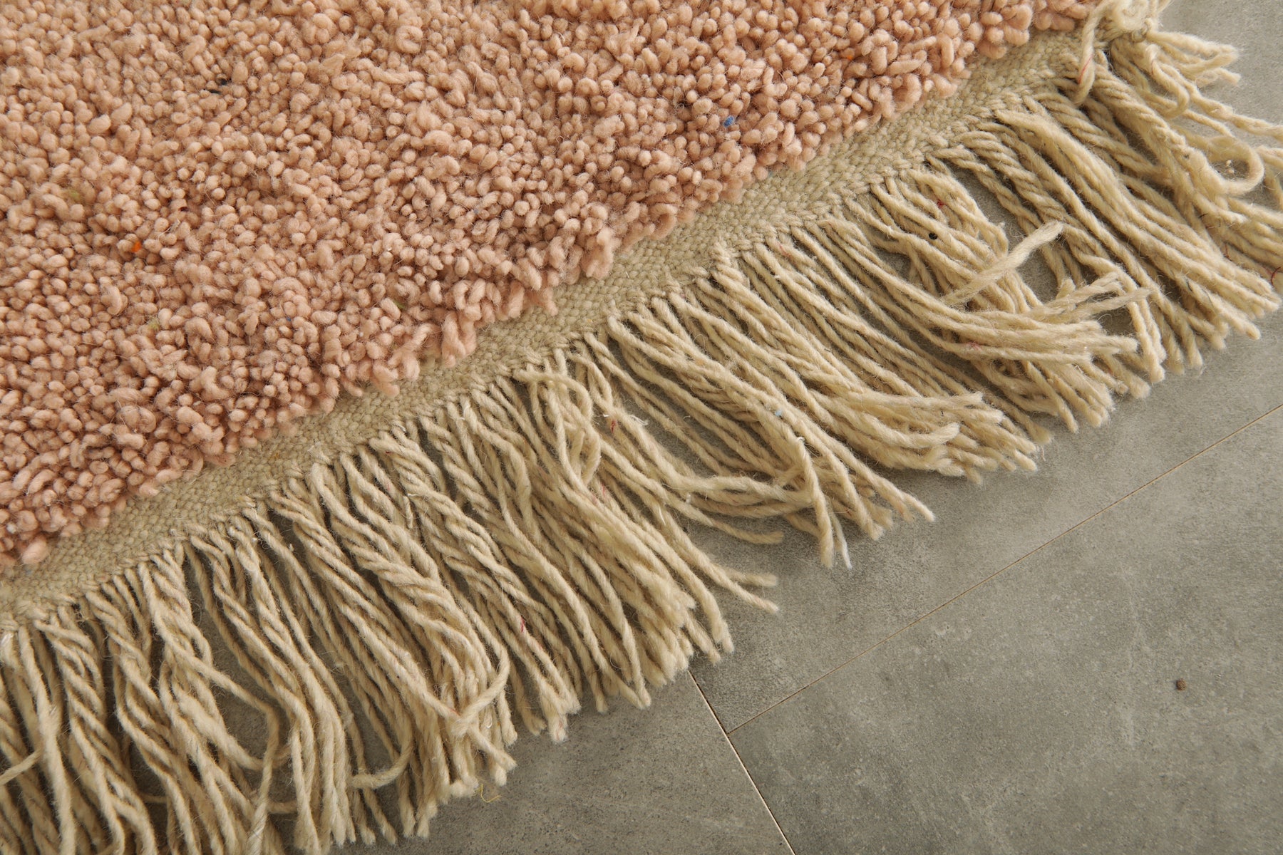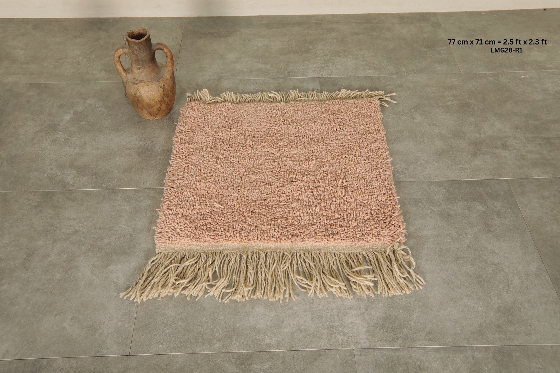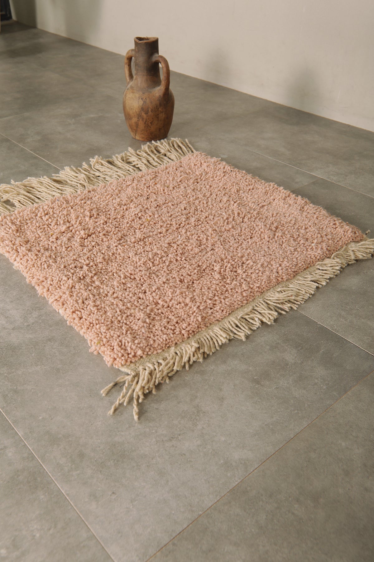 Add a touch of understated elegance to your space with this handwoven small Moroccan rug in a soft blush pink tone. Crafted from 100% natural wool, this cozy and durable rug features a plush texture and decorative fringe edges. Its muted color makes it a perfect accent piece for minimalist, bohemian, or Scandinavian-style interiors. Ideal for entryways, bedside spaces, or reading nooks, this artisanal rug brings warmth and texture to any corner of your home.