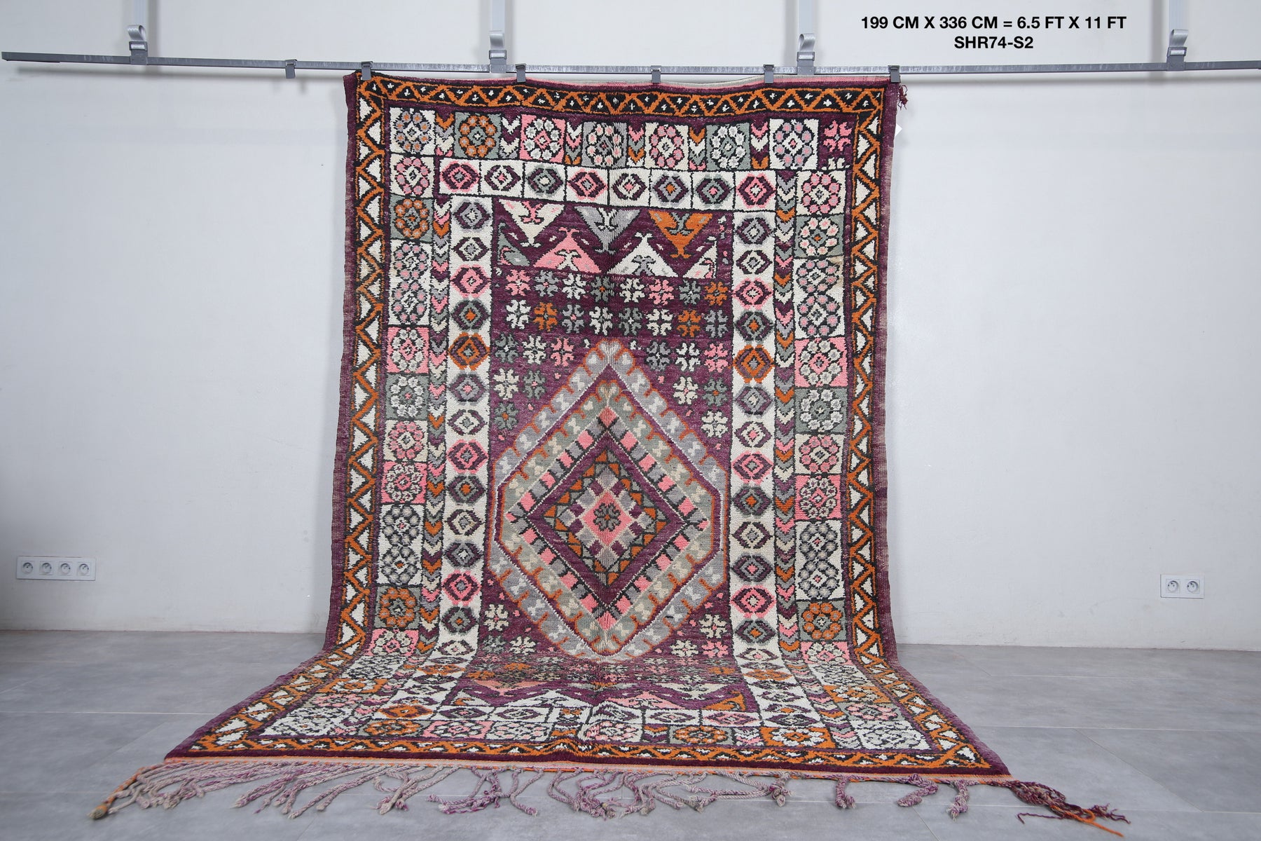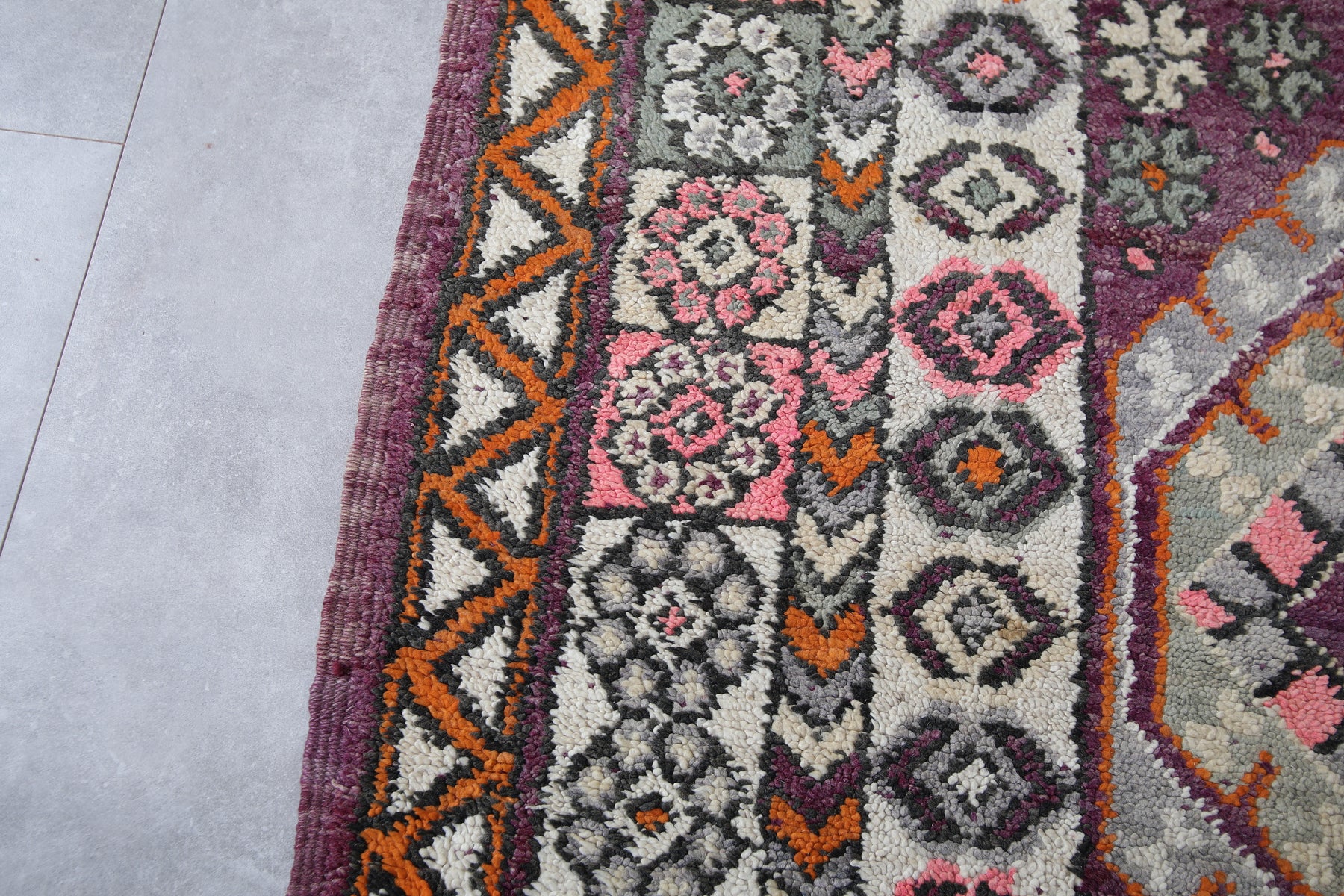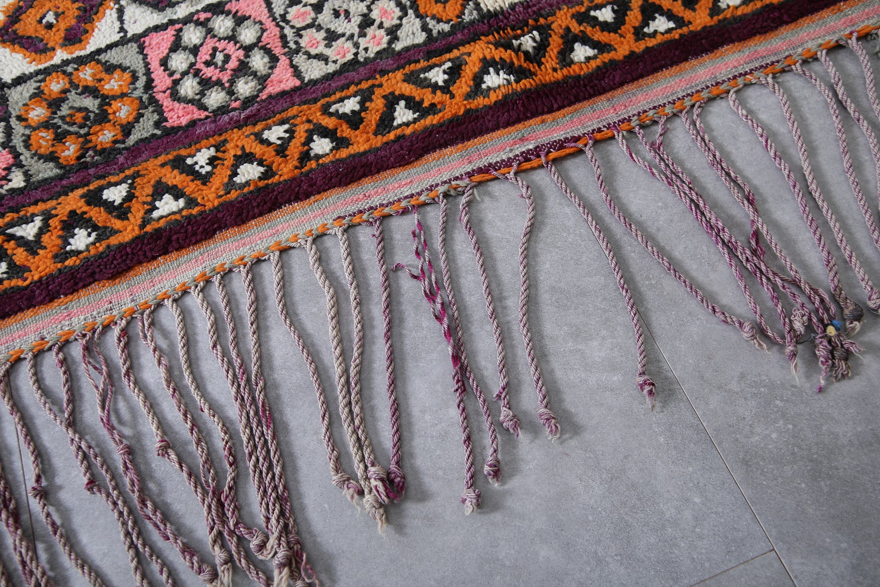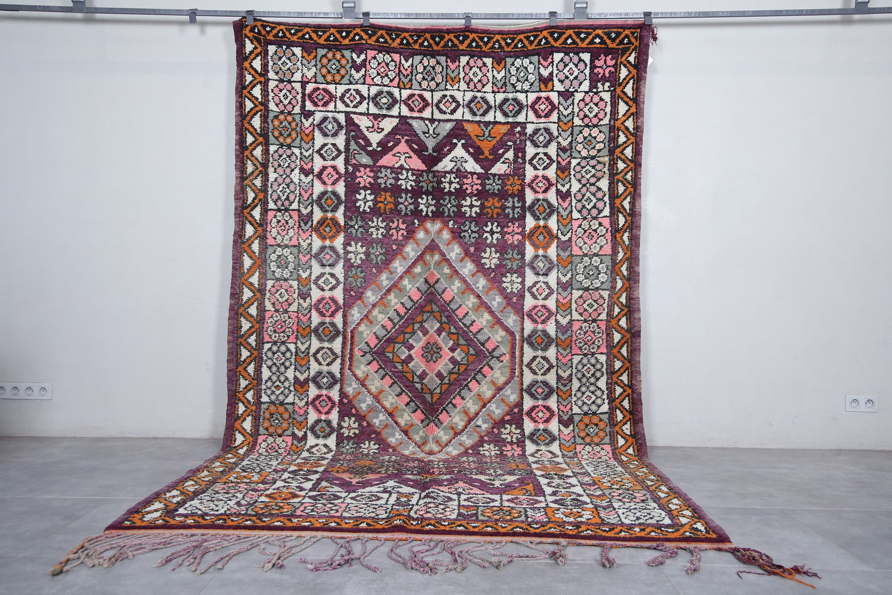 Transform your space with this stunning Boujaad Moroccan rug, measuring 6.5 FT x 11 FT. This handmade wool carpet features a central diamond medallion with intricate geometric patterns in shades of pink, orange, white, and black. Surrounding the medallion is an ornate border filled with rows of symmetrical floral motifs and vibrant accent colors, showcasing a mix of traditional Moroccan craftsmanship and tribal artistry. The soft, plush texture combined with the rich color palette makes this rug a statement piece for living rooms, bedrooms, or offices. Elevate your decor with this one-of-a-kind vintage Moroccan masterpiece.