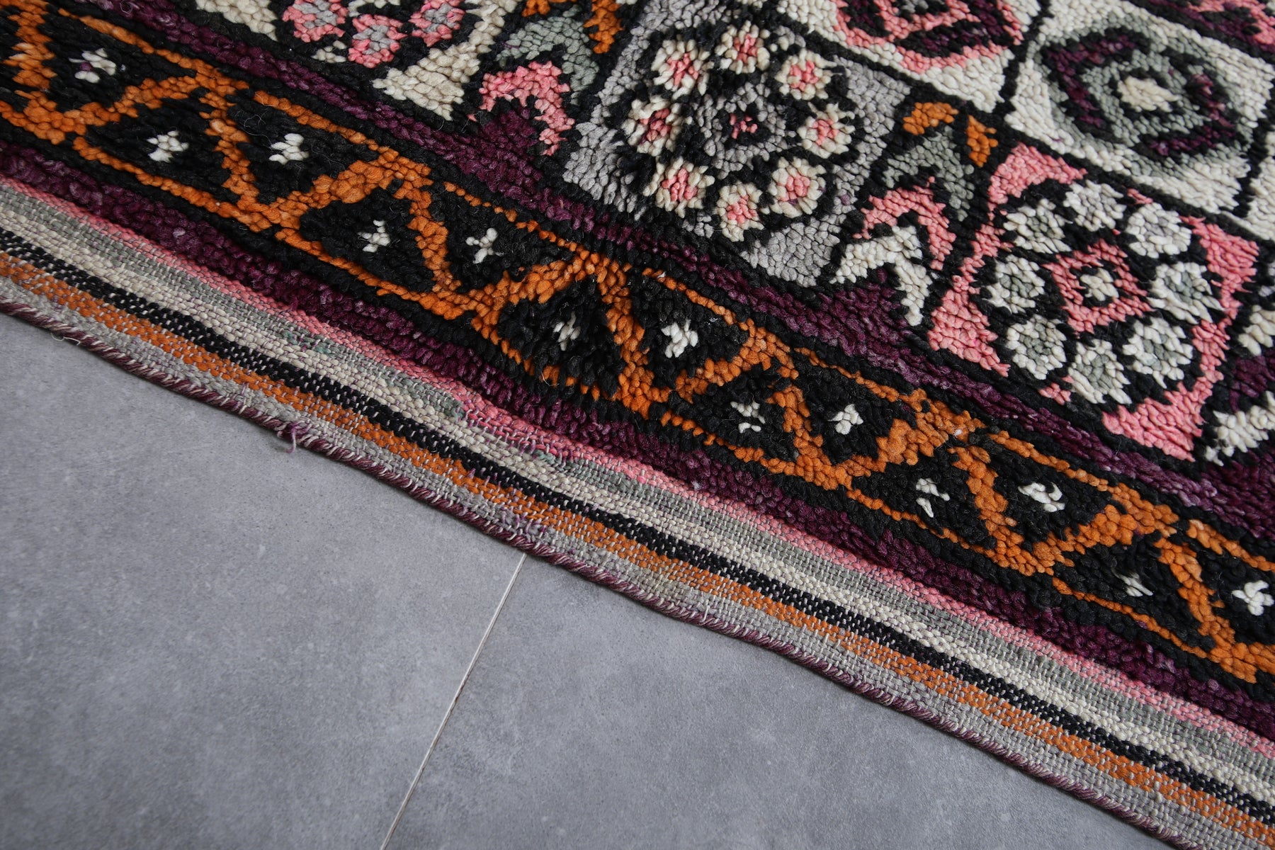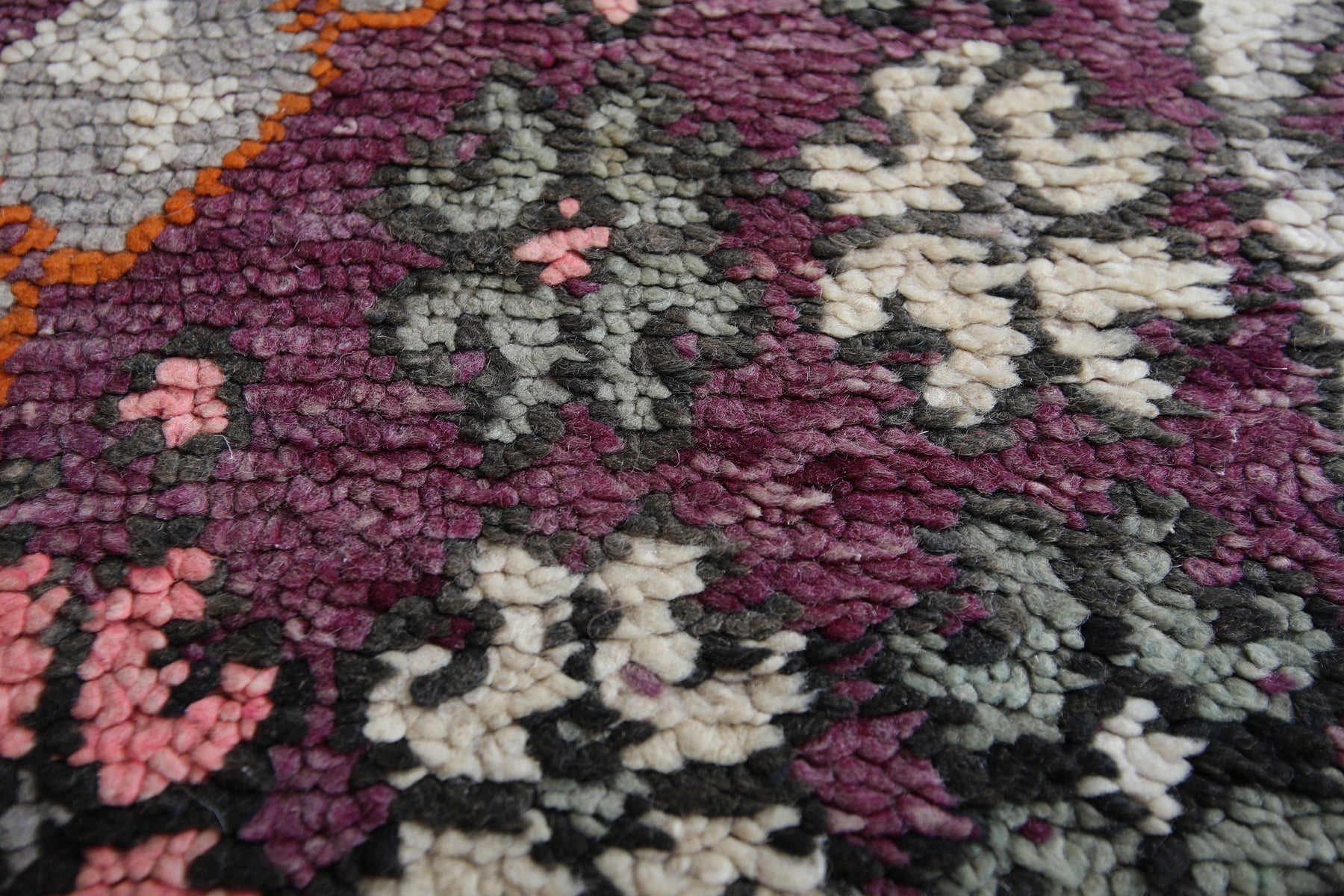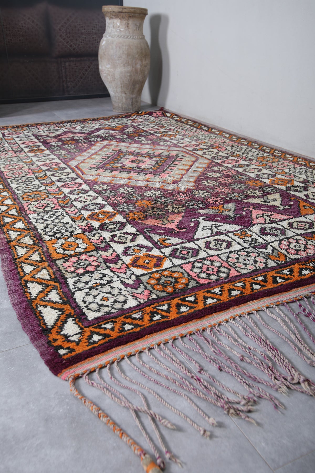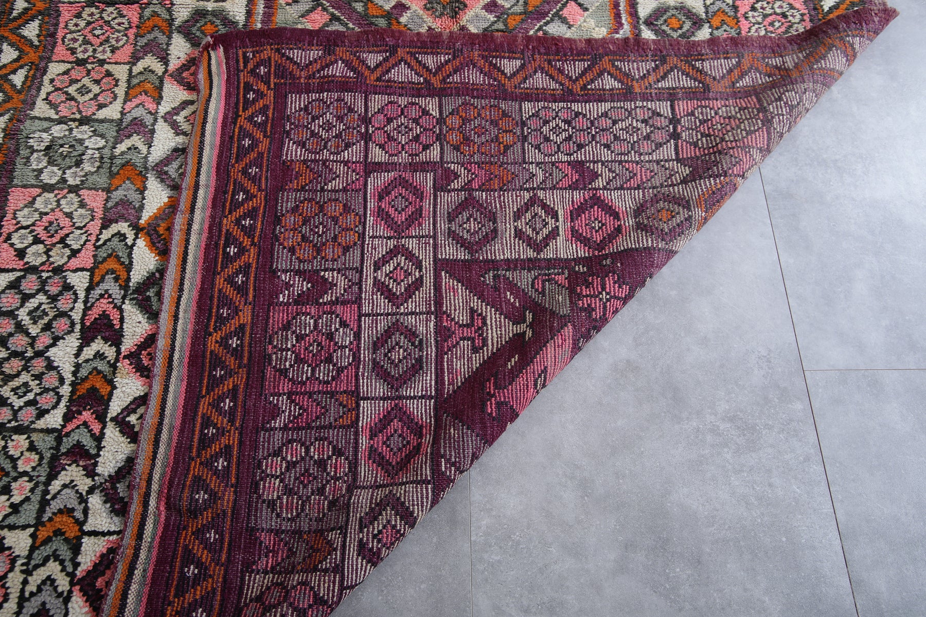 Transform your space with this stunning Boujaad Moroccan rug, measuring 6.5 FT x 11 FT. This handmade wool carpet features a central diamond medallion with intricate geometric patterns in shades of pink, orange, white, and black. Surrounding the medallion is an ornate border filled with rows of symmetrical floral motifs and vibrant accent colors, showcasing a mix of traditional Moroccan craftsmanship and tribal artistry. The soft, plush texture combined with the rich color palette makes this rug a statement piece for living rooms, bedrooms, or offices. Elevate your decor with this one-of-a-kind vintage Moroccan masterpiece.