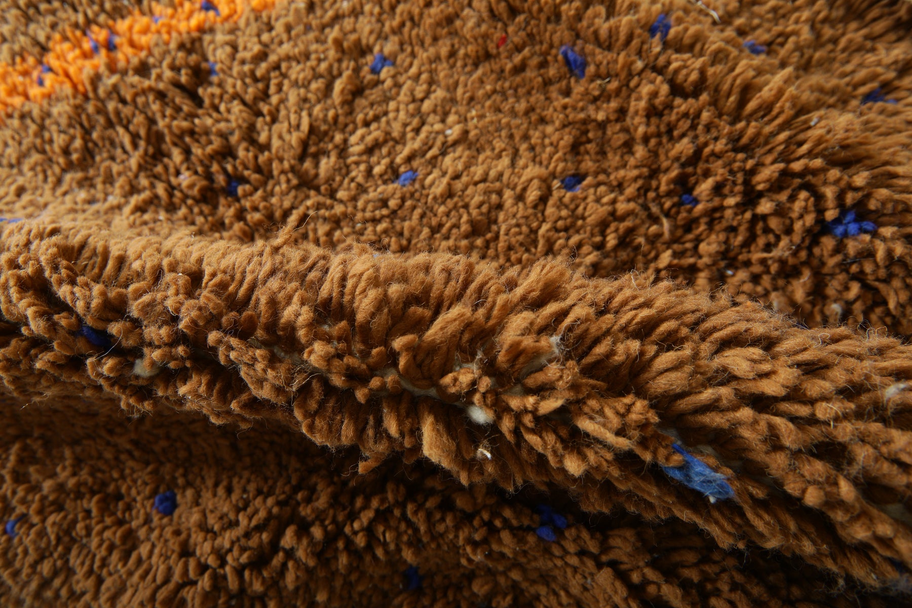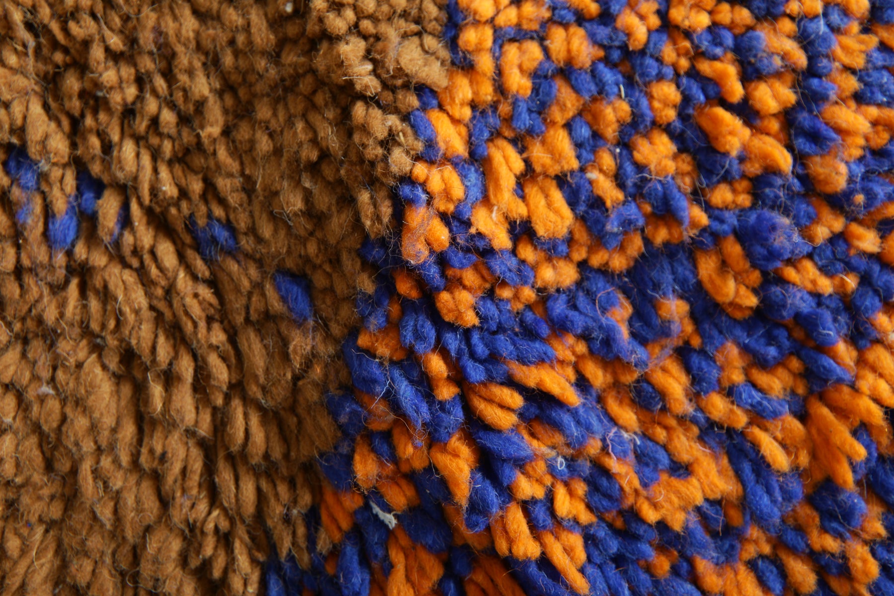 Elevate your space with this stunning handmade Moroccan Berber rug, featuring a bold and modern abstract geometric design. Crafted with care from high-quality wool, this unique piece blends warm earthy brown tones with vibrant accents of orange, grey, and blue for a striking visual impact.