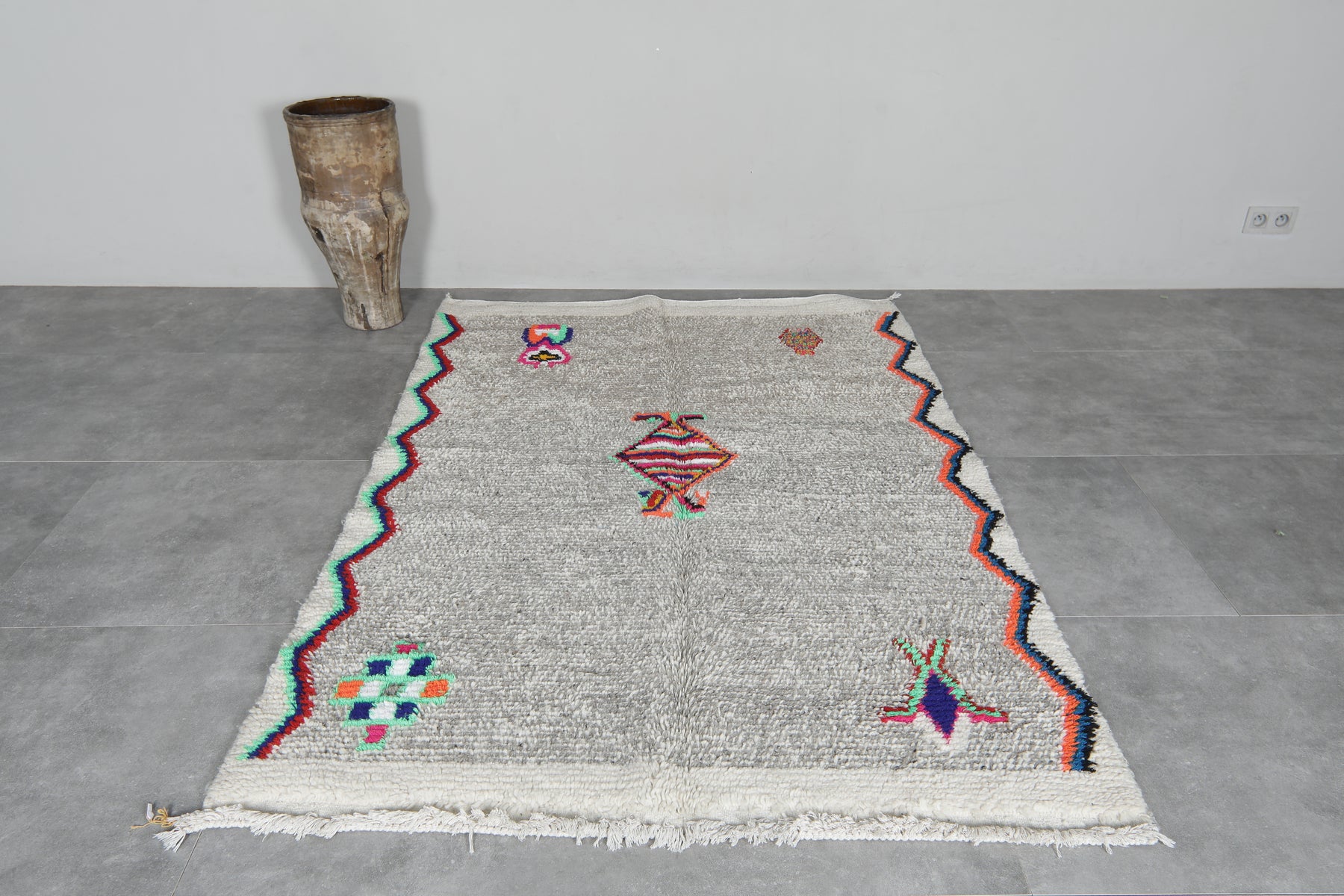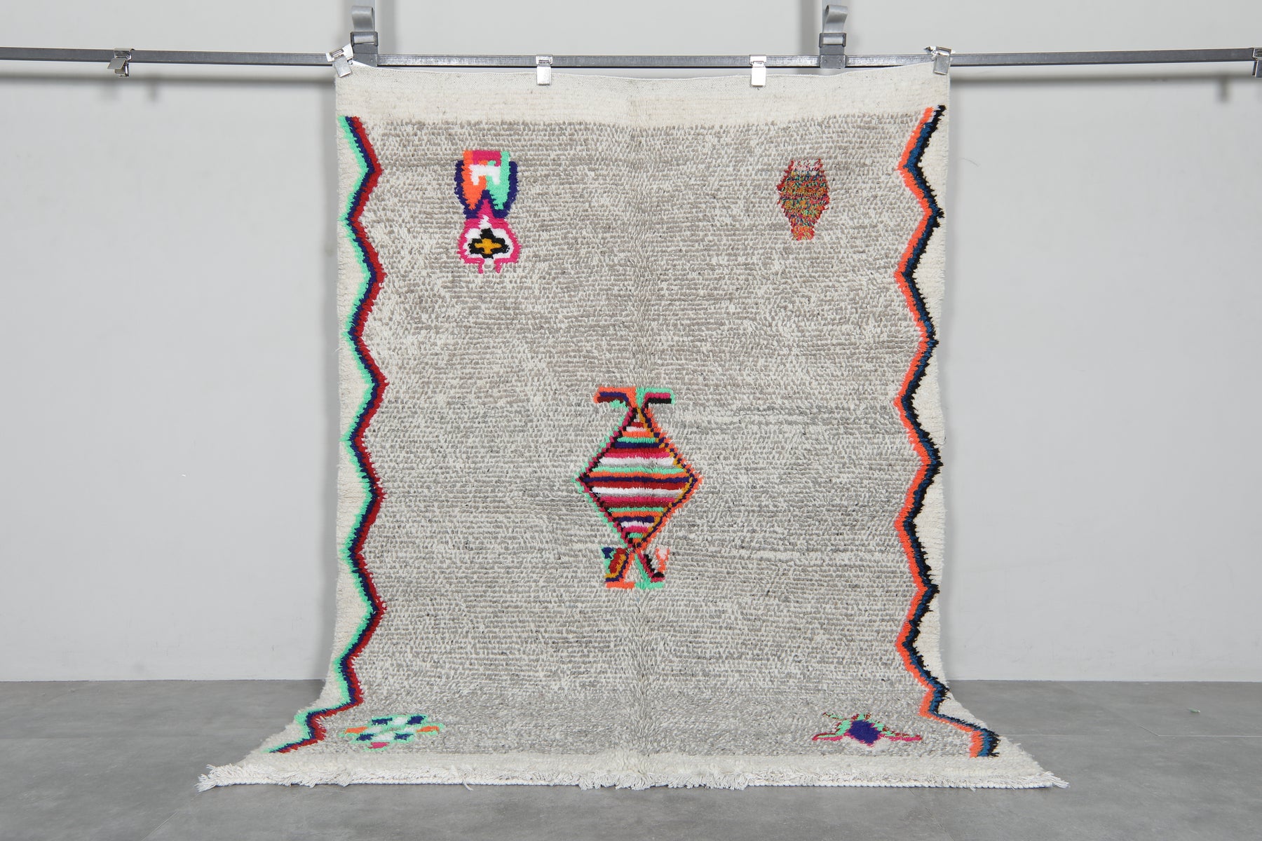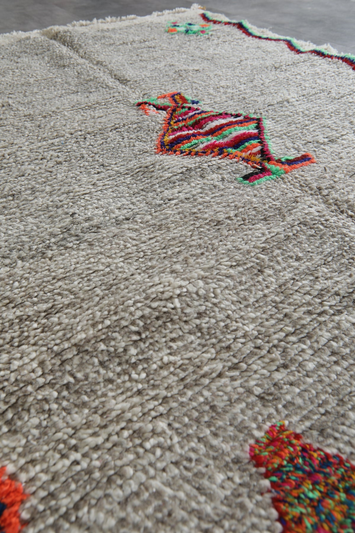 Enhance your space with this handmade Moroccan wool rug, measuring 4.7 FT x 6.7 FT. Featuring a soft, neutral background with vibrant geometric motifs, this rug adds a touch of artistry and tradition to any room. Handwoven from 100% Moroccan wool, it is not only visually striking but also durable and plush underfoot. Perfect for living rooms, bedrooms, or creative spaces, this unique piece showcases the rich heritage of Moroccan craftsmanship.
