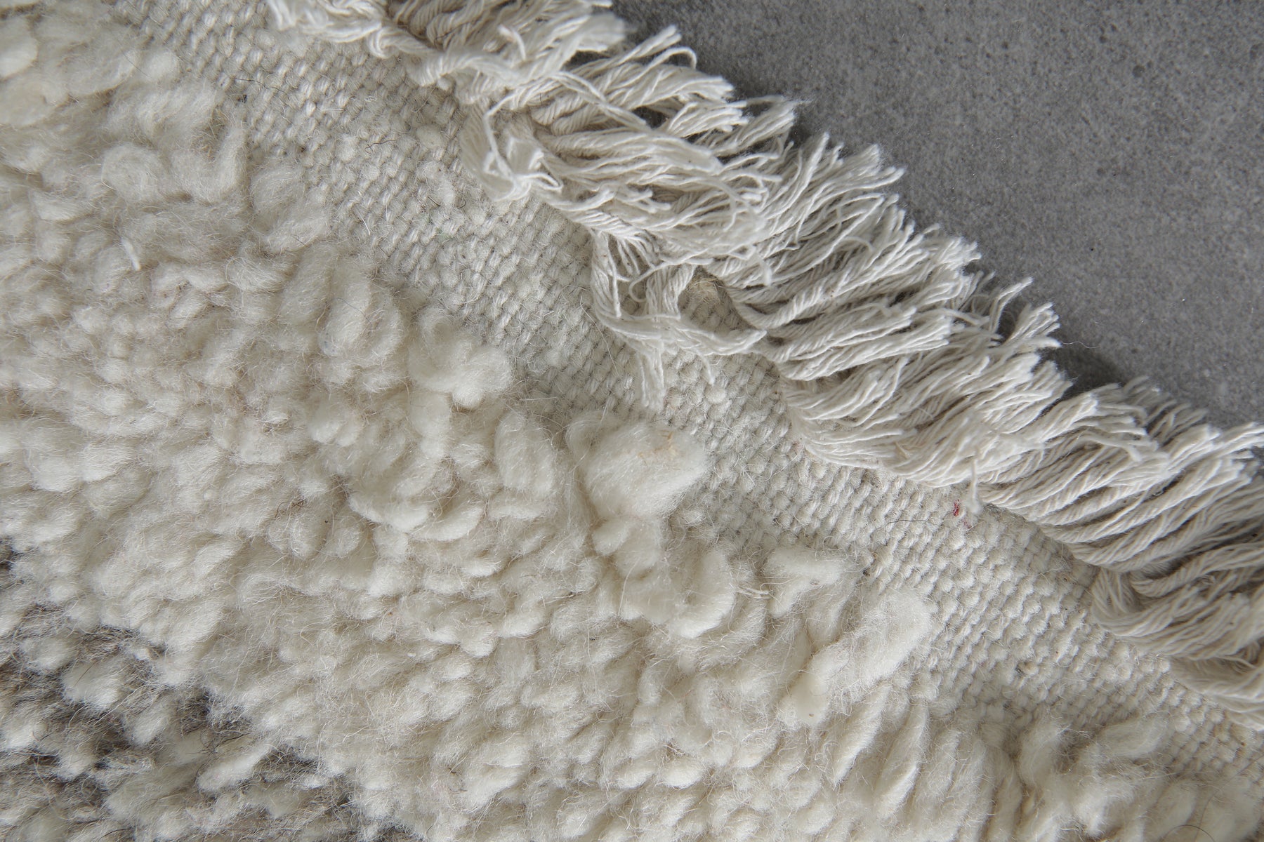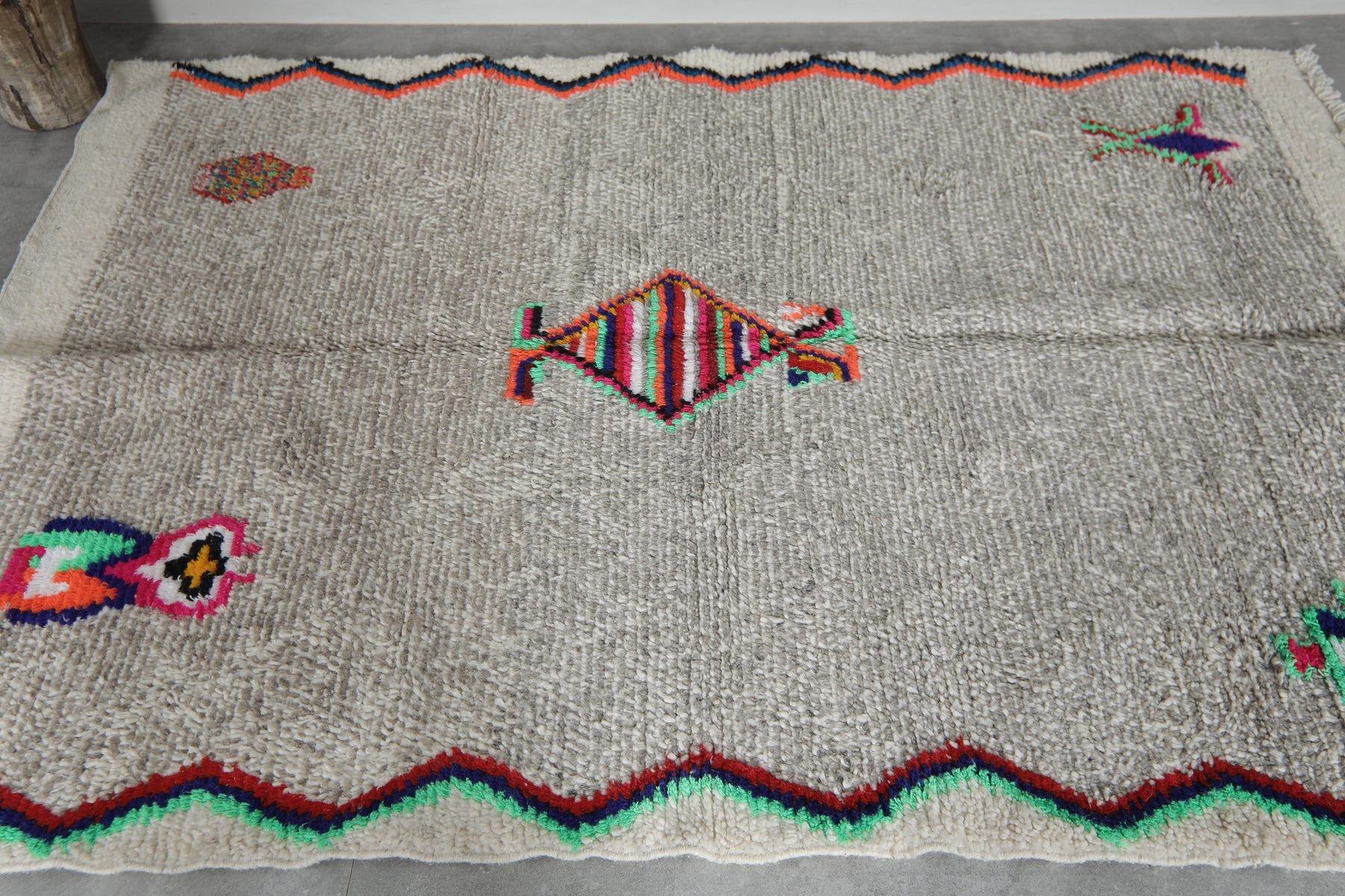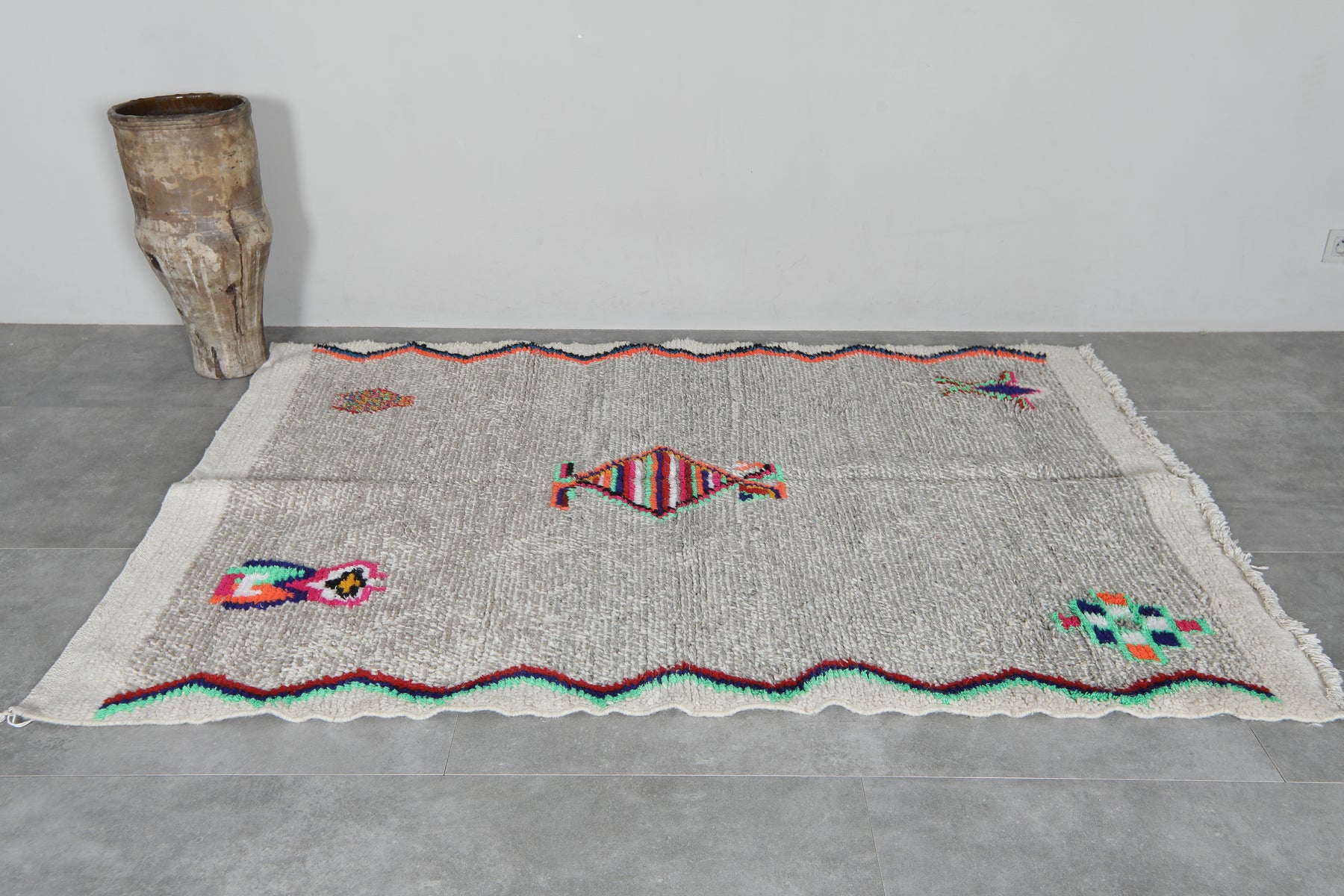 Enhance your space with this handmade Moroccan wool rug, measuring 4.7 FT x 6.7 FT. Featuring a soft, neutral background with vibrant geometric motifs, this rug adds a touch of artistry and tradition to any room. Handwoven from 100% Moroccan wool, it is not only visually striking but also durable and plush underfoot. Perfect for living rooms, bedrooms, or creative spaces, this unique piece showcases the rich heritage of Moroccan craftsmanship.