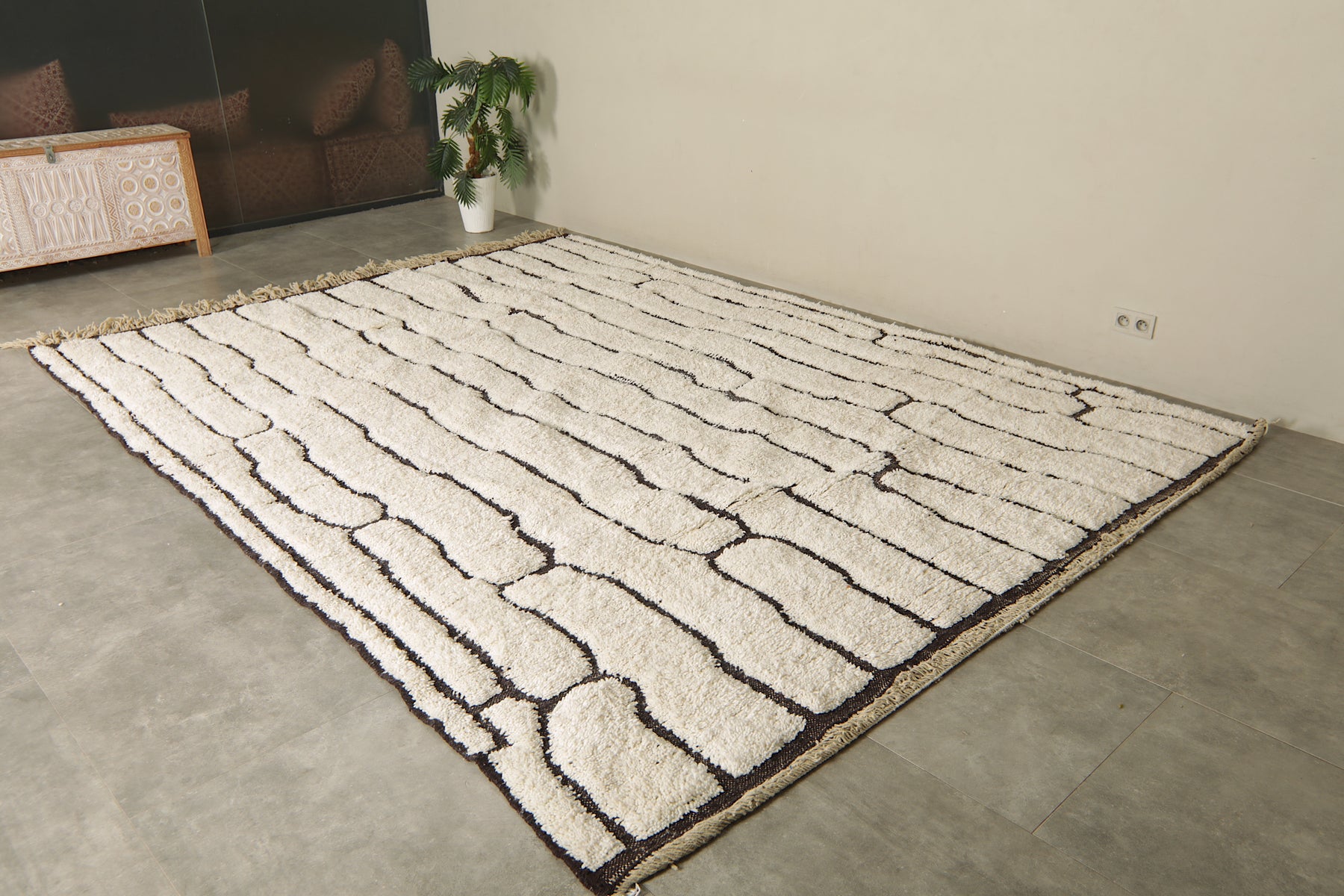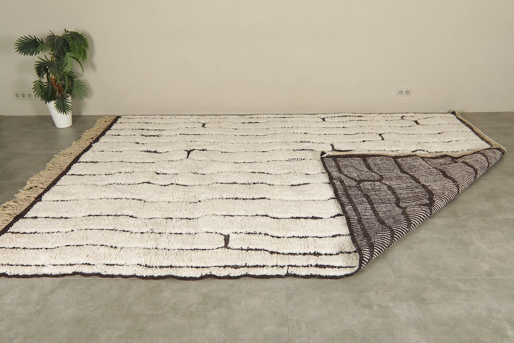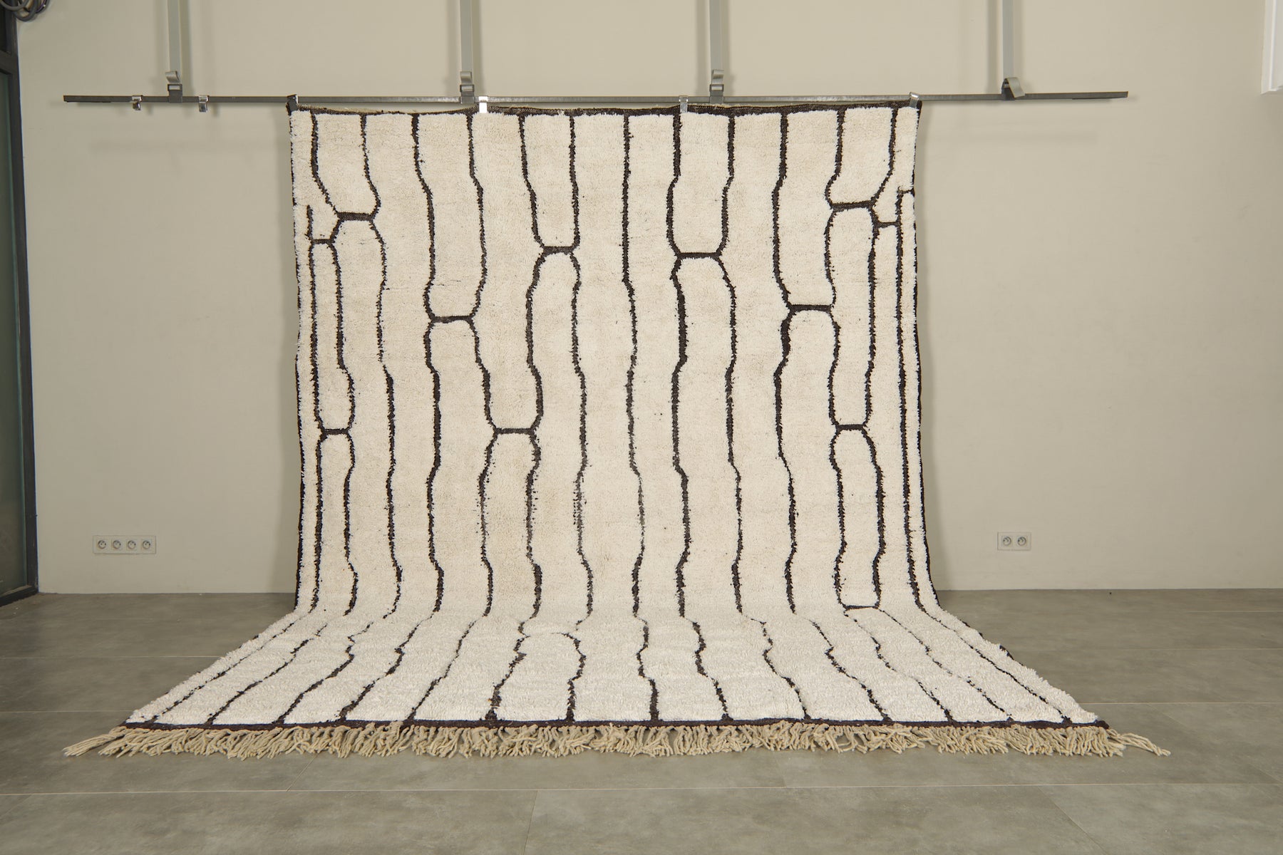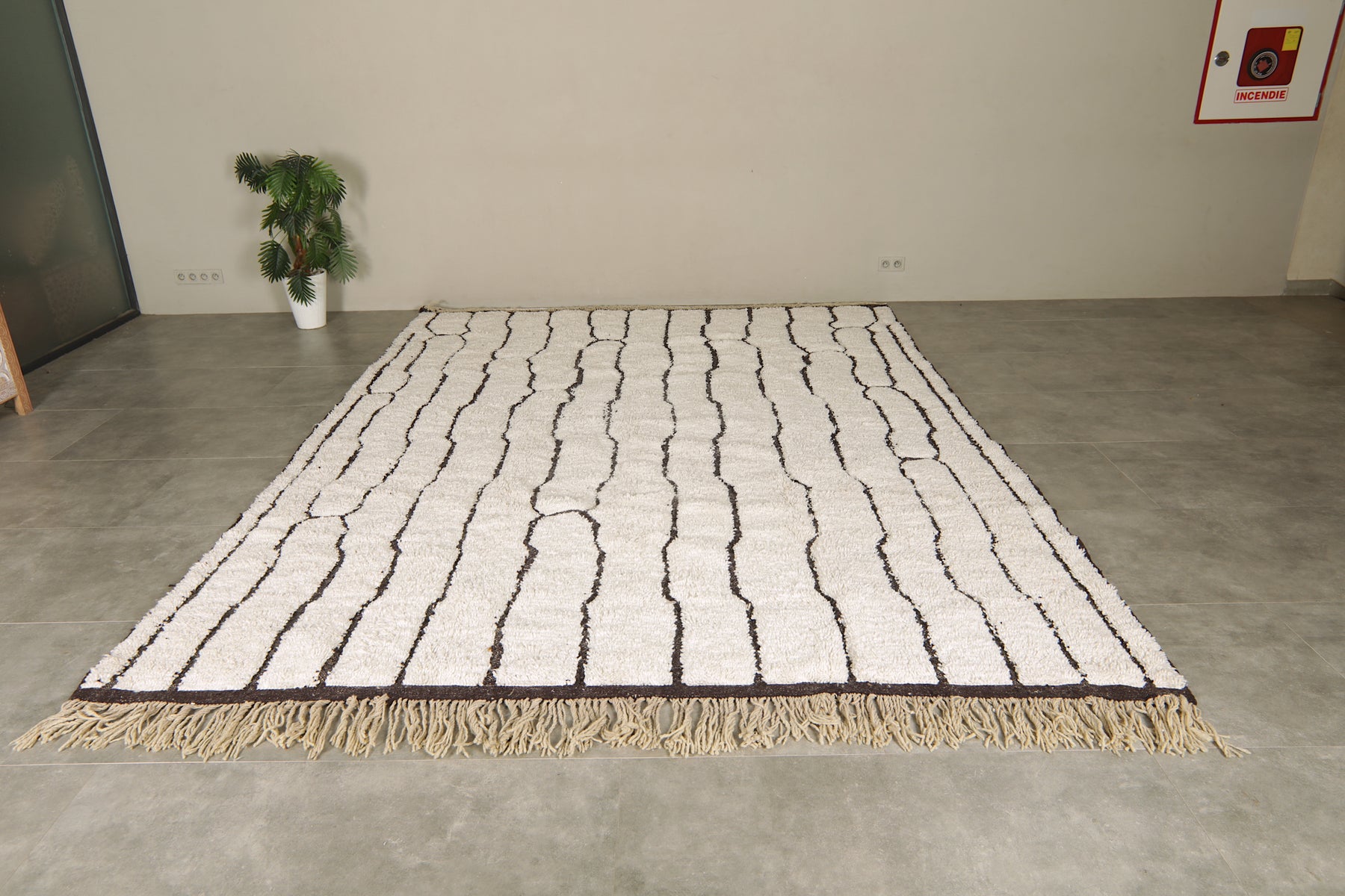 Bring modern elegance and artisan craftsmanship into your home with this geometric Moroccan rug, handwoven from 100% natural ivory wool. Its minimalist design features a series of abstract black lines forming an organic, vertical pattern that flows across the rug like modern art. The contrast between the soft ivory base and the bold black geometry makes this rug a statement piece with timeless appeal.