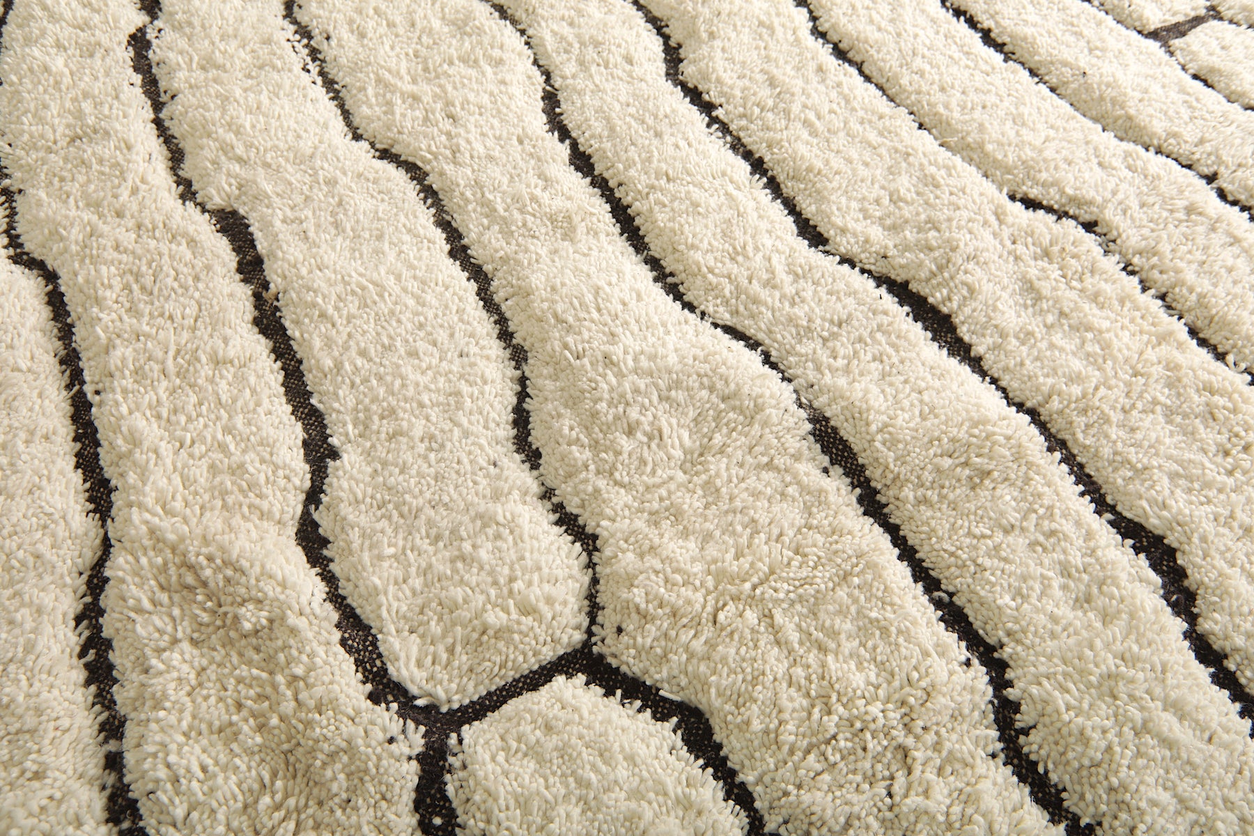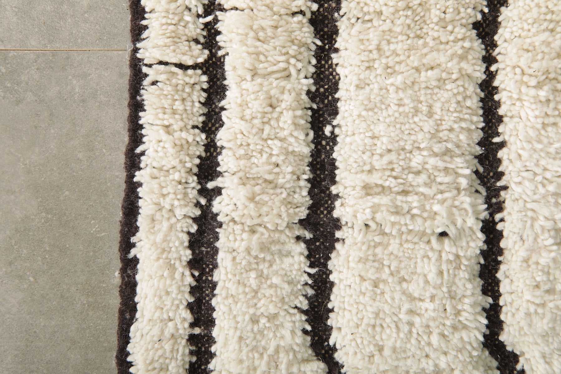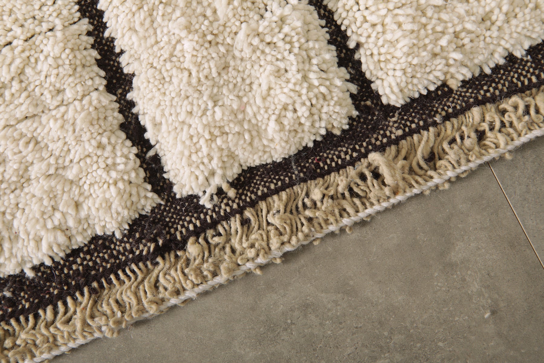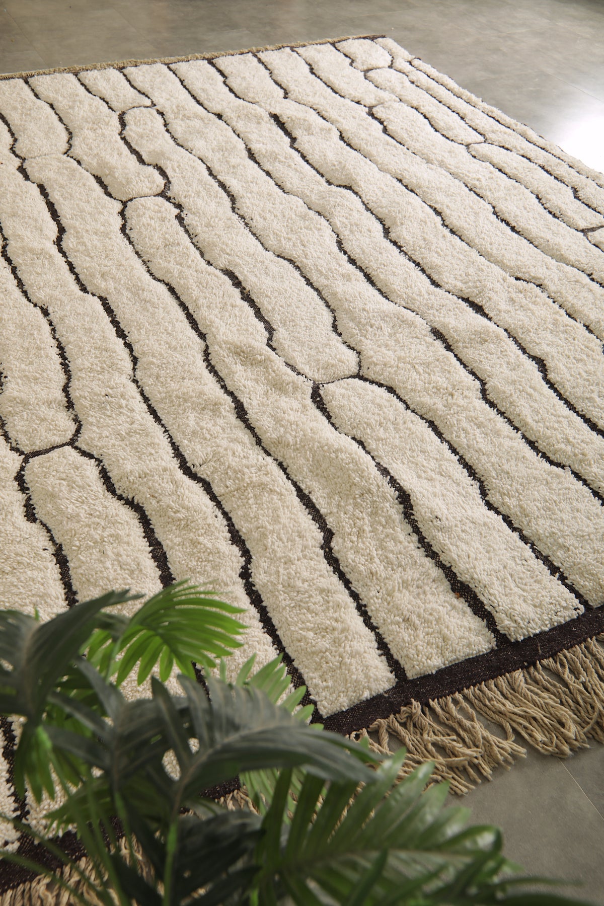 Bring modern elegance and artisan craftsmanship into your home with this geometric Moroccan rug, handwoven from 100% natural ivory wool. Its minimalist design features a series of abstract black lines forming an organic, vertical pattern that flows across the rug like modern art. The contrast between the soft ivory base and the bold black geometry makes this rug a statement piece with timeless appeal.