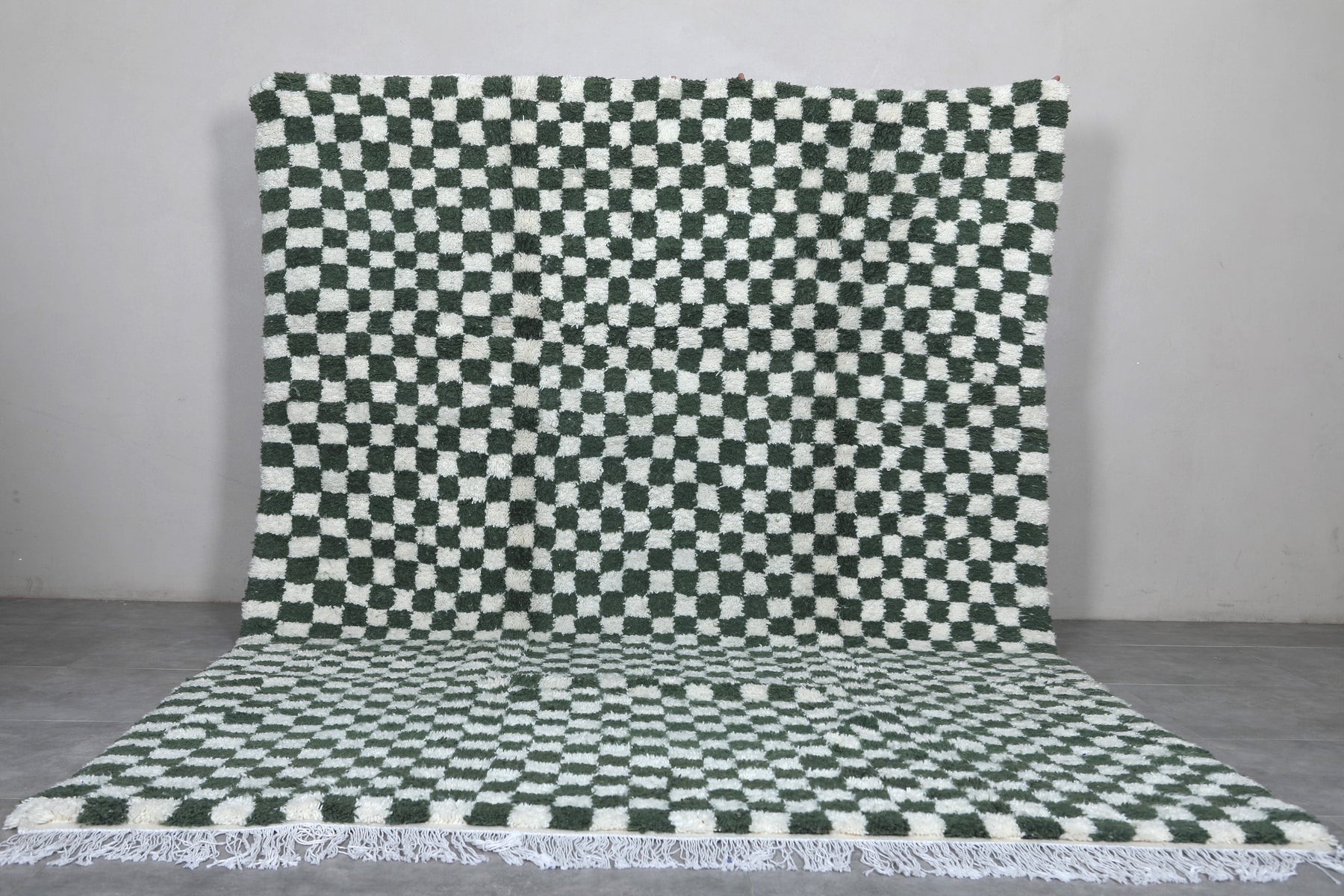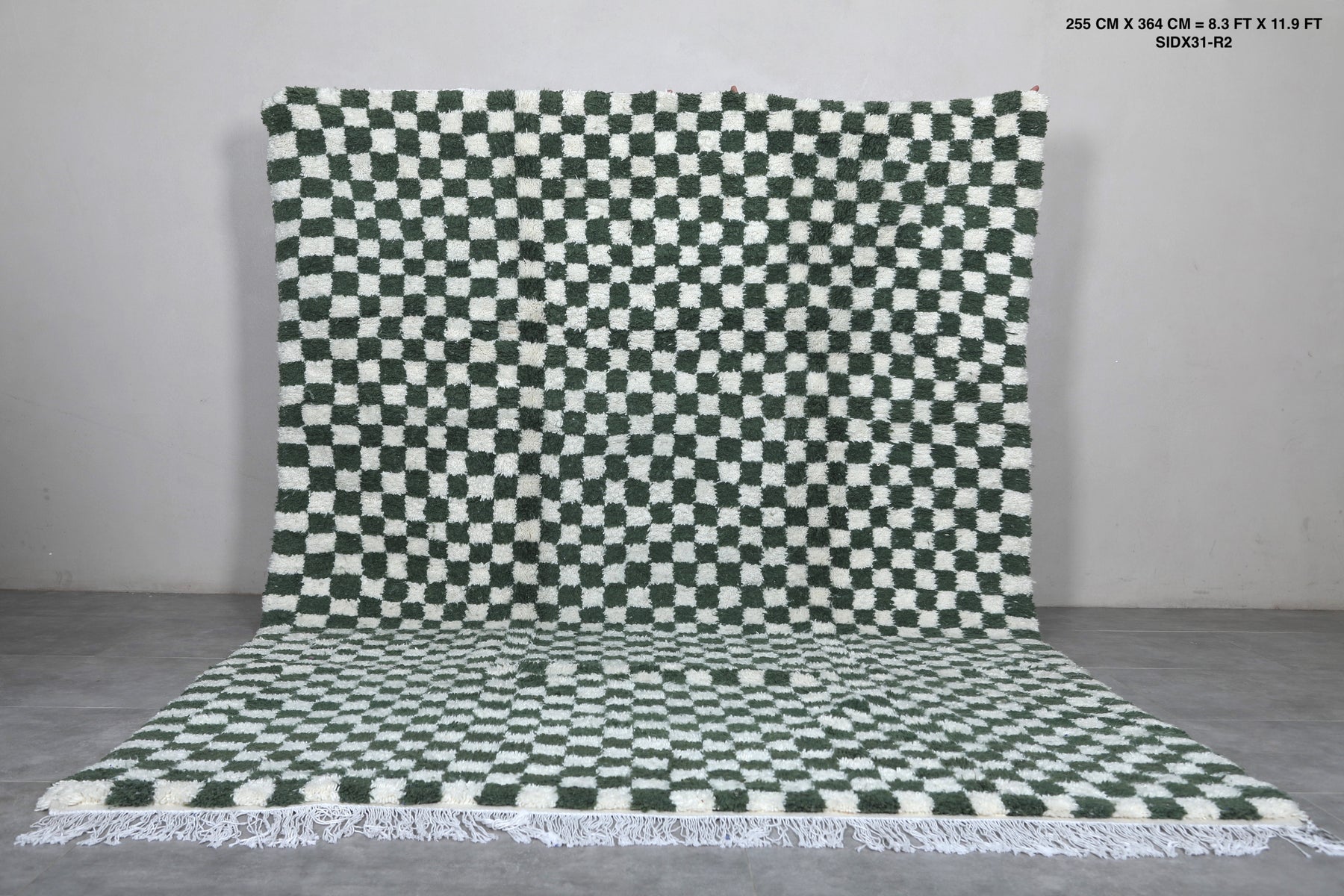 Enhance your decor with this Green Moroccan Rug, sized at 8.3 x 11.9 feet (255 CM x 364 CM). This handwoven masterpiece features a bold green and white checkered pattern, adding vibrancy and contemporary style to any space. Its plush wool texture ensures exceptional comfort, while the durable craftsmanship guarantees lasting quality. Ideal for living rooms, artistic interiors, or eclectic decor, this rug blends Moroccan tradition with modern design.
