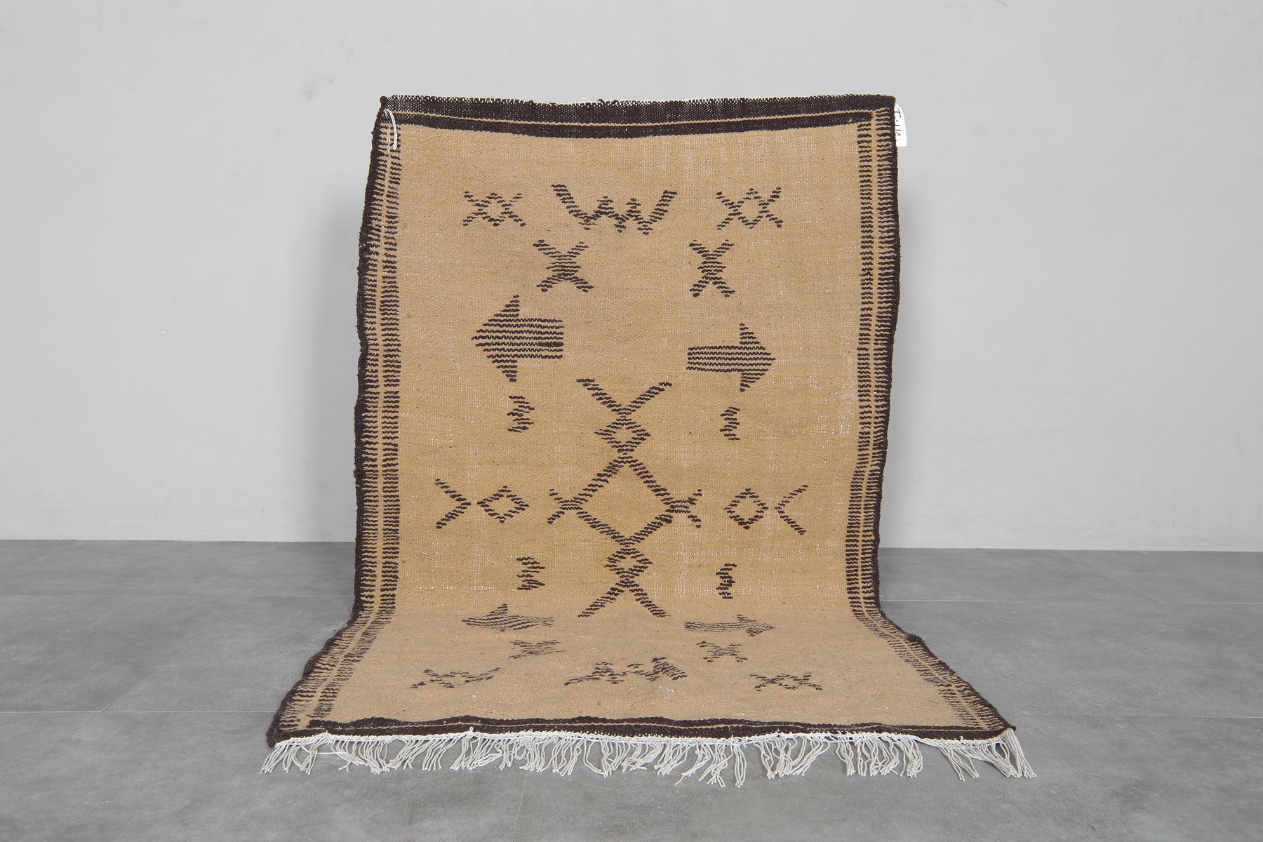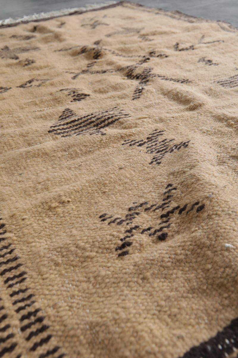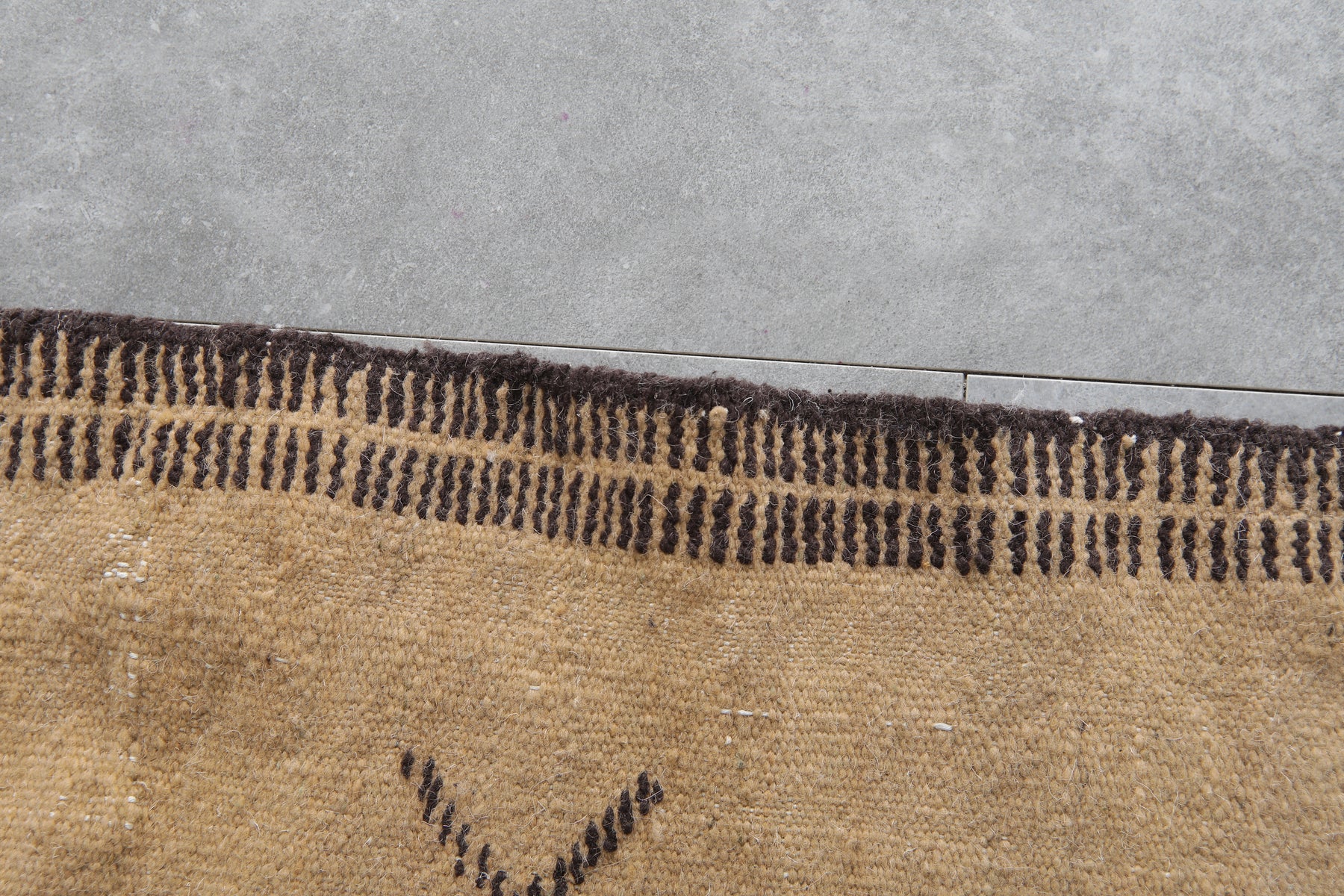 Add a touch of authenticity to your space with this Hand-Knotted Berber rug, measuring 3.2 FT x 4.9 FT. Crafted by skilled Moroccan artisans, this stunning piece features traditional Berber symbols in deep, earthy tones on a warm, neutral background. Made from high-quality wool, it offers both comfort and durability.