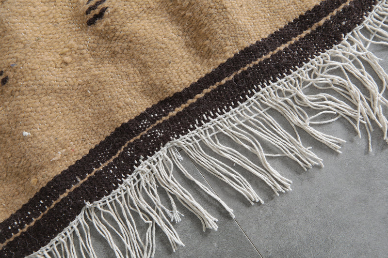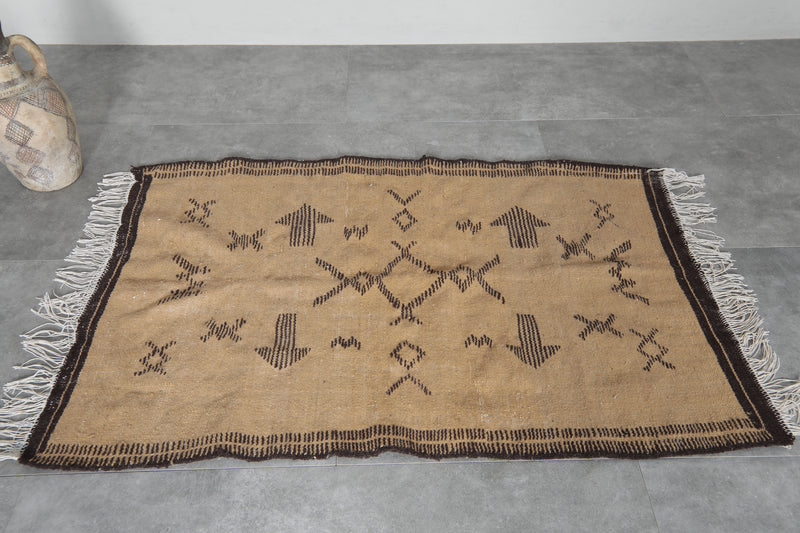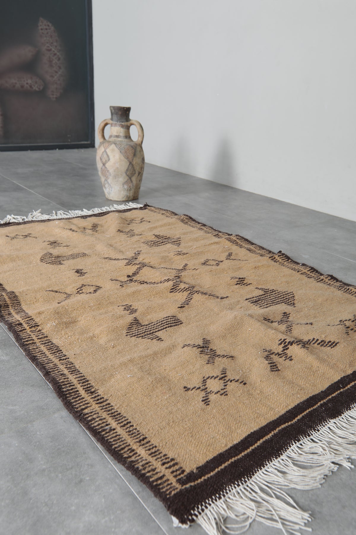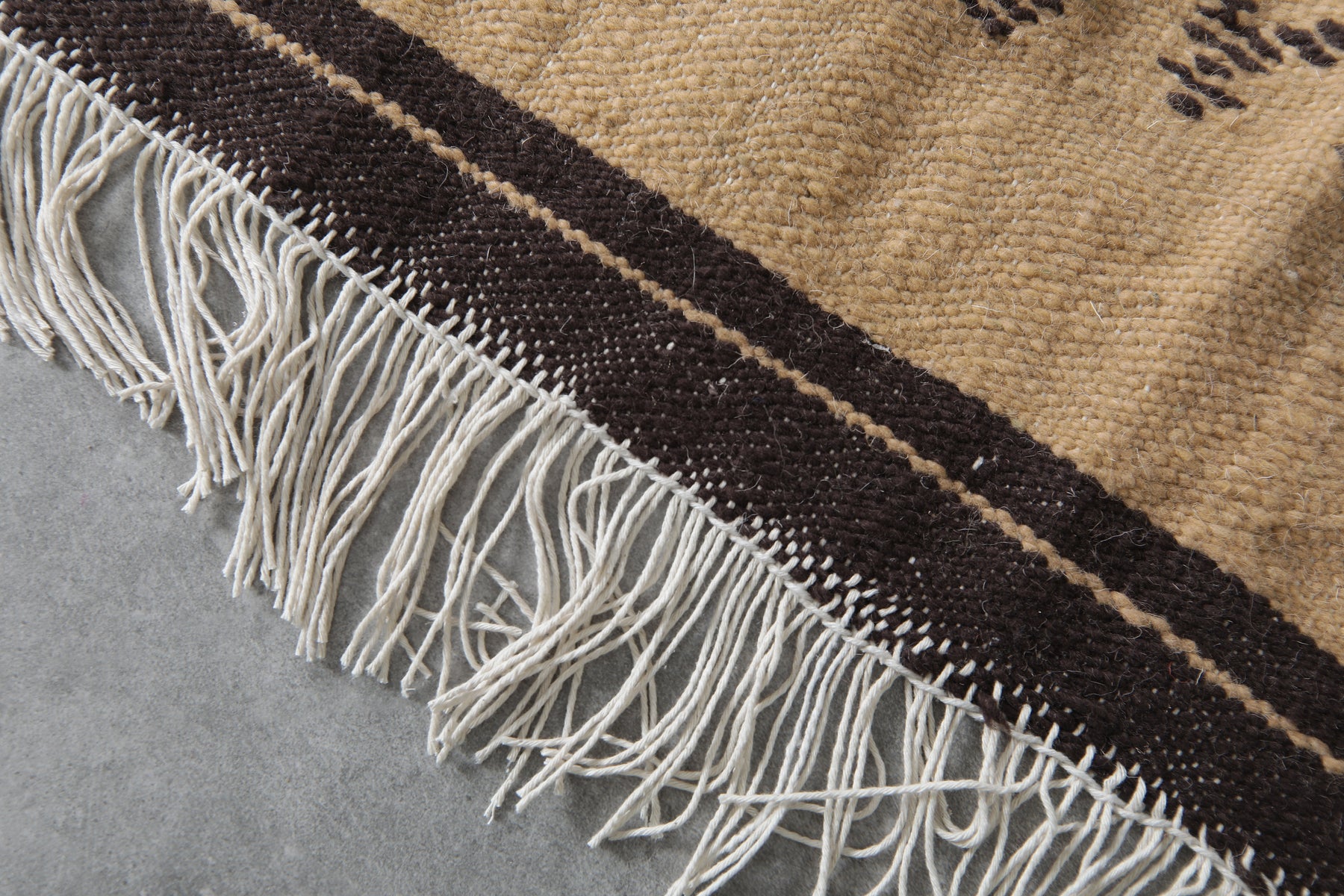 Add a touch of authenticity to your space with this Hand-Knotted Berber rug, measuring 3.2 FT x 4.9 FT. Crafted by skilled Moroccan artisans, this stunning piece features traditional Berber symbols in deep, earthy tones on a warm, neutral background. Made from high-quality wool, it offers both comfort and durability.