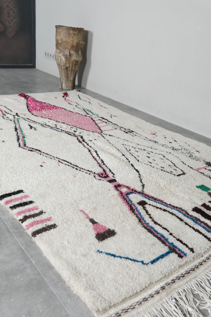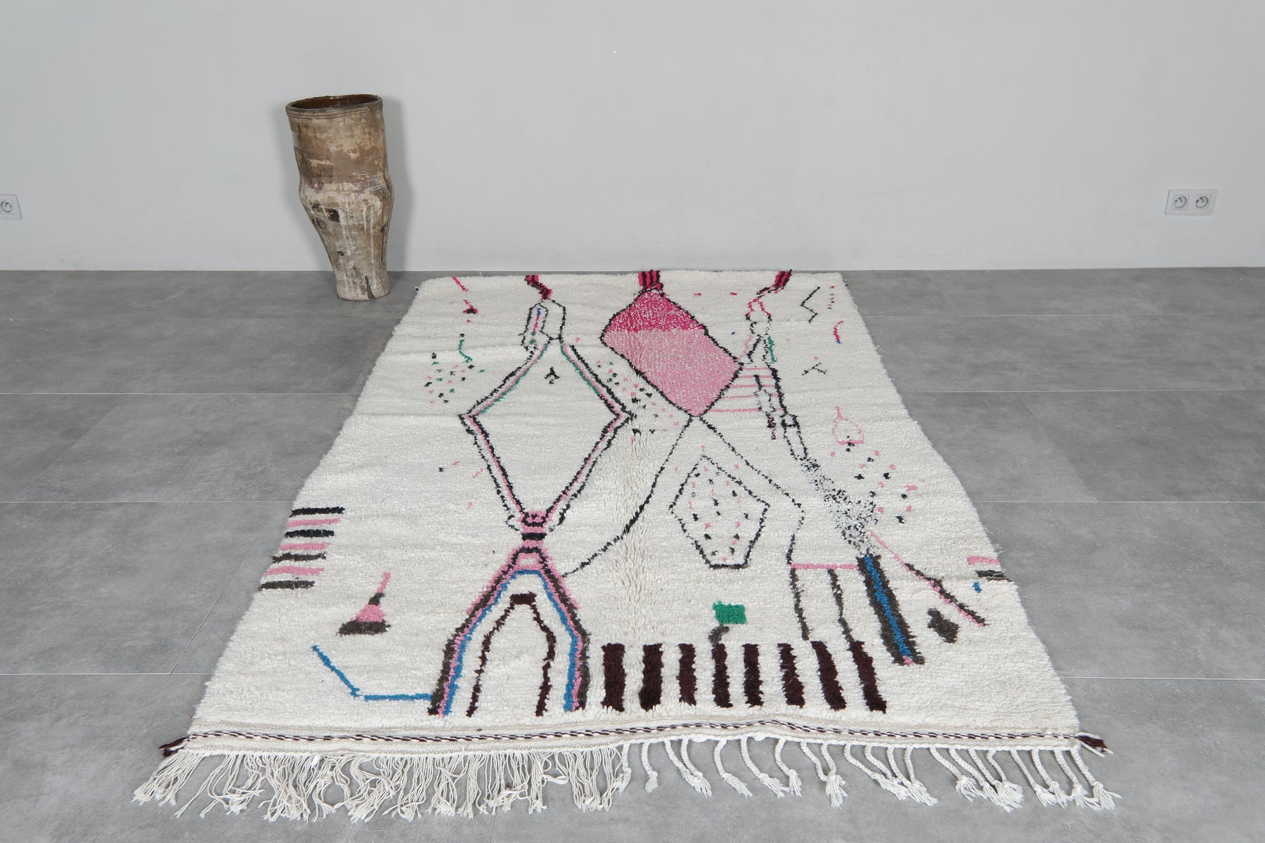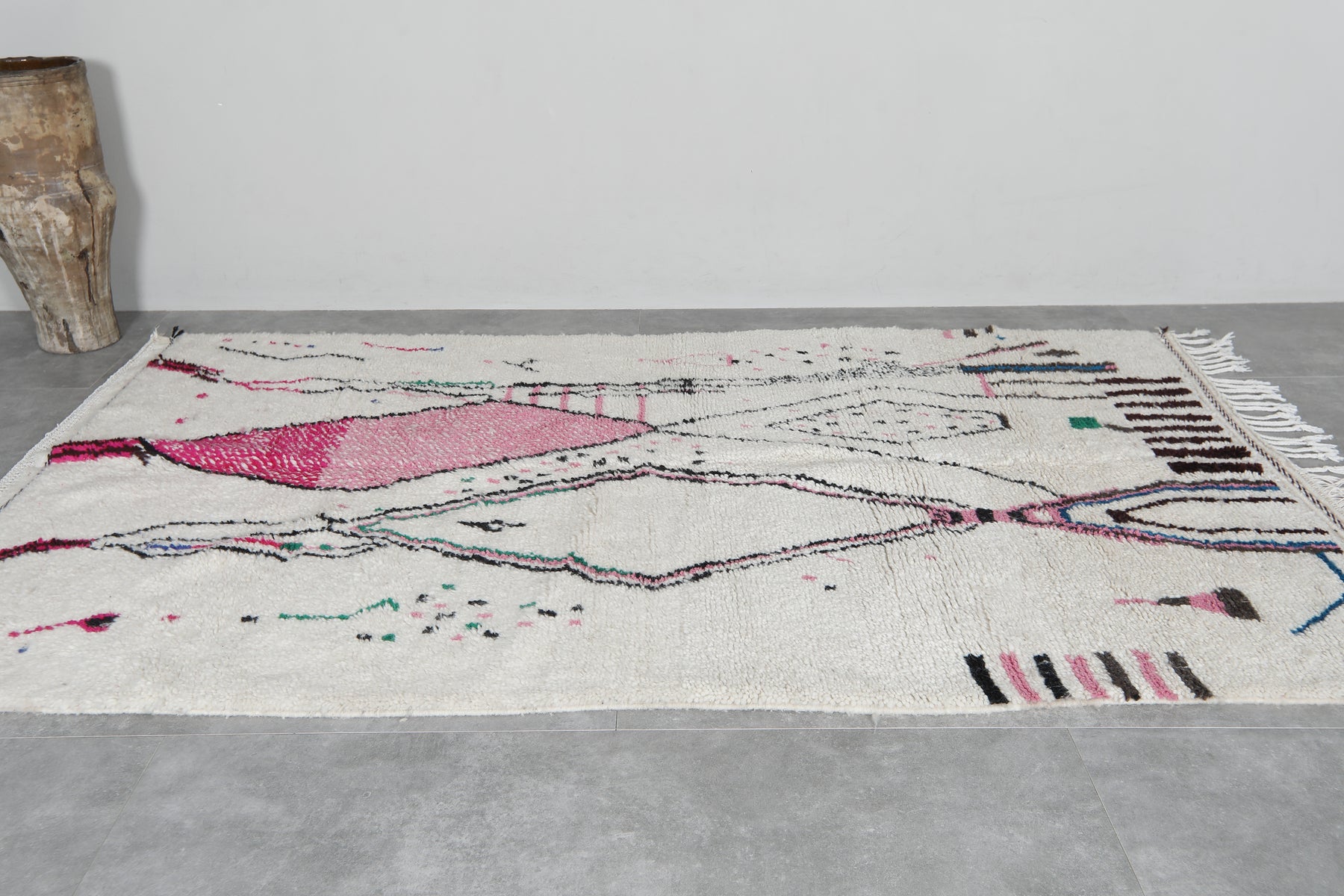 Make a bold statement with this Handmade Berber rug, measuring 4.6 FT x 7.8 FT. Expertly woven by skilled artisans, this unique piece features striking geometric motifs in vibrant hues on a soft, neutral background. Its plush wool texture adds warmth and character, making it a perfect centerpiece for any room.