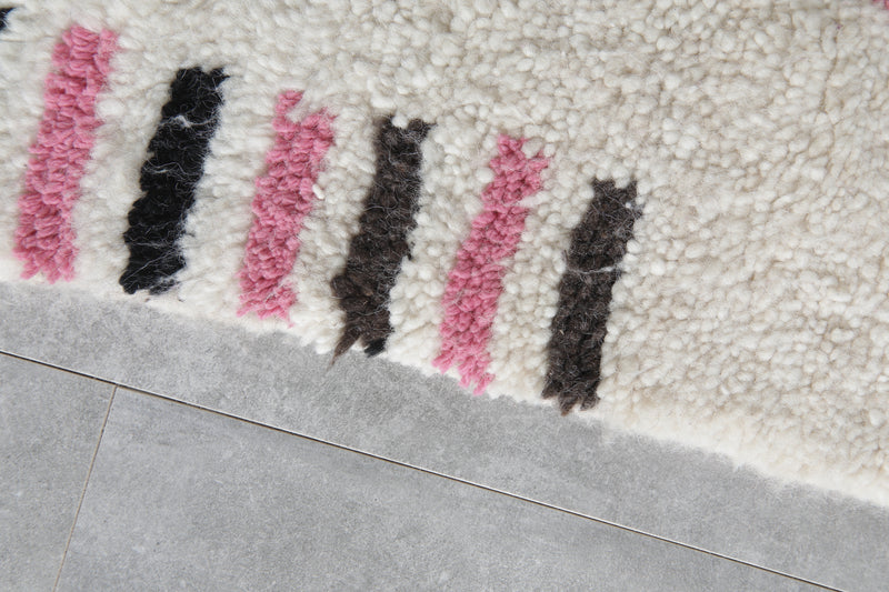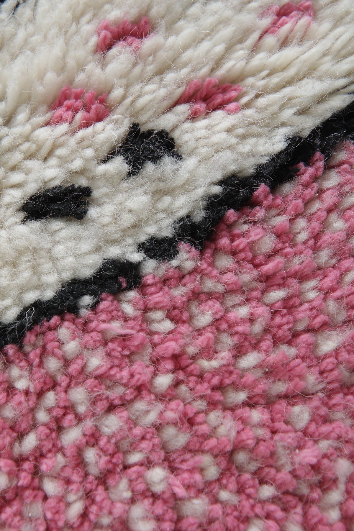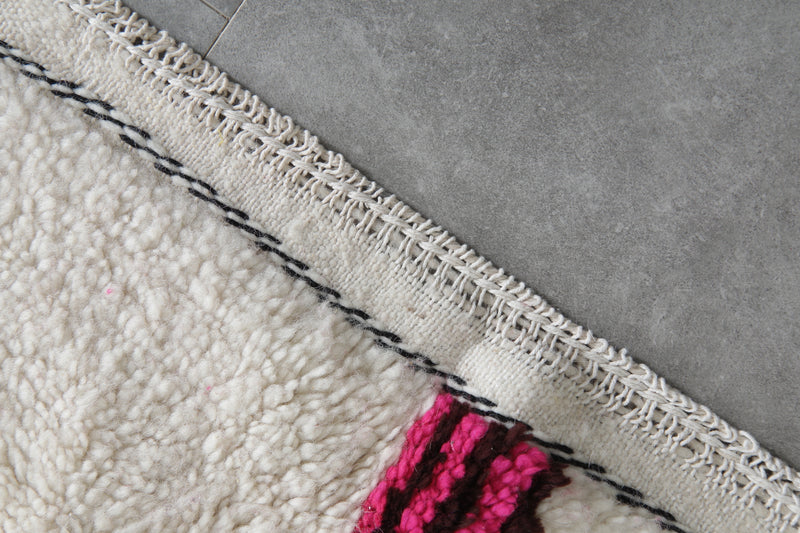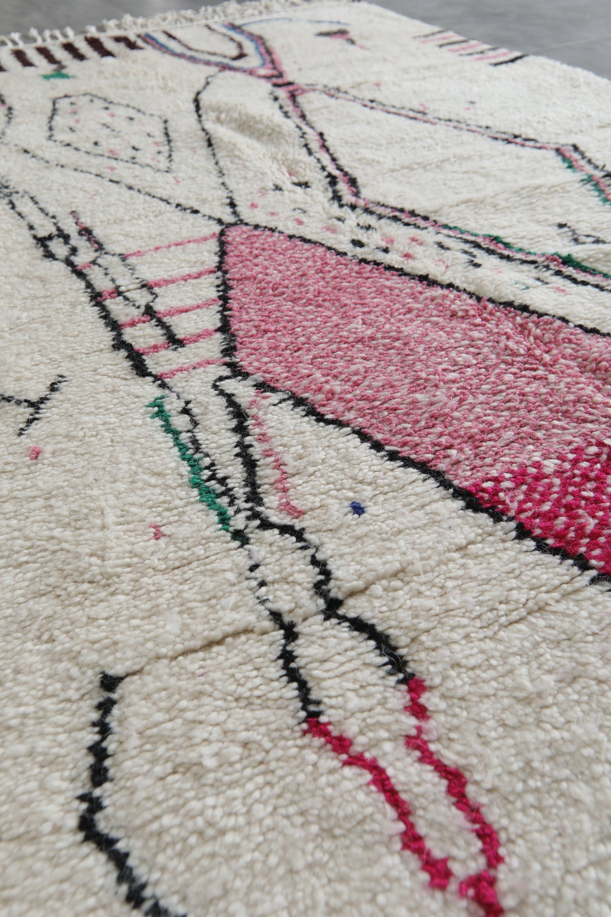Make a bold statement with this Handmade Berber rug, measuring 4.6 FT x 7.8 FT. Expertly woven by skilled artisans, this unique piece features striking geometric motifs in vibrant hues on a soft, neutral background. Its plush wool texture adds warmth and character, making it a perfect centerpiece for any room.