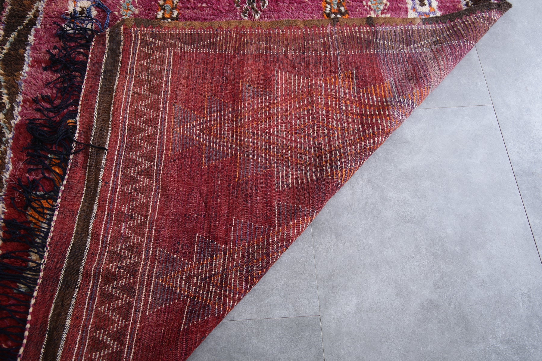 Transform your space with this stunning handmade Berber rug, measuring 5.7 FT x 9.6 FT. This Moroccan wool carpet features a vibrant red background with intricate diamond-shaped patterns in vivid orange, white, and blue hues. The geometric designs are highlighted by subtle tribal motifs, bringing a sense of tradition and artistry. The rug’s rich colors and fringed edges enhance its bold, authentic style, making it a perfect statement piece for living rooms, bedrooms, or creative spaces. Add warmth, texture, and cultural heritage to your home with this one-of-a-kind Moroccan masterpiece.