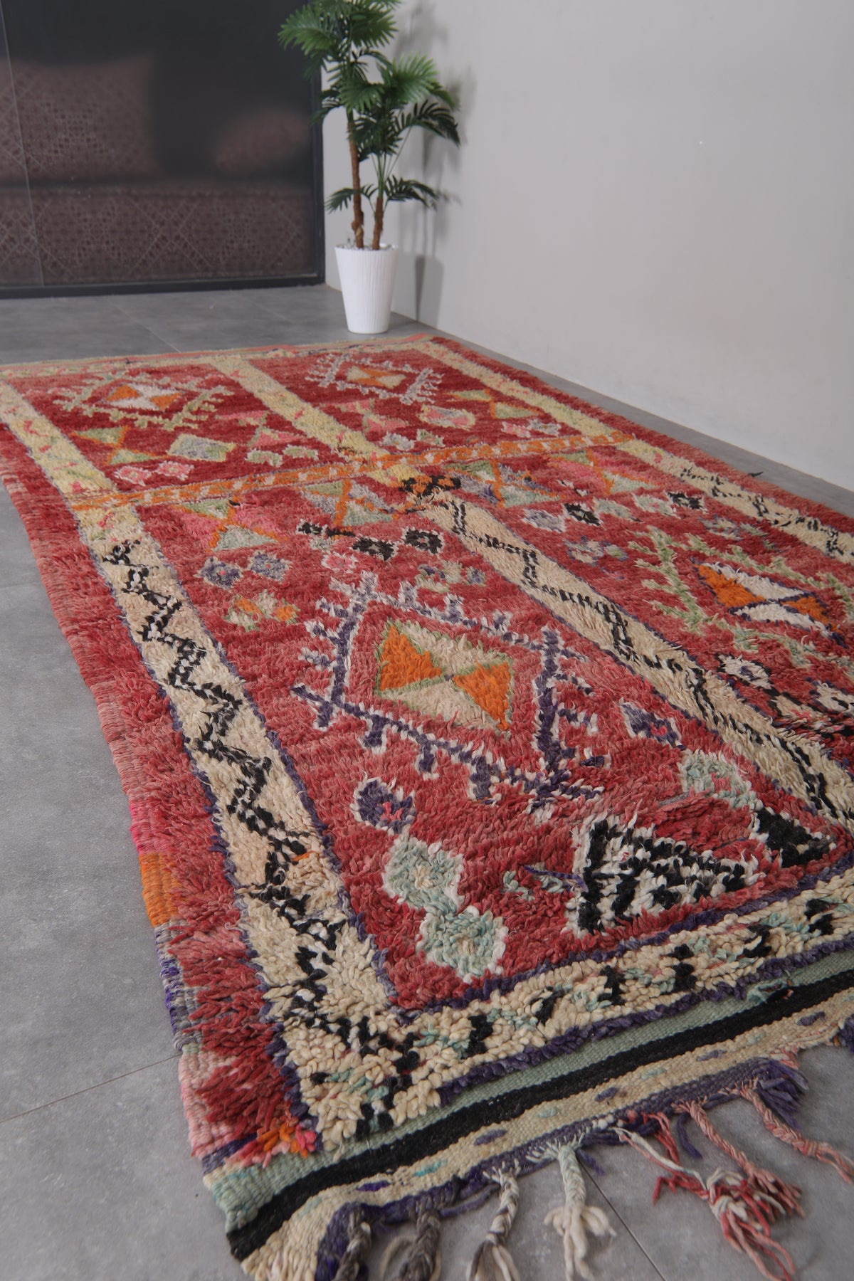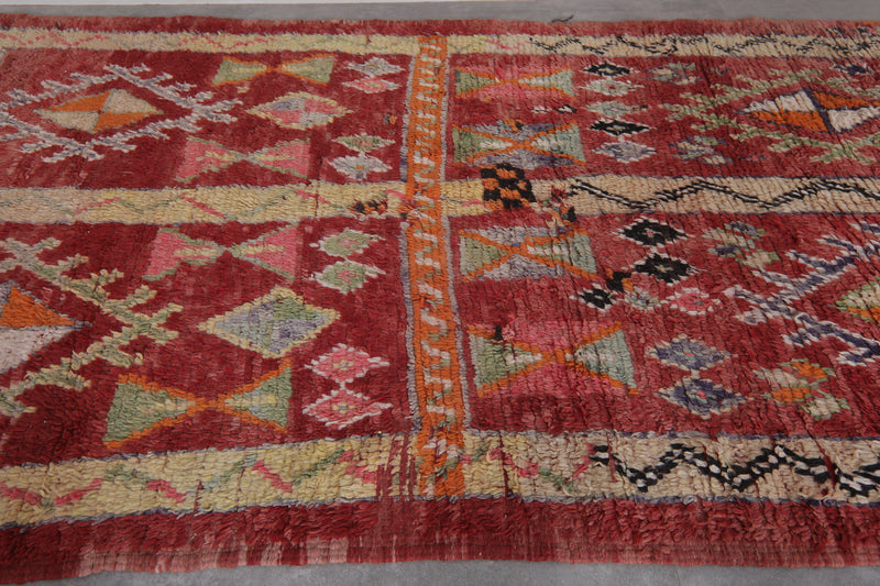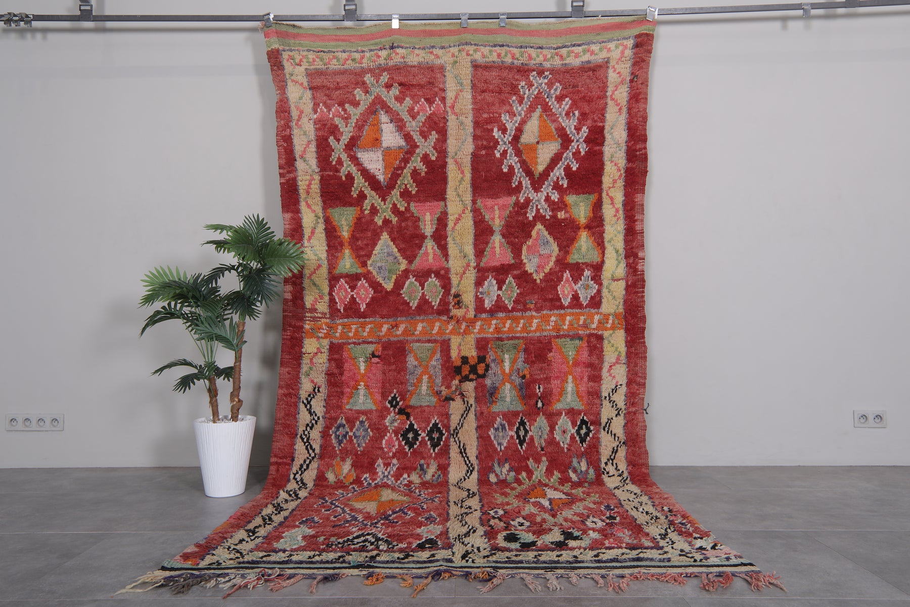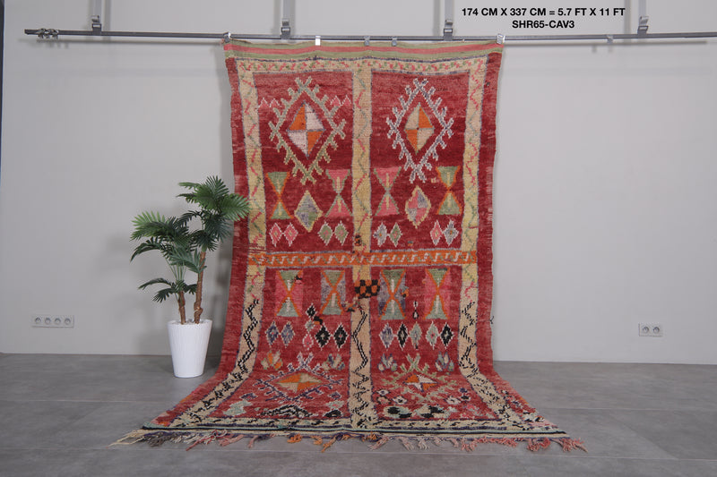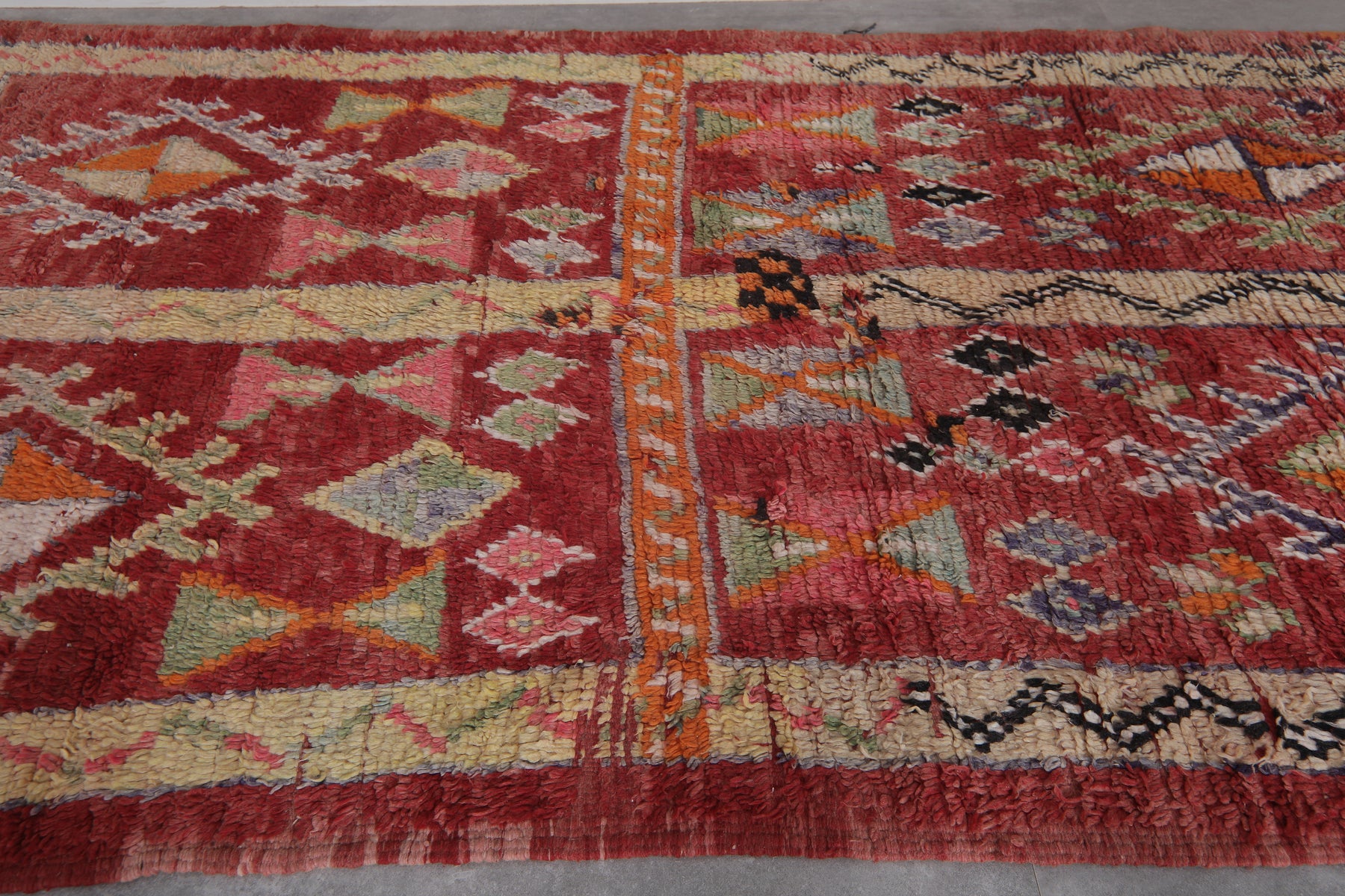 Add a splash of vibrant color to your space with this exquisite handmade Moroccan rug, measuring 5.7 x 11 feet. Featuring a bold red base adorned with intricate diamond patterns and geometric shapes, this rug brings traditional Moroccan craftsmanship to life. Accents of soft green, orange, and white add contrast and depth, making it a stunning focal point for any living room, bedroom, or bohemian-style space. Woven from high-quality wool, this rug offers durability, warmth, and timeless elegance. Perfect for creating an inviting atmosphere filled with culture and artistry.