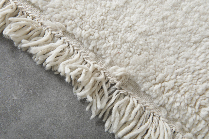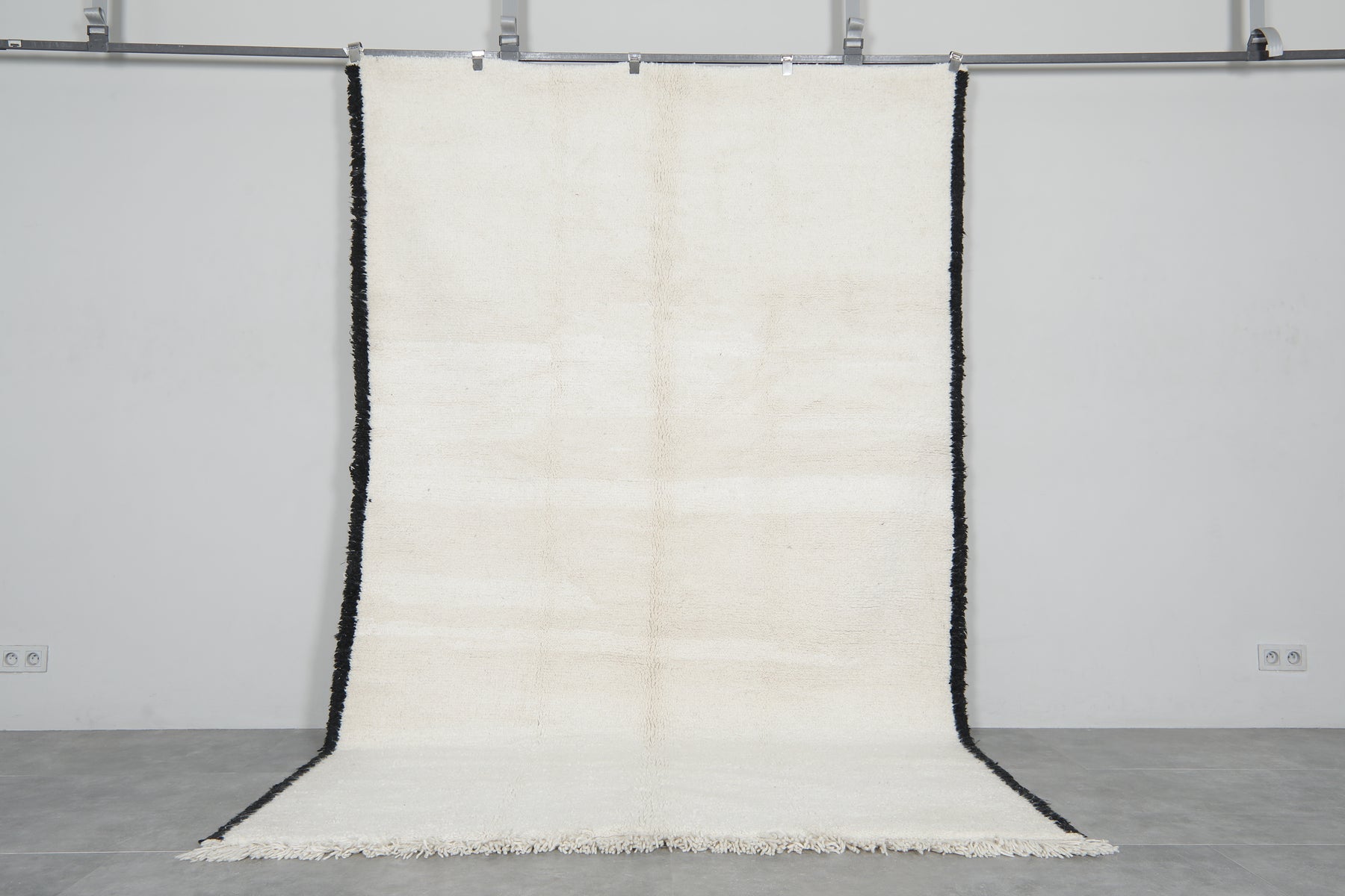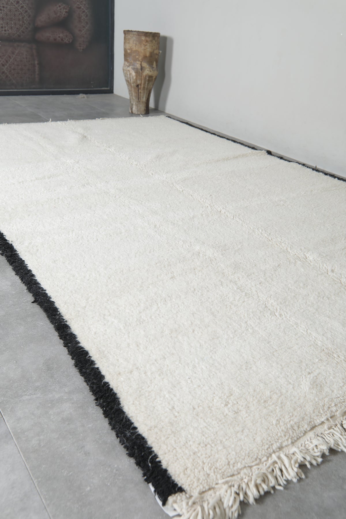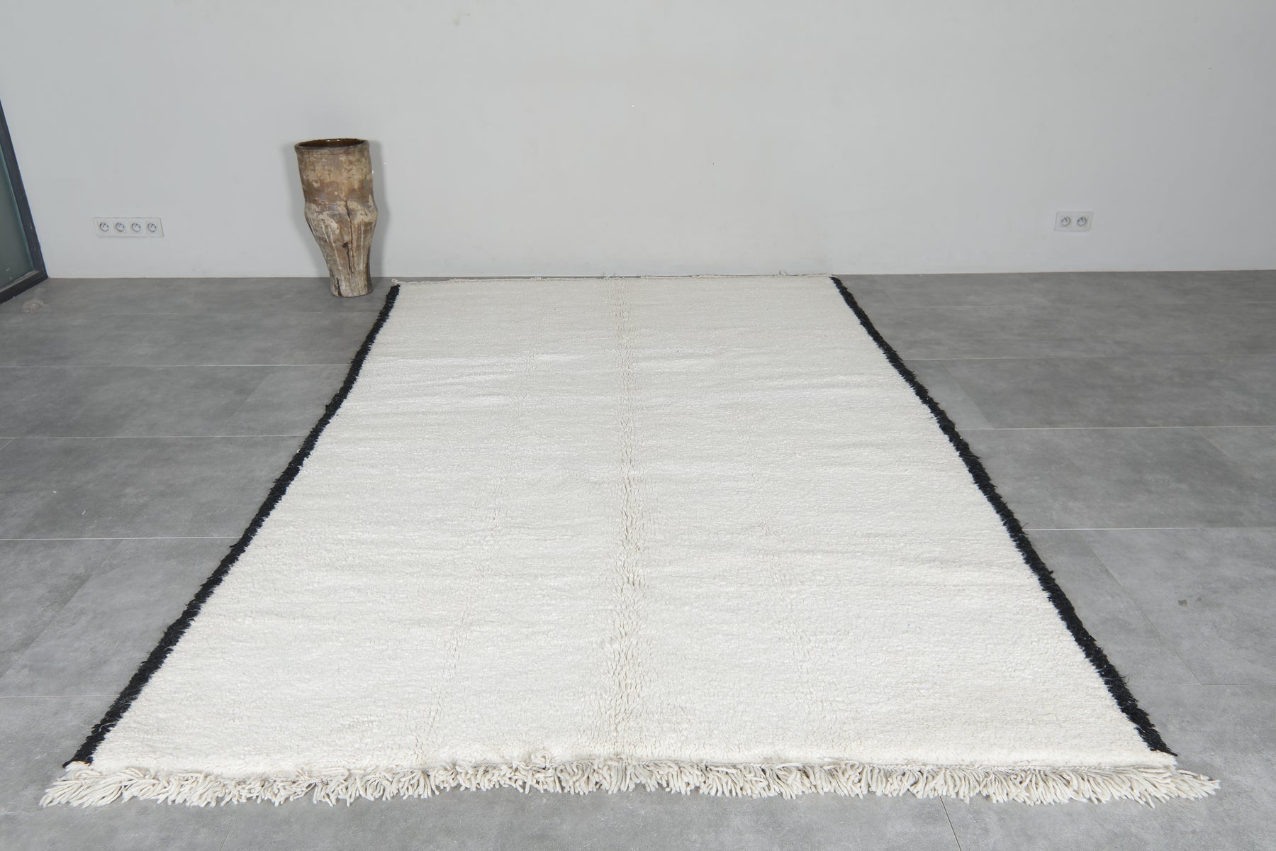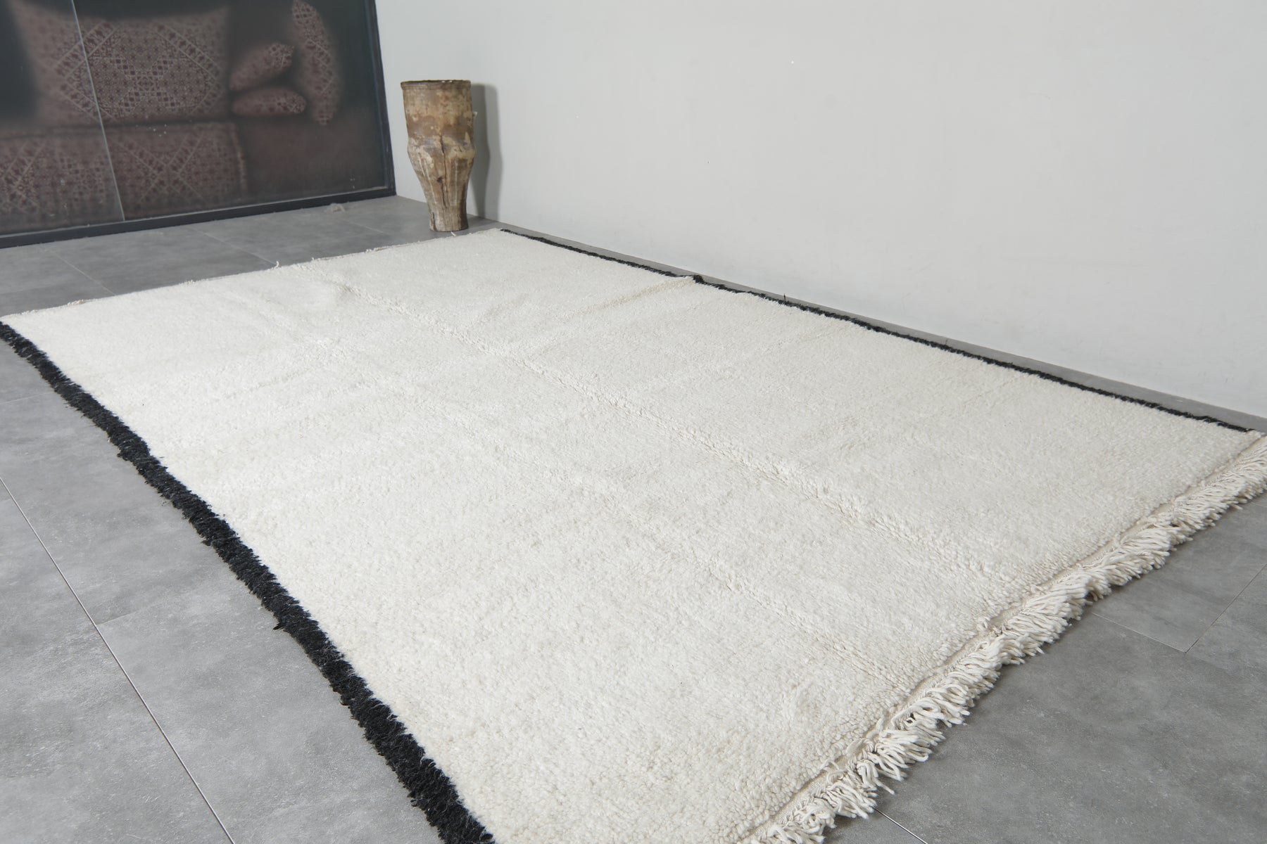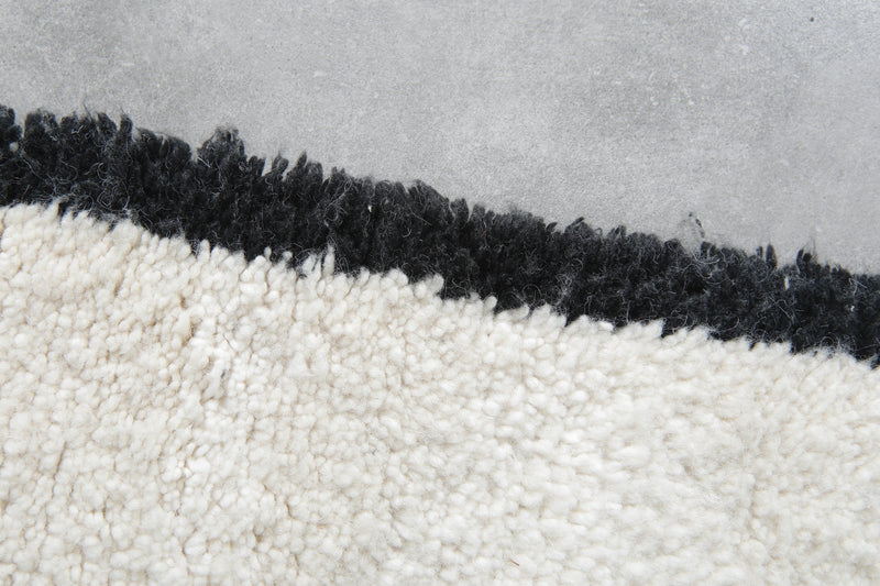 Bring minimalist elegance to your space with this Handmade Moroccan rug, measuring 6.4 FT x 9.9 FT. Expertly crafted from 100% natural wool, this luxurious piece features a sleek, modern design with bold black edging against a soft, neutral background. Its refined aesthetic and plush texture make it a timeless addition to any interior.