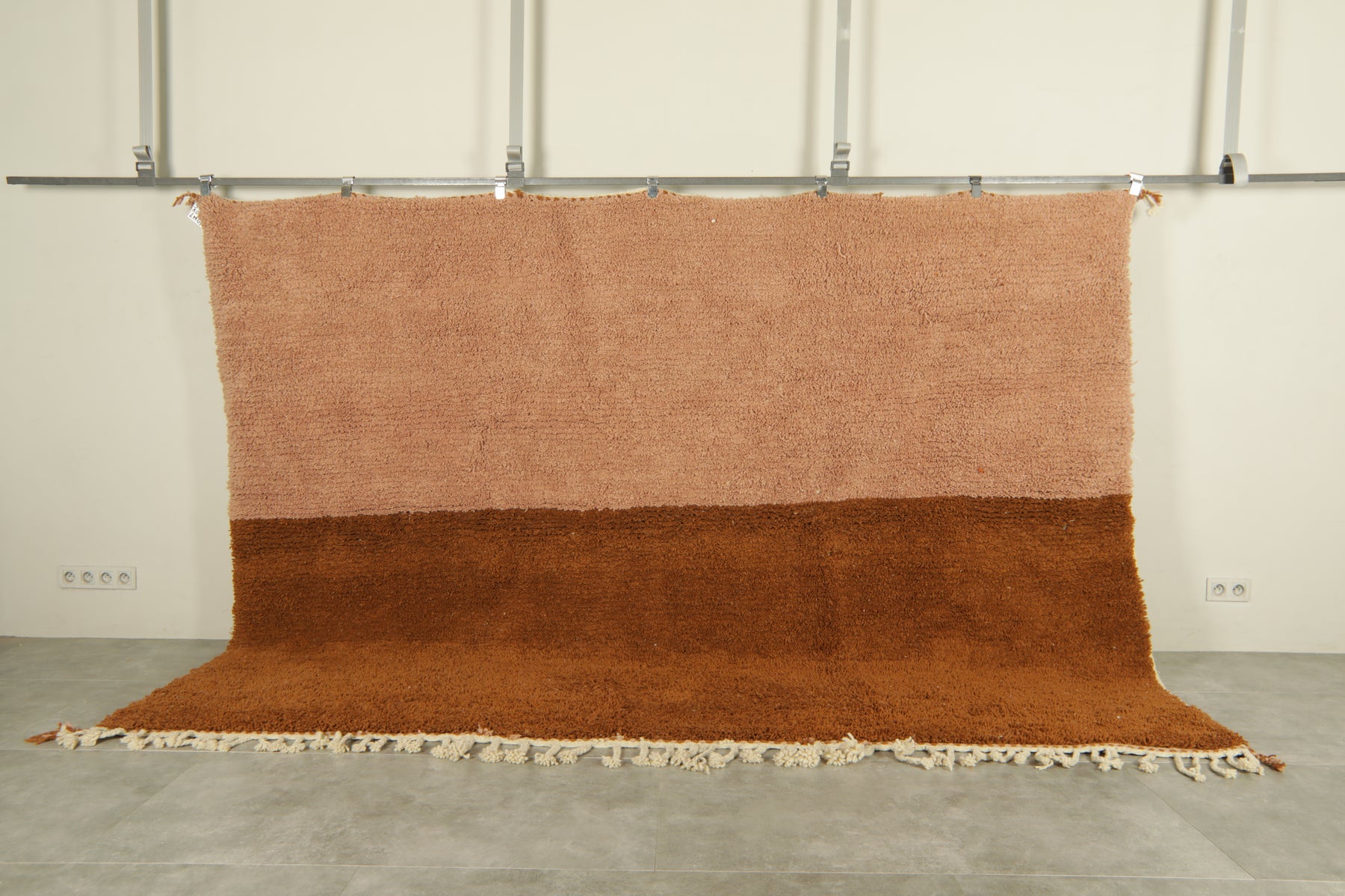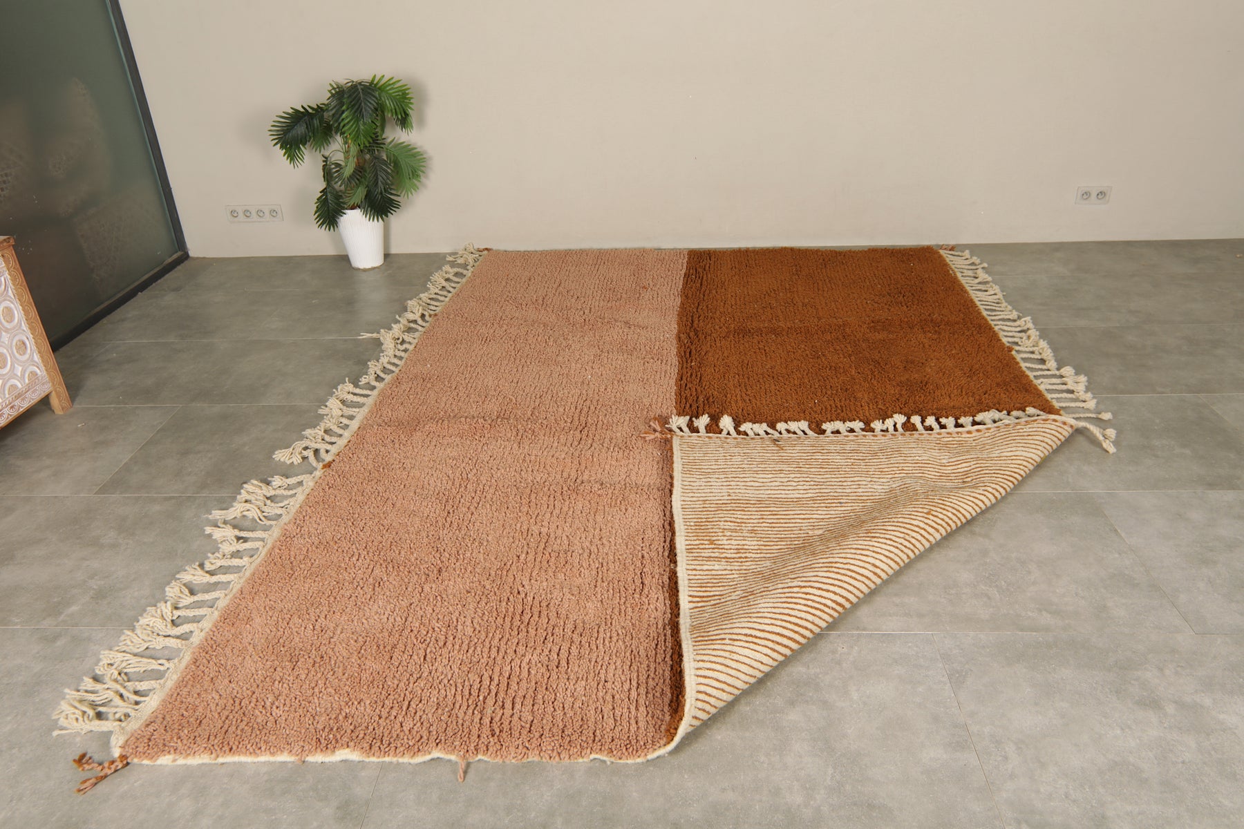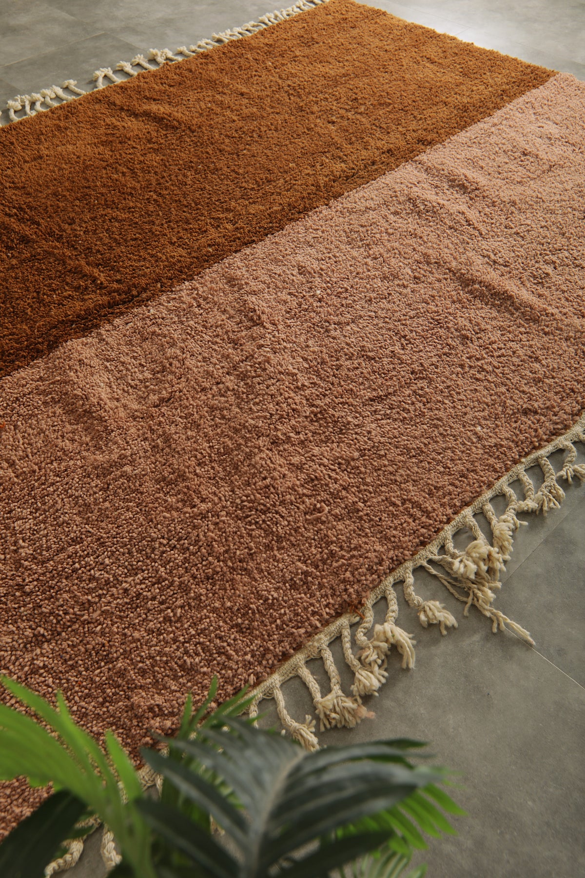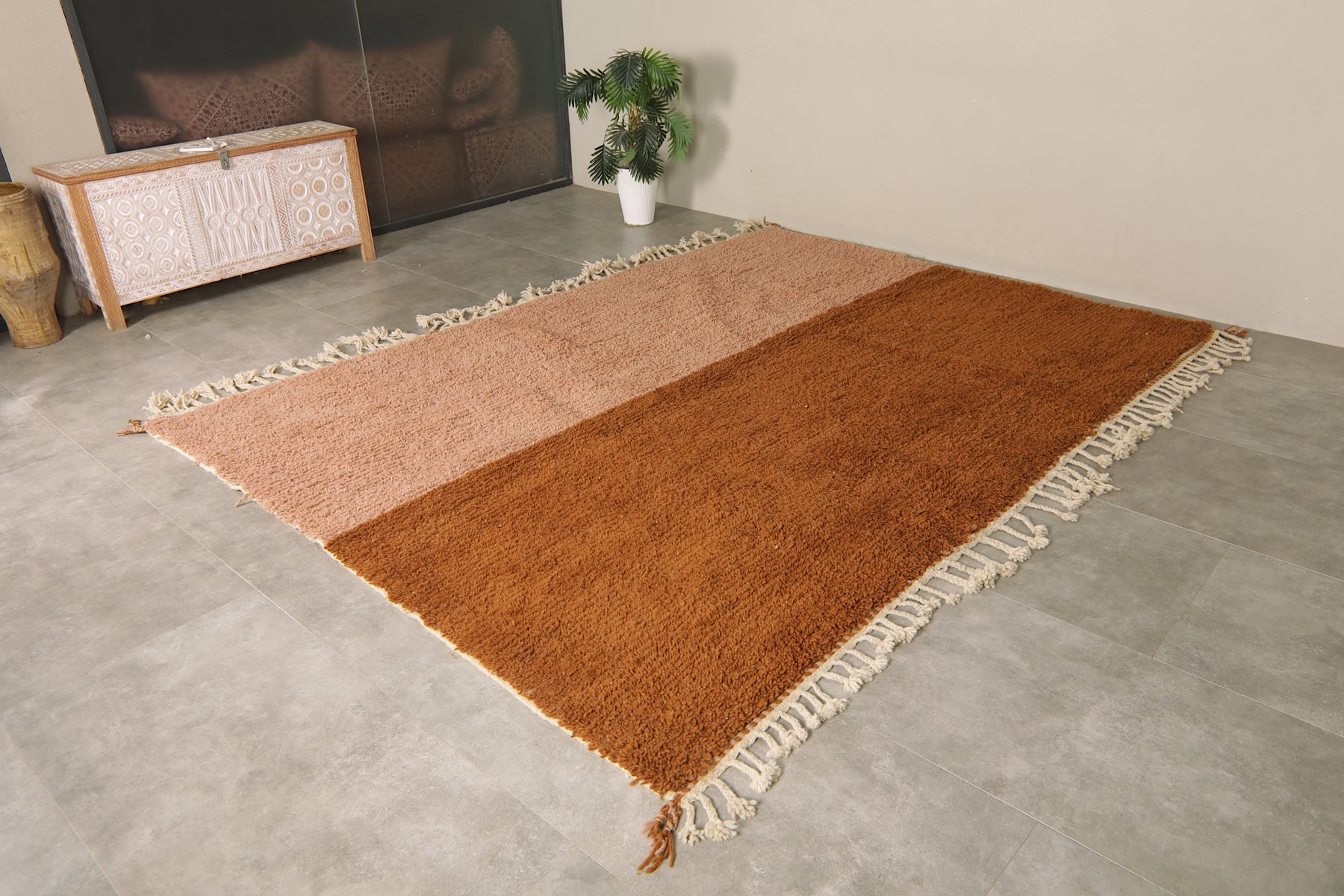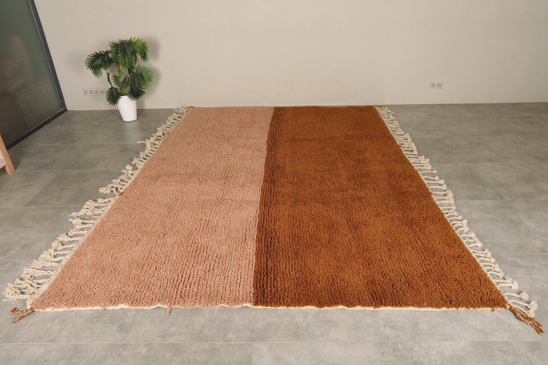Add warmth and elegance to your space with this handcrafted Moroccan rug featuring a unique peach and brown two-tone color block design. Made from 100% wool, this high-pile rug offers a soft texture and modern minimalist style perfect for boho, rustic, or contemporary interiors. The subtle fringe detailing adds a traditional Berber touch. Ideal as a statement piece in living rooms, bedrooms, or creative spaces. Ethically handmade by Moroccan artisans.