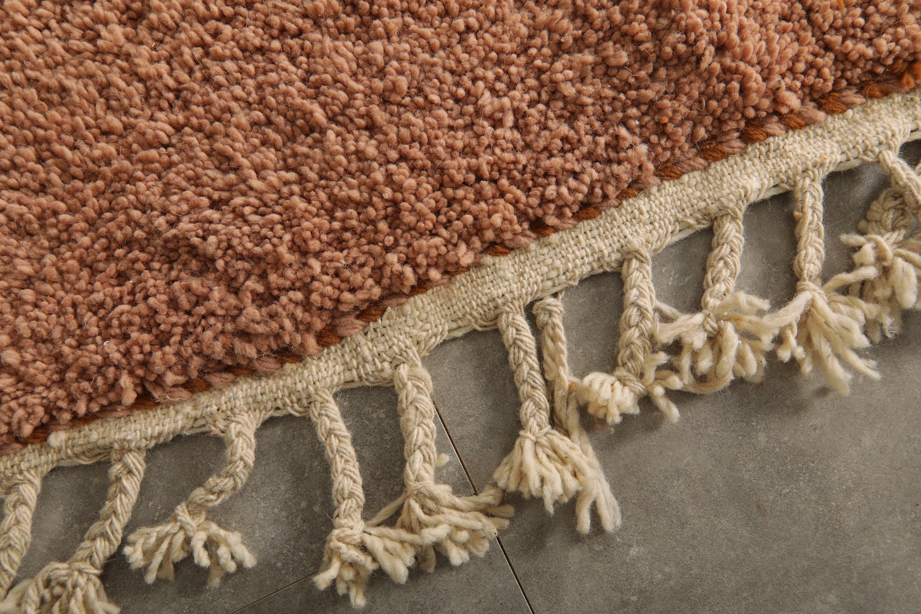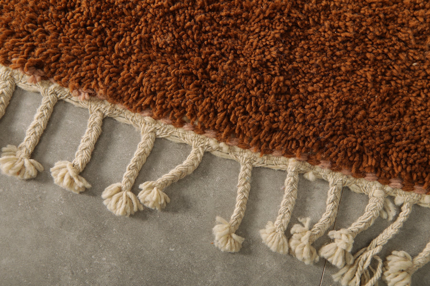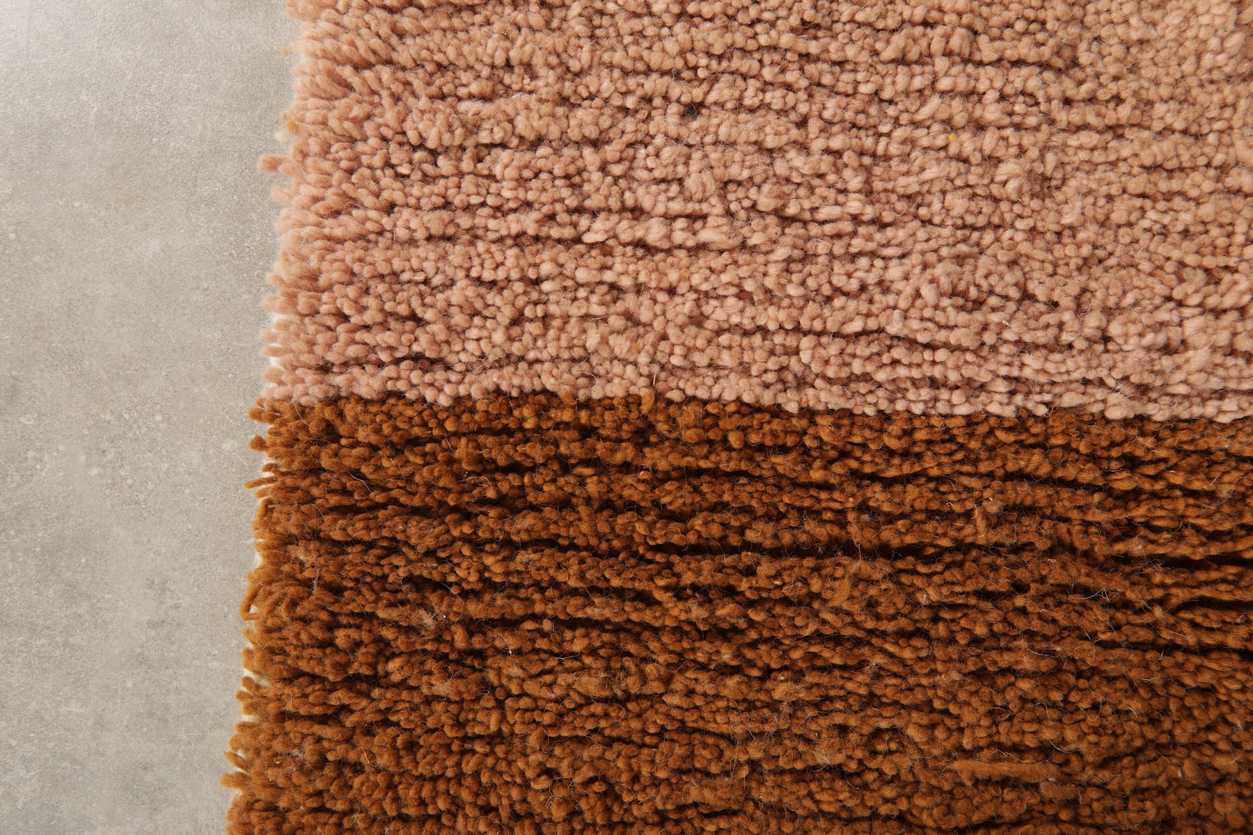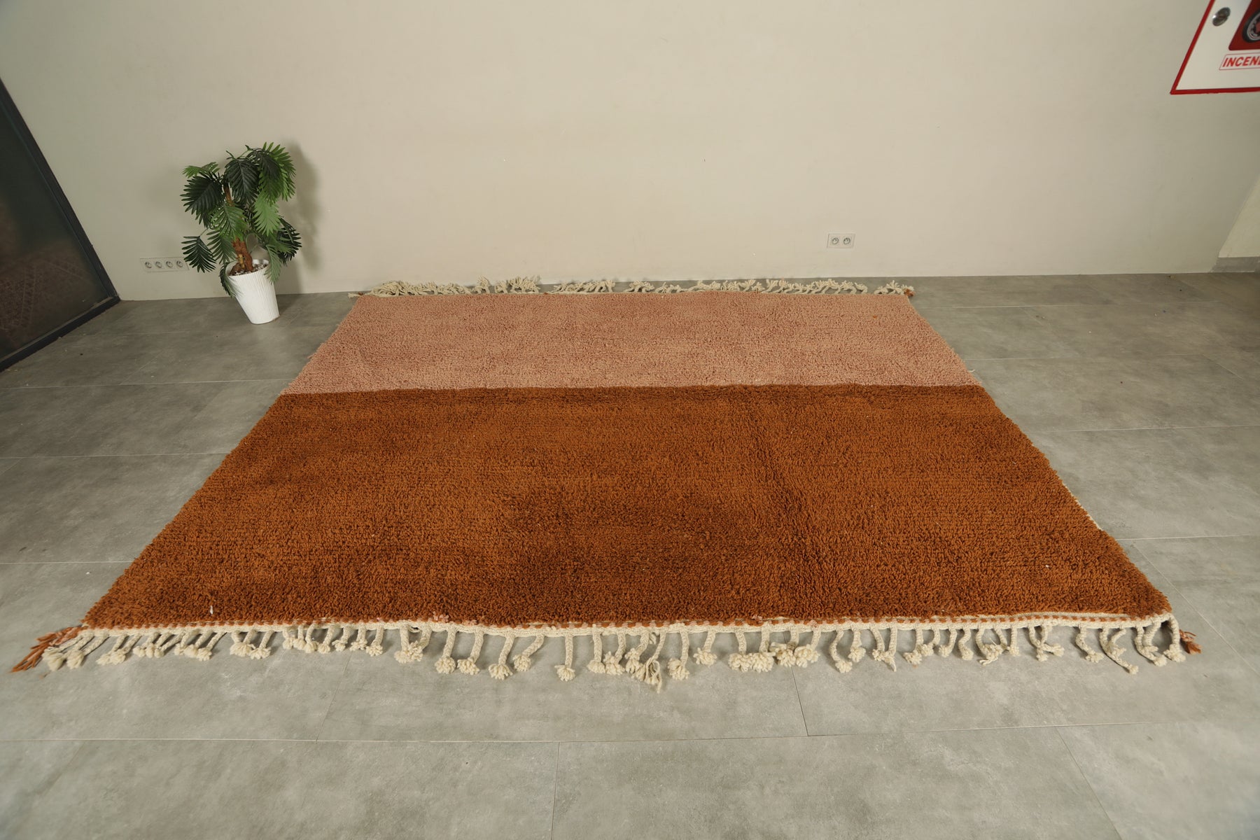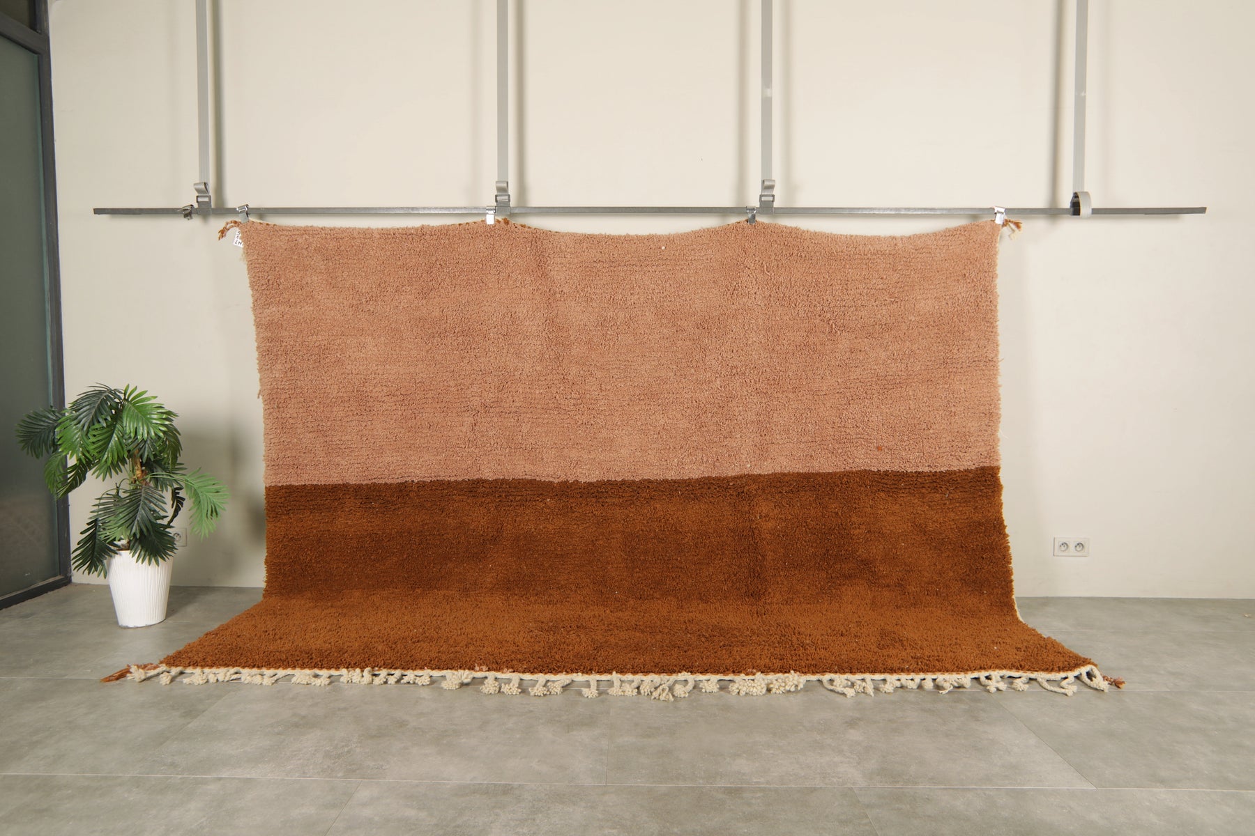 Add warmth and elegance to your space with this handcrafted Moroccan rug featuring a unique peach and brown two-tone color block design. Made from 100% wool, this high-pile rug offers a soft texture and modern minimalist style perfect for boho, rustic, or contemporary interiors. The subtle fringe detailing adds a traditional Berber touch. Ideal as a statement piece in living rooms, bedrooms, or creative spaces. Ethically handmade by Moroccan artisans.